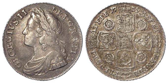 Shilling 1739 roses, smaller garter star, S.3701, VF, a touch of adhesive residue rev.