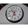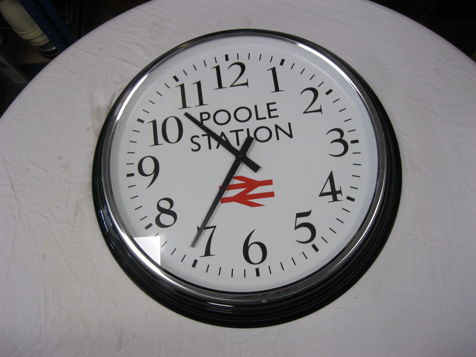 A large retro-style Railway clock marked for Poole Station with the BR motif under.