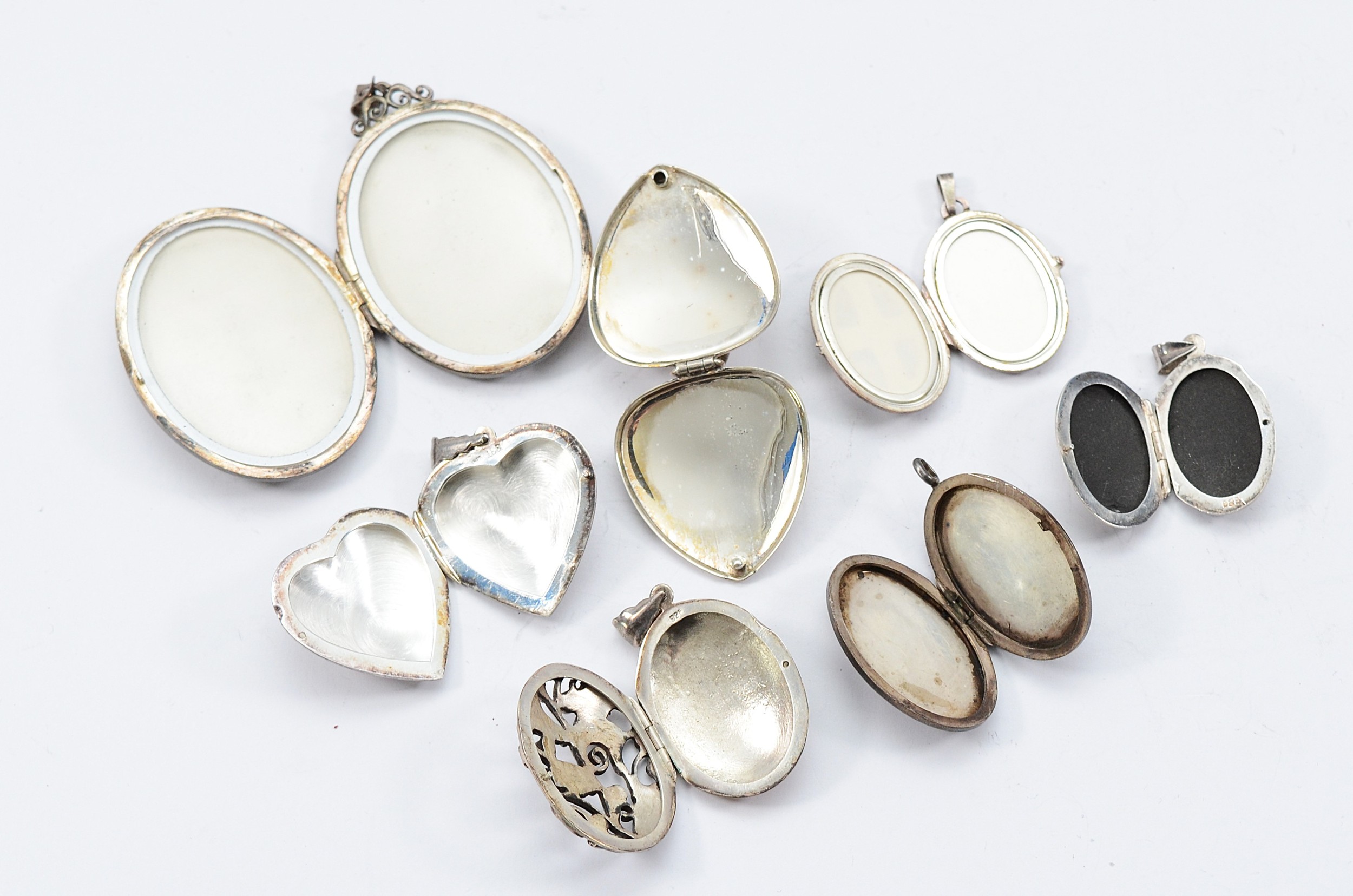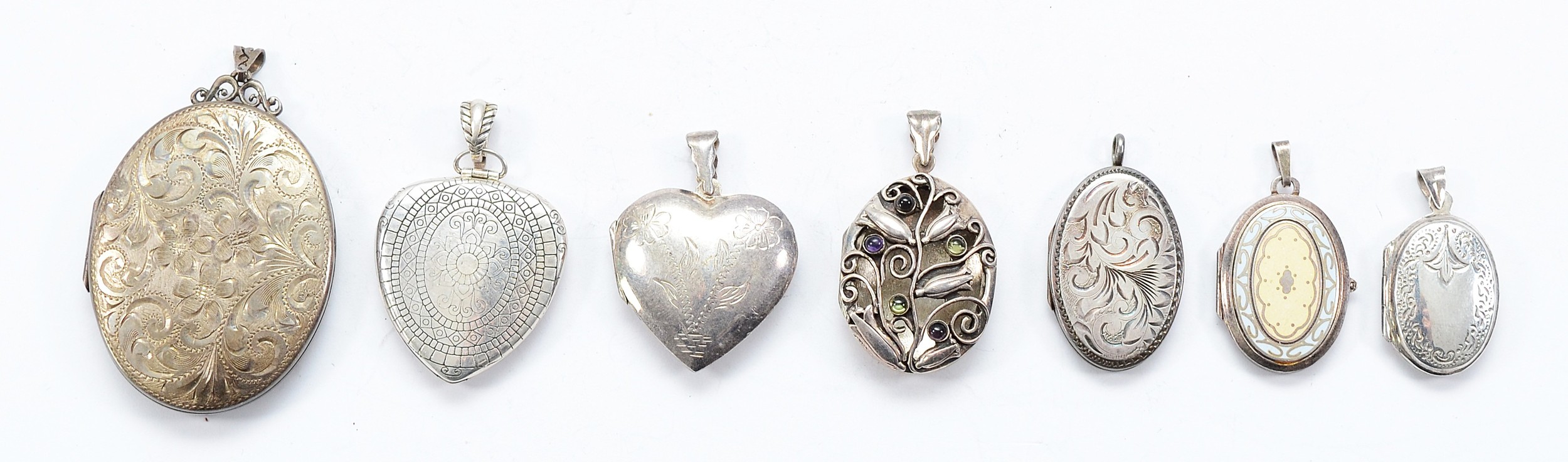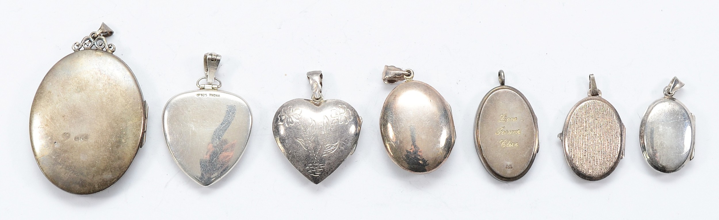 A silver locket pendant, London 1975, a silver locket pendant, Birmingham 1980, with five 925 silver locket pendants, 85g