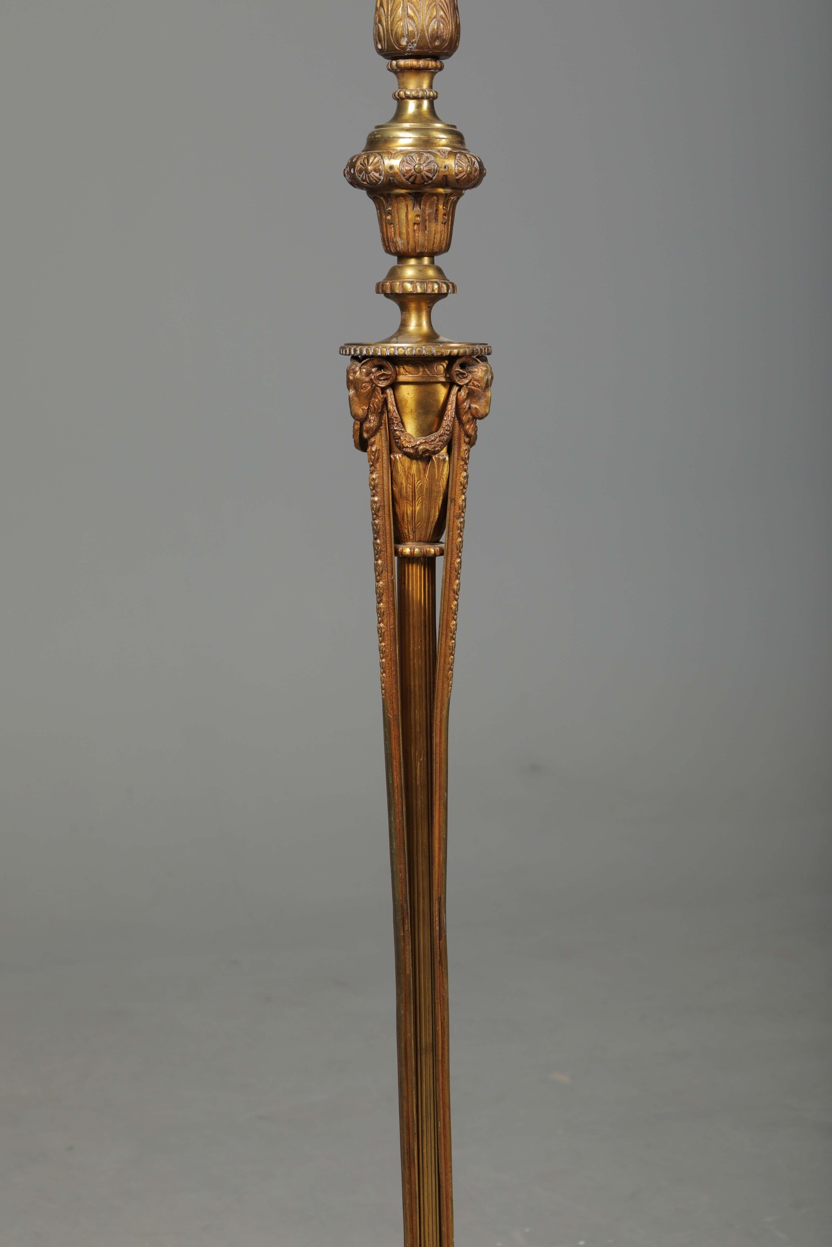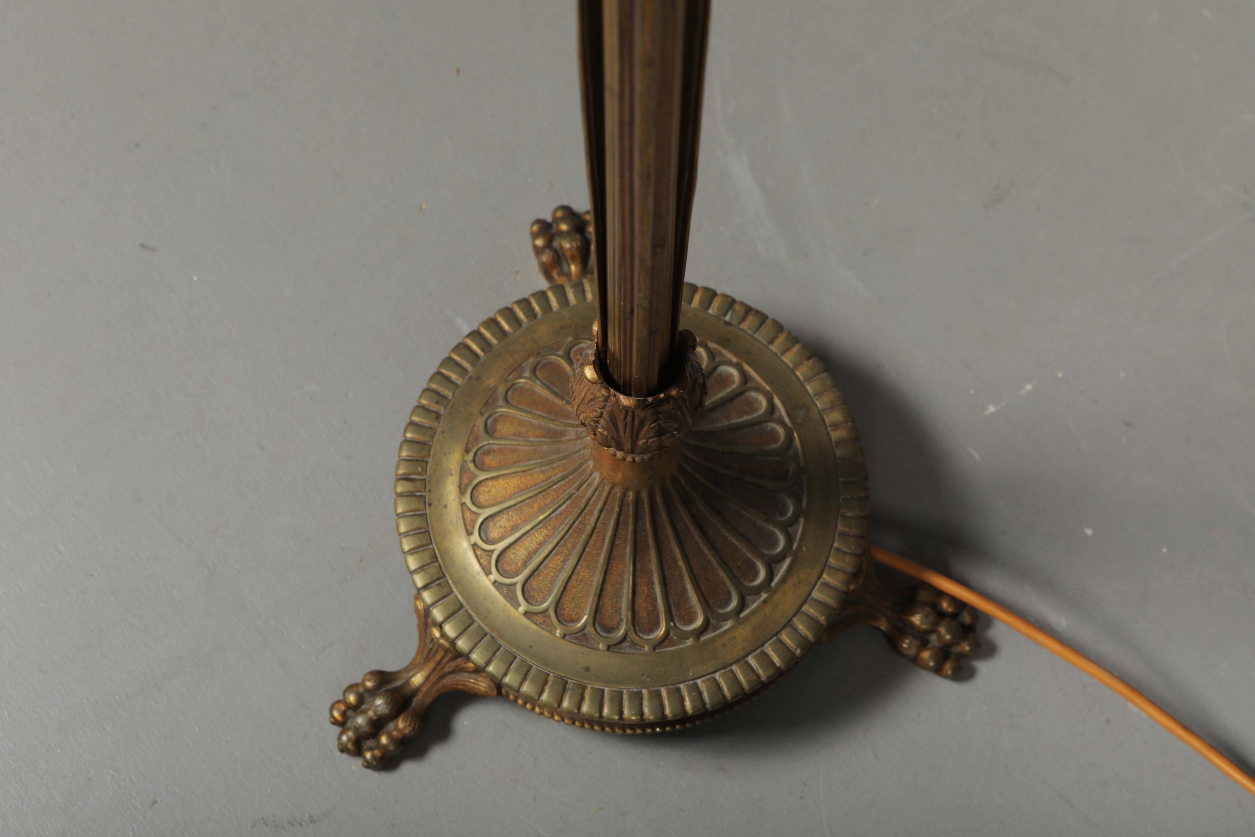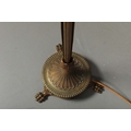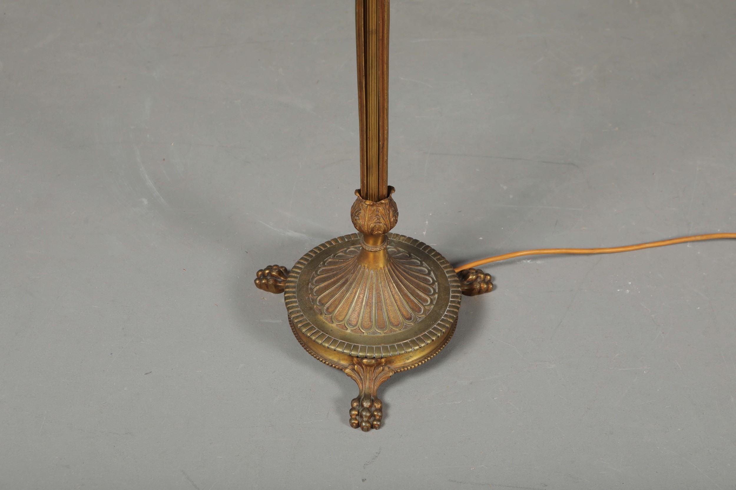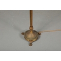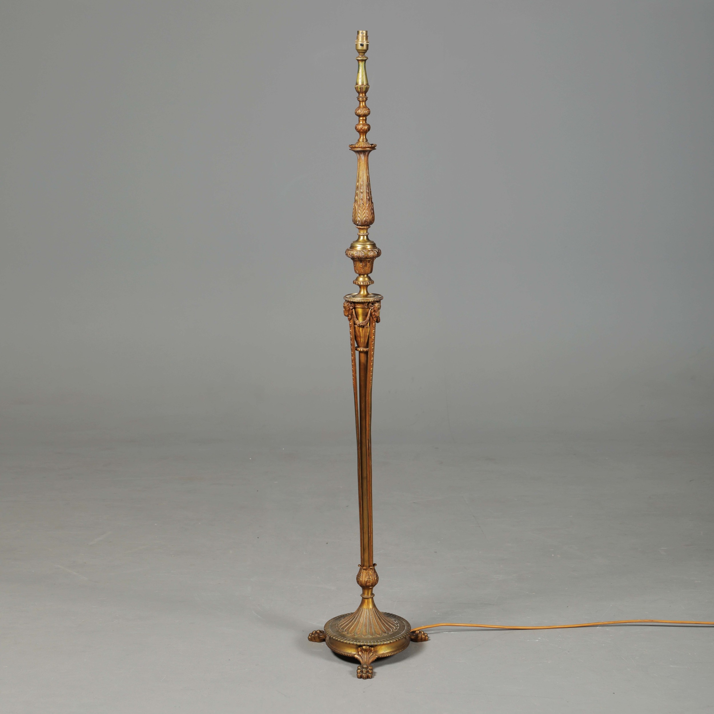 BRASS STANDARD LAMP. with swag detail and three paw supports 155cm t.