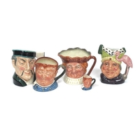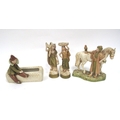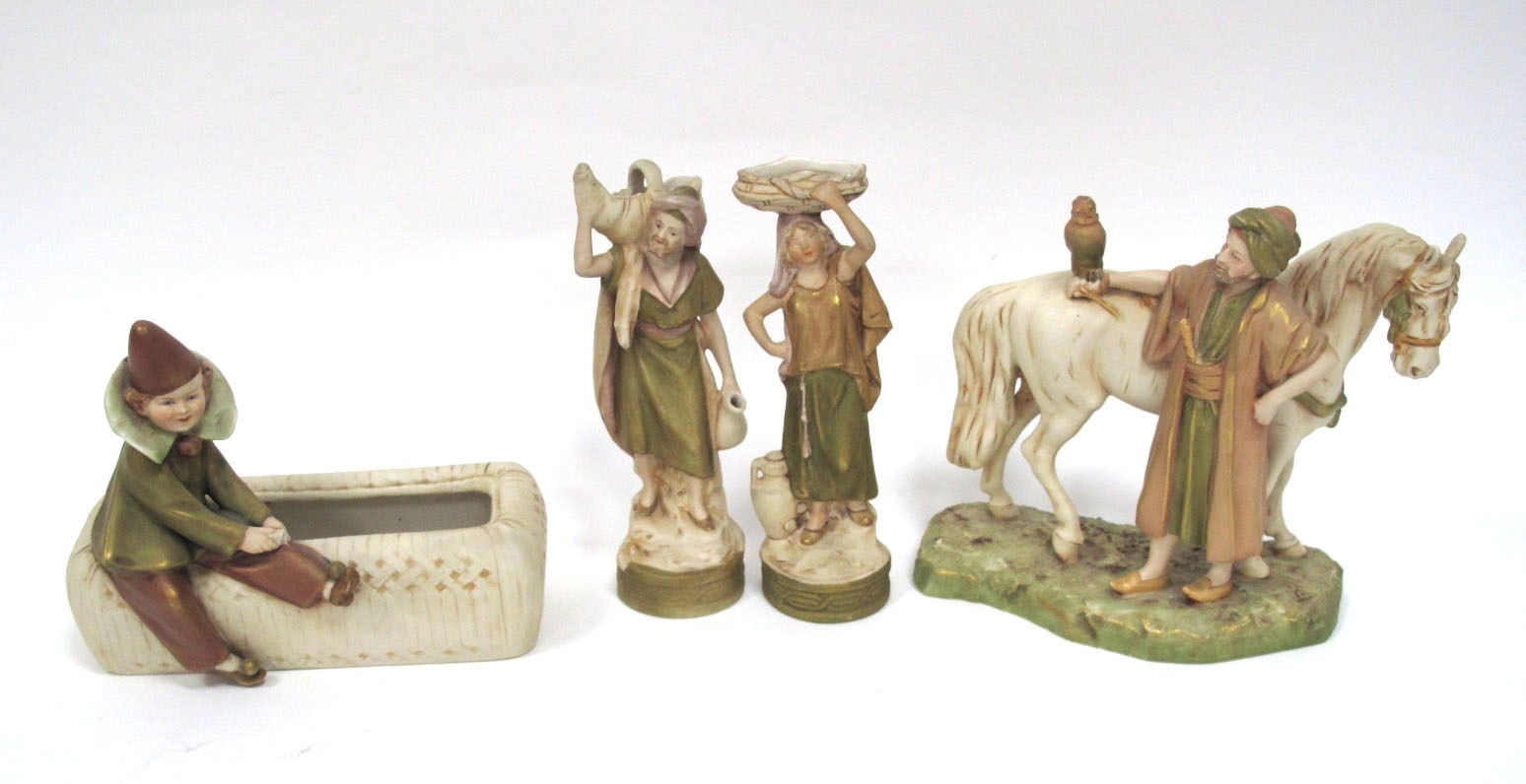 A Royal Dux Pottery Model of an Arab Gentleman Standing beside a Horse and a Bird of Prey, pink triangle mark, 18cm high, a Royal Dux Model of a child in pierrot costume beside a trough, and a pair of figures with baskets, 18cm high. (4)