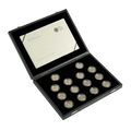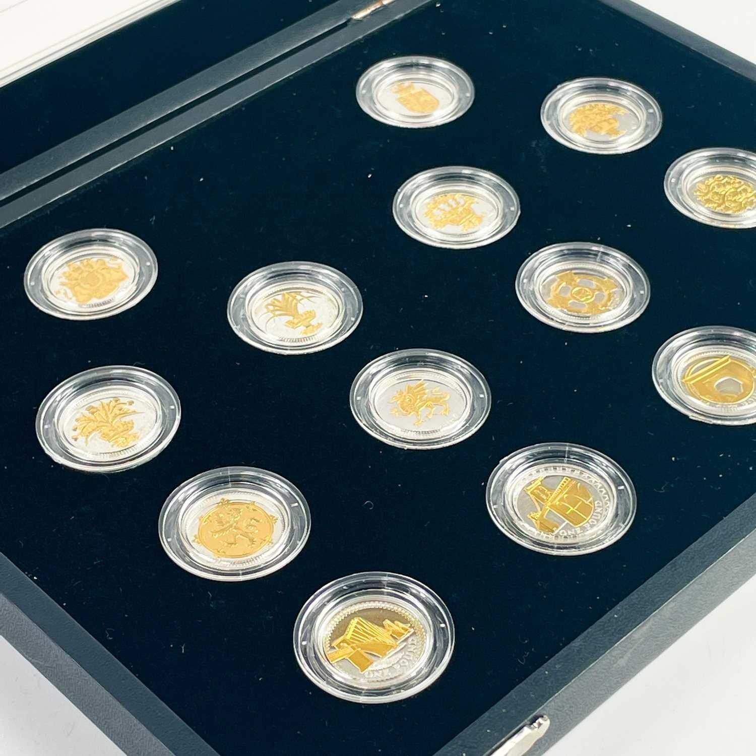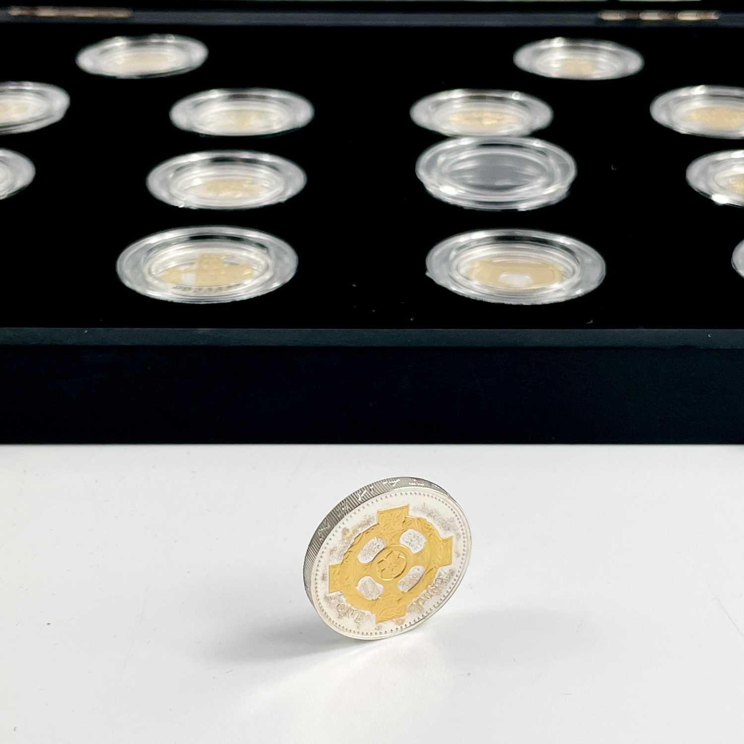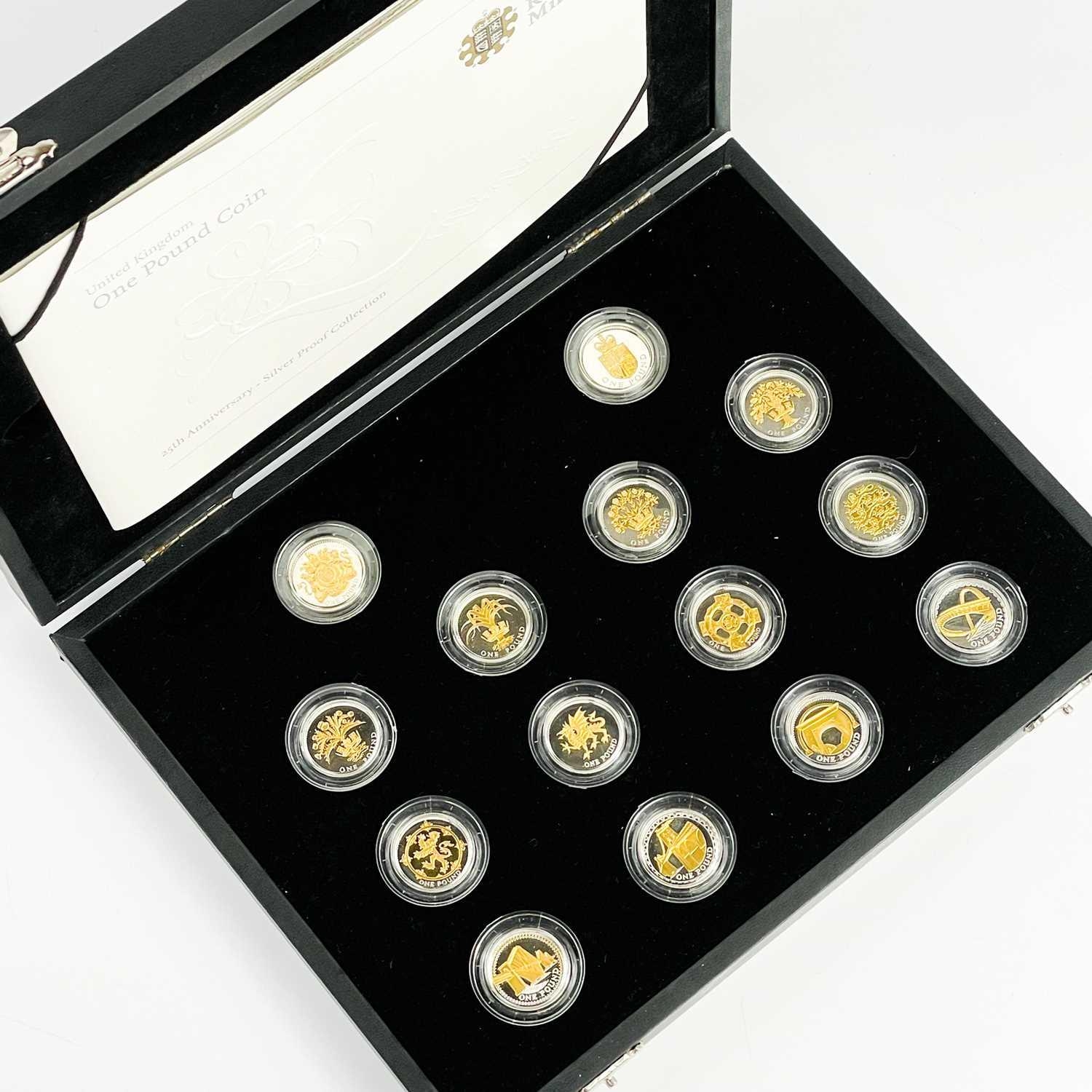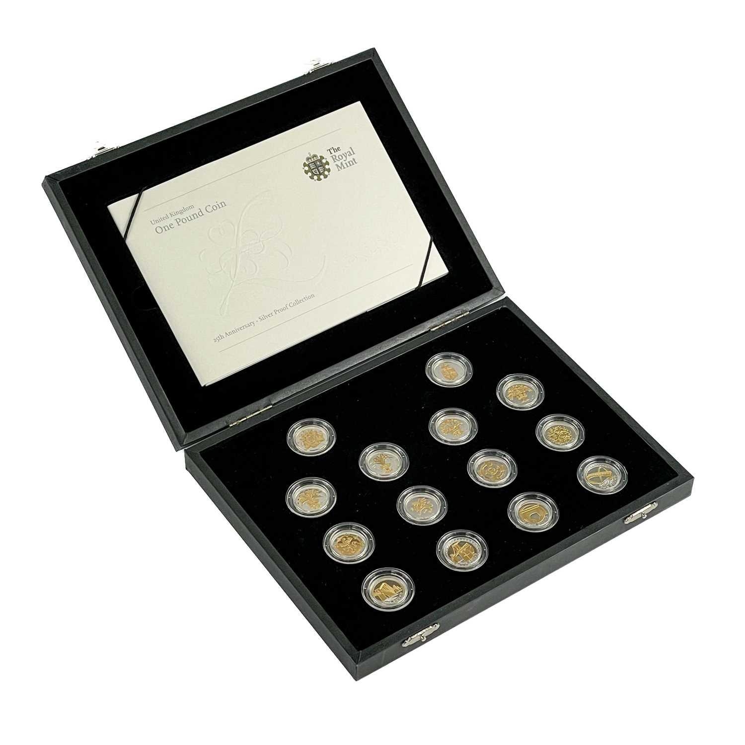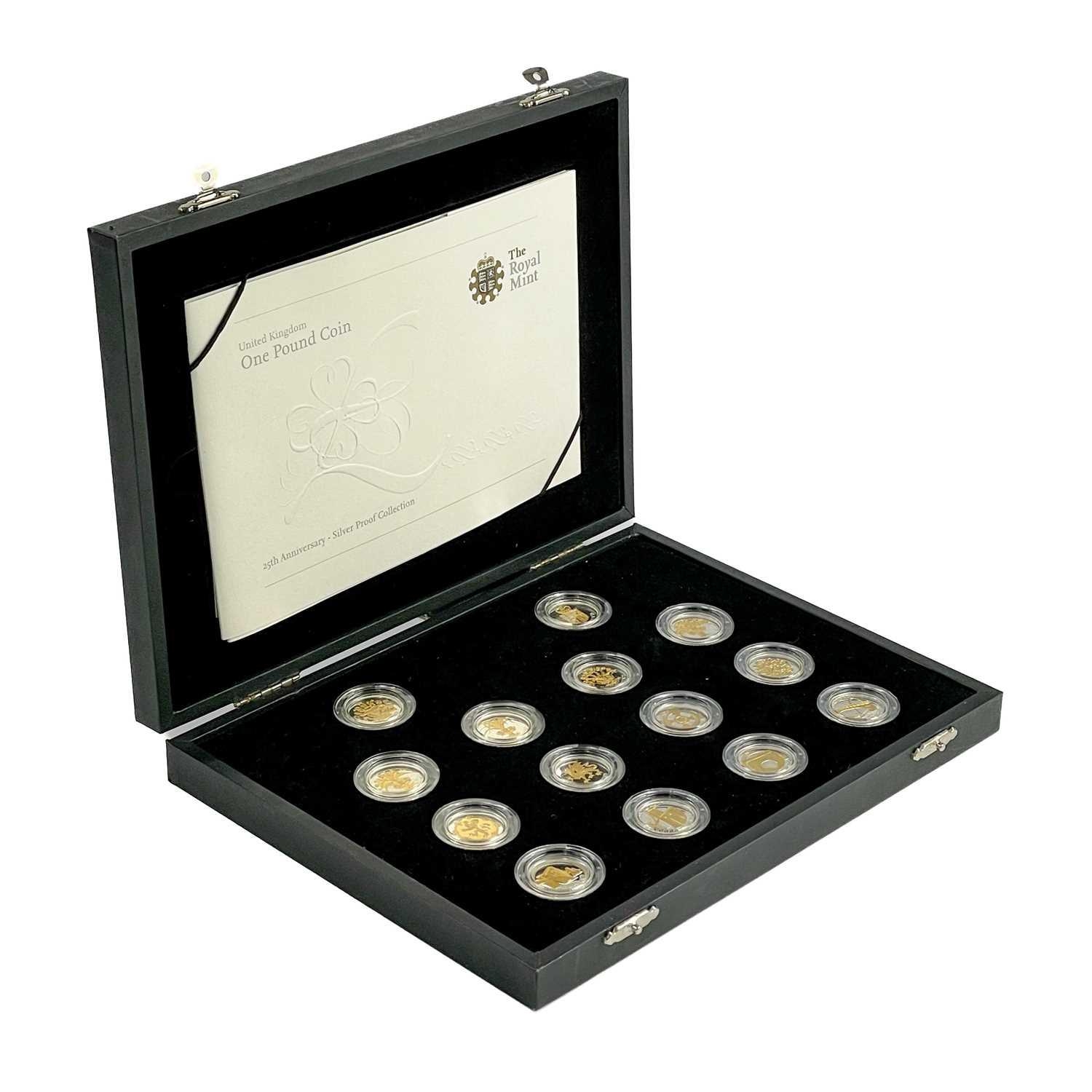 UK Silver Proof £1 Coins 1983-2008 "25th Anniversary Collection" A beautiful silver proof set with gold plating on each of the 14 coins depicting the various designs over the 25 year period. Complete with Royal Mint booklet & Certificate of Authenticity.