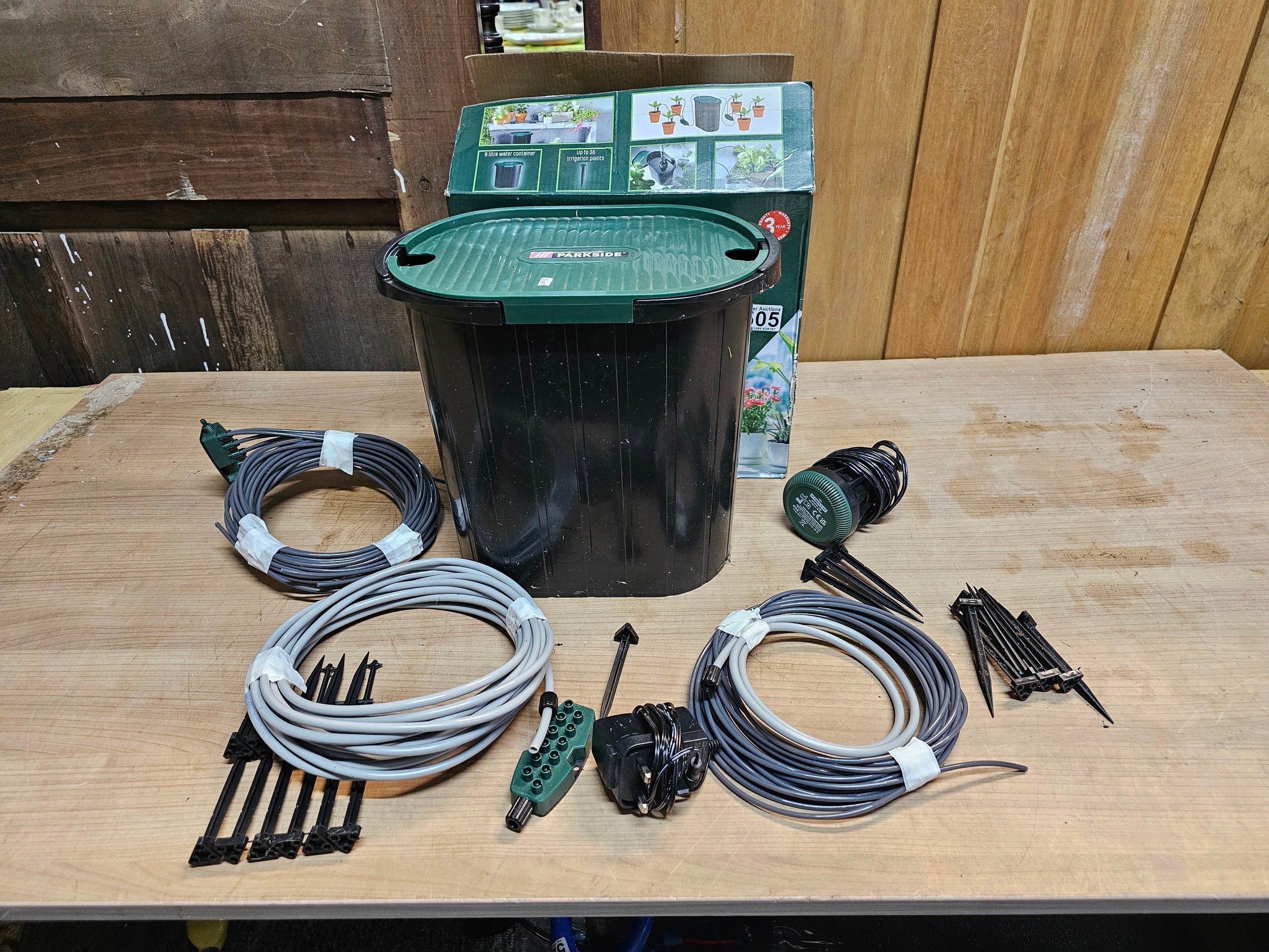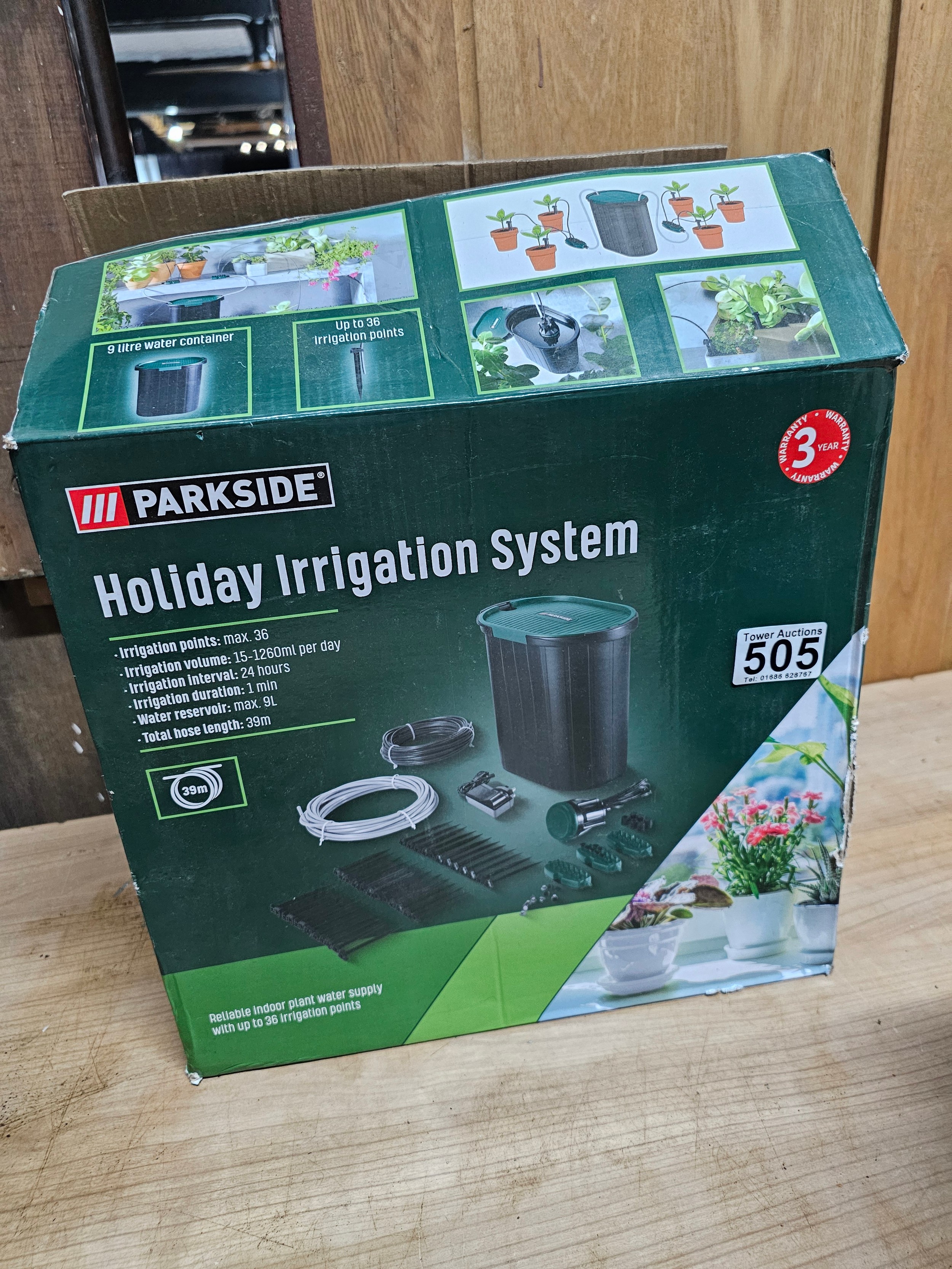 As new Parkside Holiday Irrigation System for supplying your indoor plants with water with upto 36 irrigation points, daily watering of 1 minute compete with all accessories and 39m hose and has a 9L capacity