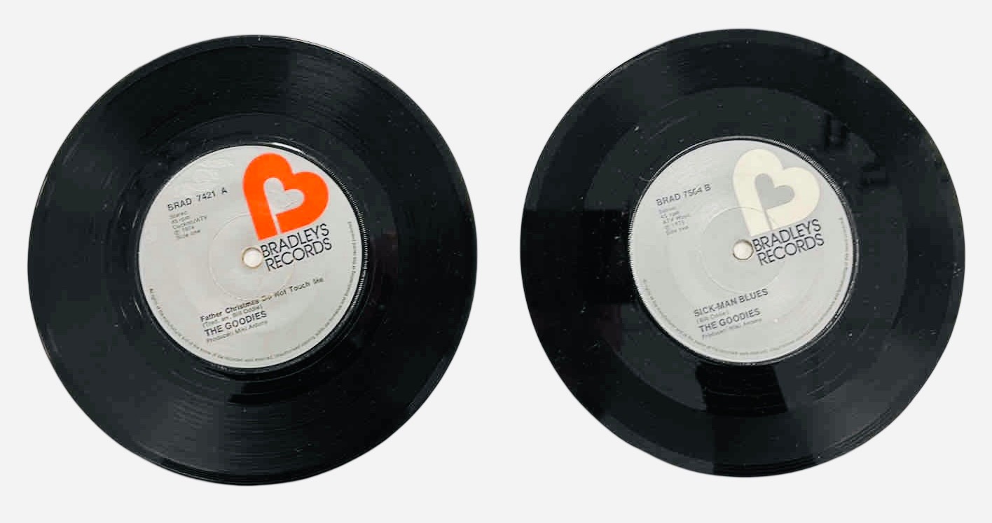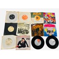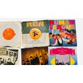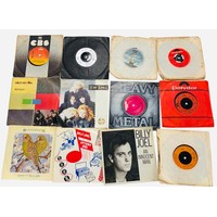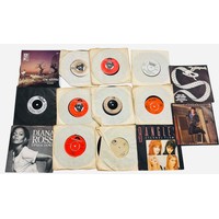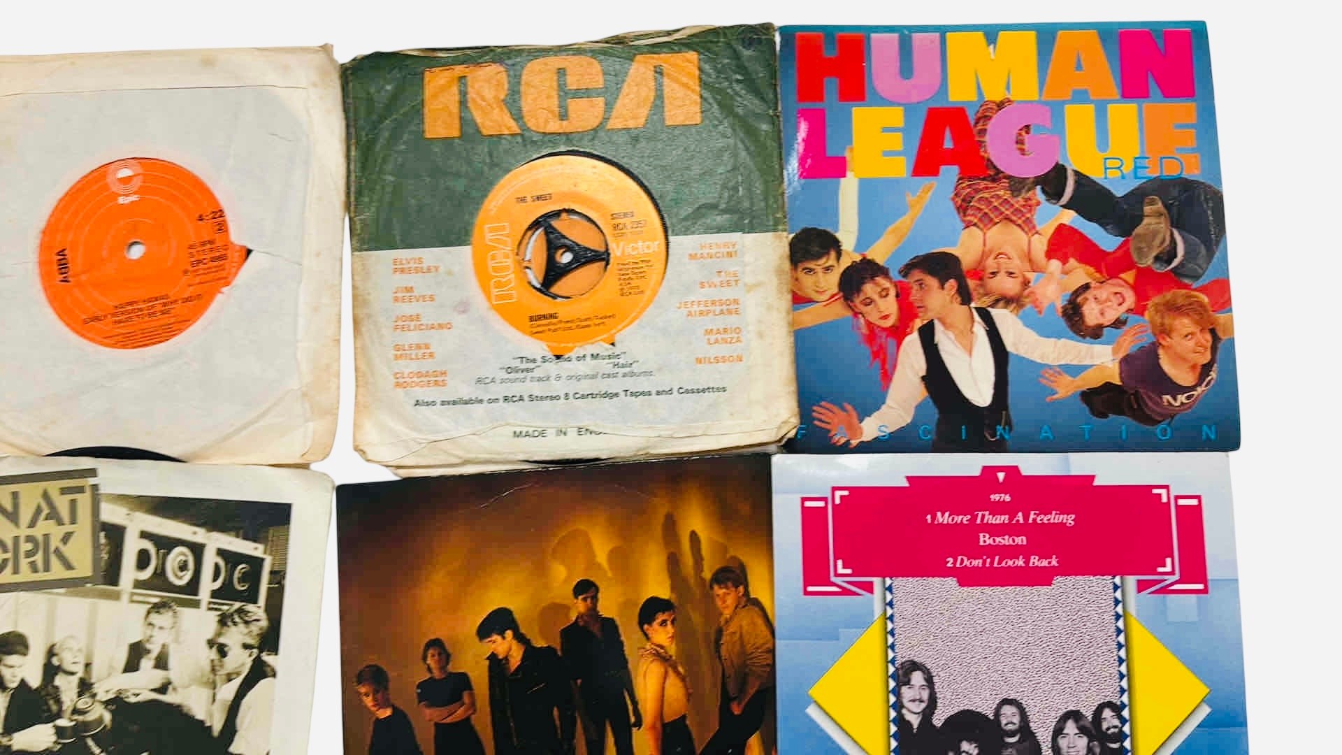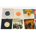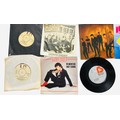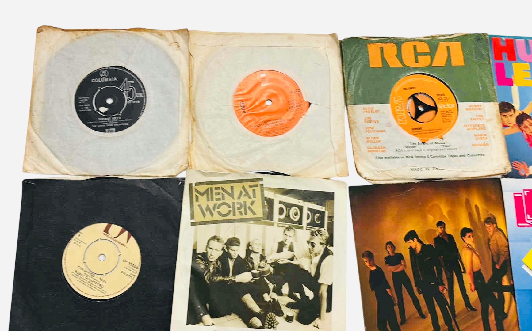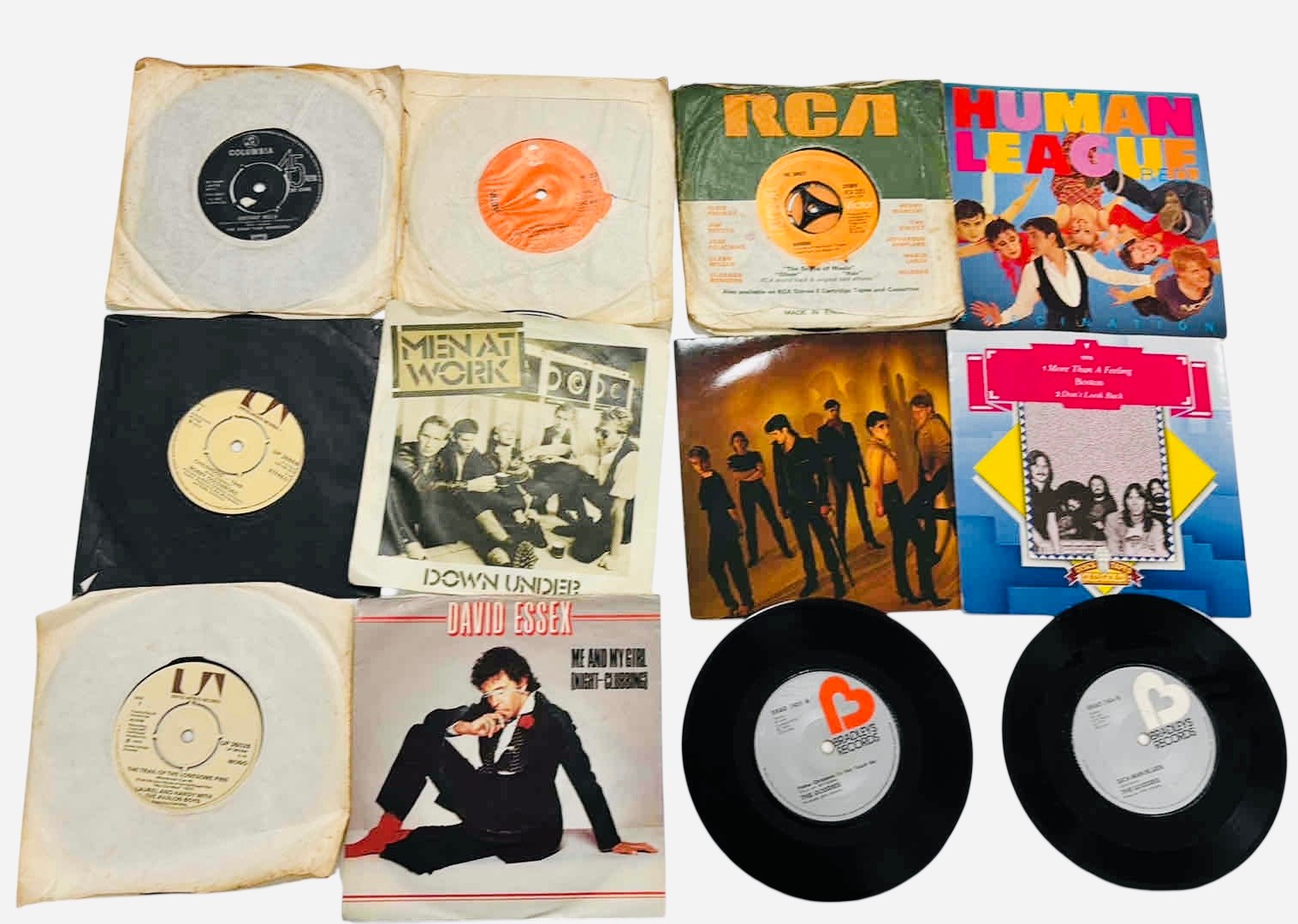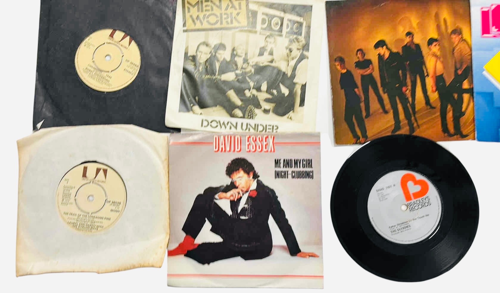 A group of 7in vinyl singles, including David Essex, Men at Work, The Goodies (Bradley’s Records), ABBA, and Human League, with assorted picture sleeves and company sleeves.