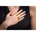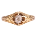 An early 20th-century diamond-set ring, with an old-cut diamond measuring approximately 4.8mm x 4.2mm x 3.5mm, claw-set in a six-prong setting, with a cut-out surround of floral design, leading to tapered shoulders with scroll detailing, in an 18ct yellow gold mount, size T, 3.8 grams.
