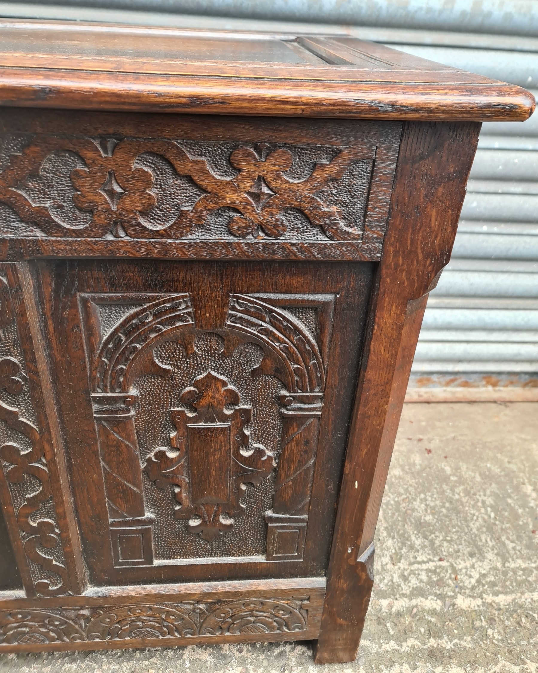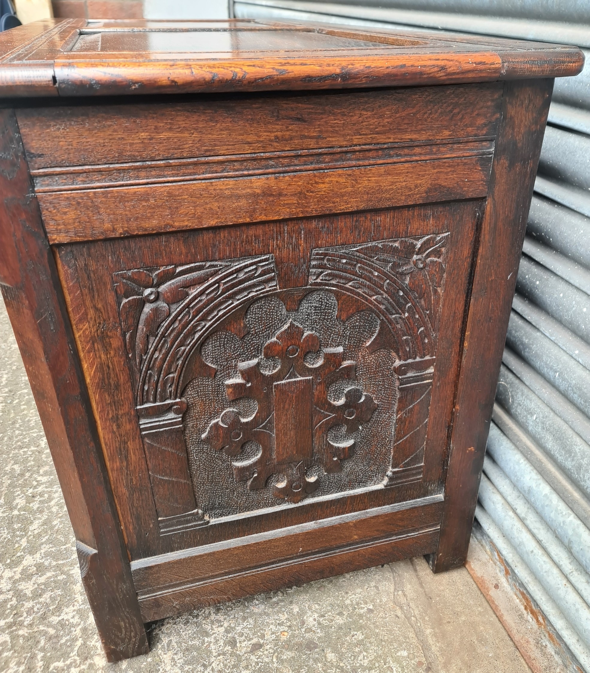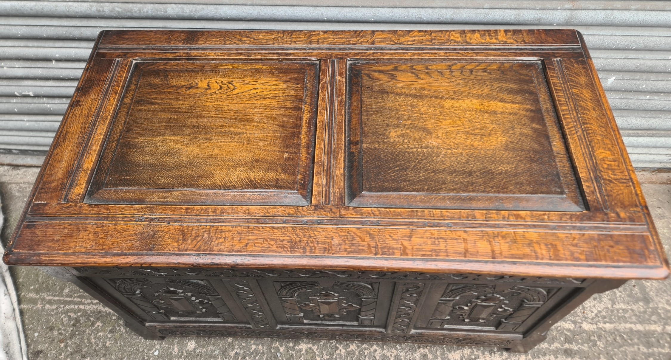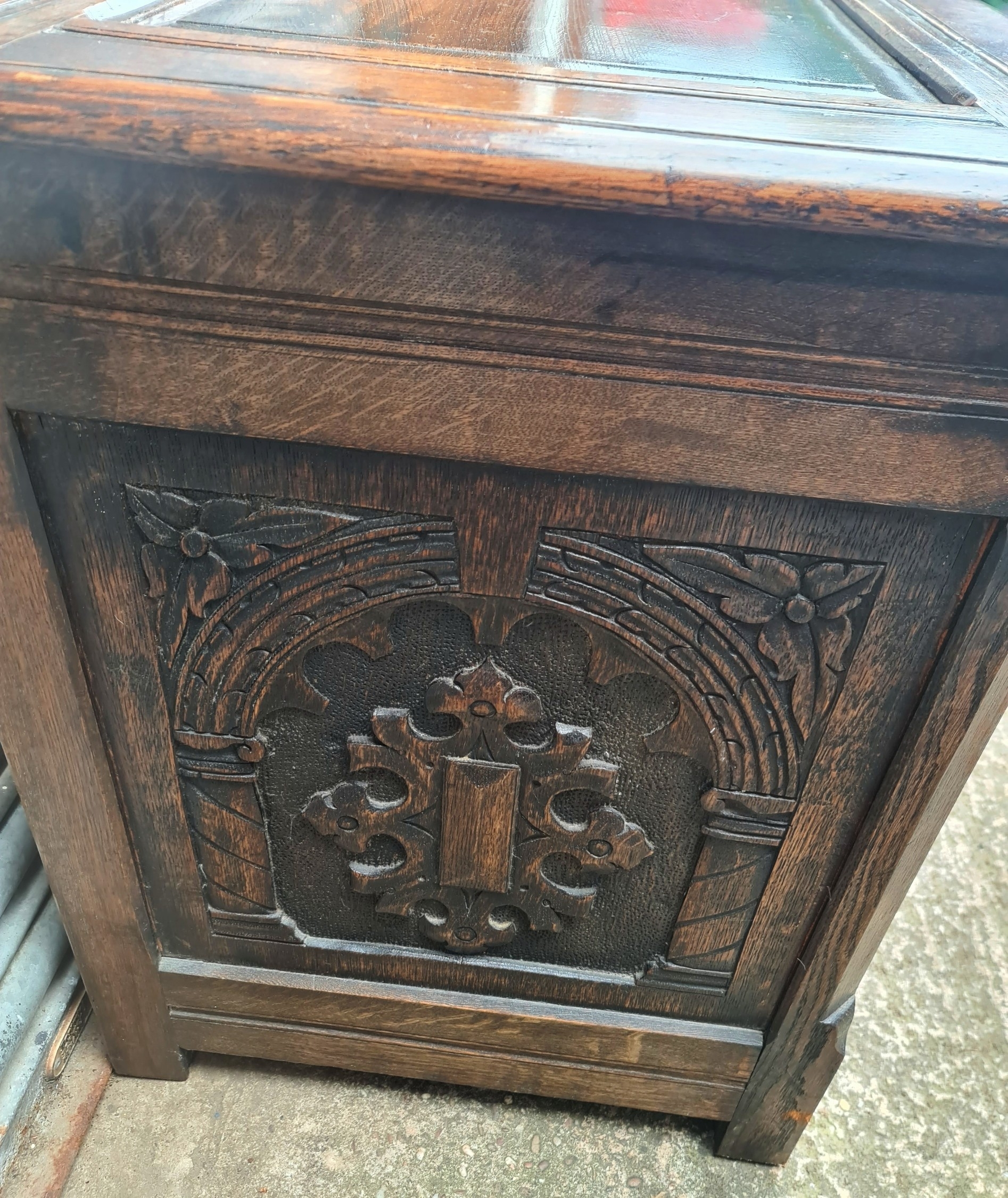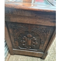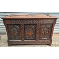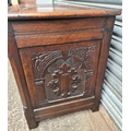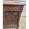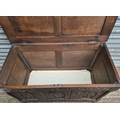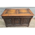 Antique Oak Coffer with Carved Panels and Front Sides. Measures 105cm by 54cm by 66cm. Shipping is available. Please ask for a quote before bidding. Where possible we combine shipping costs. Remember, if you are the highest bidder above reserve on this Lot you have bought the item and are legally responsible for the item. Viewing is recommended in either person or via video link. Contact us to arrange.