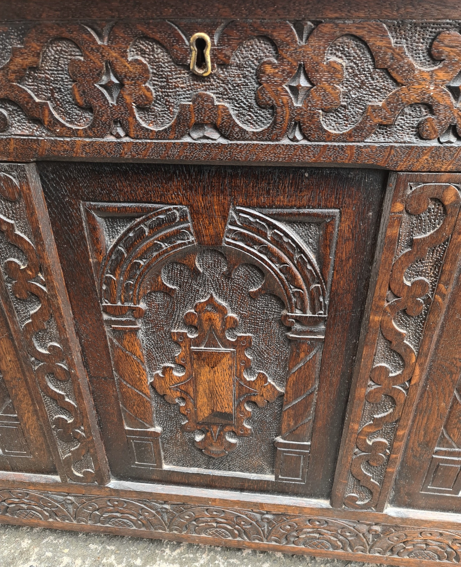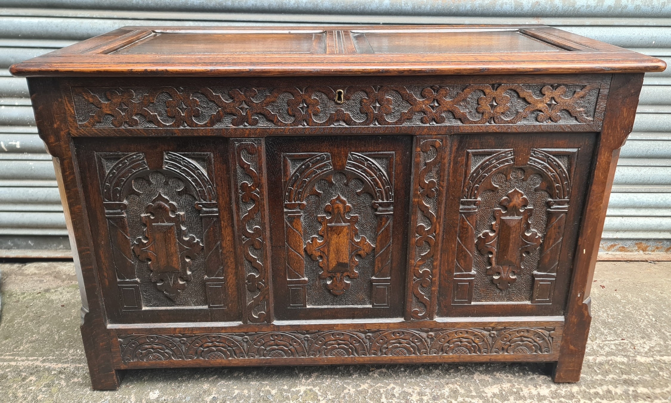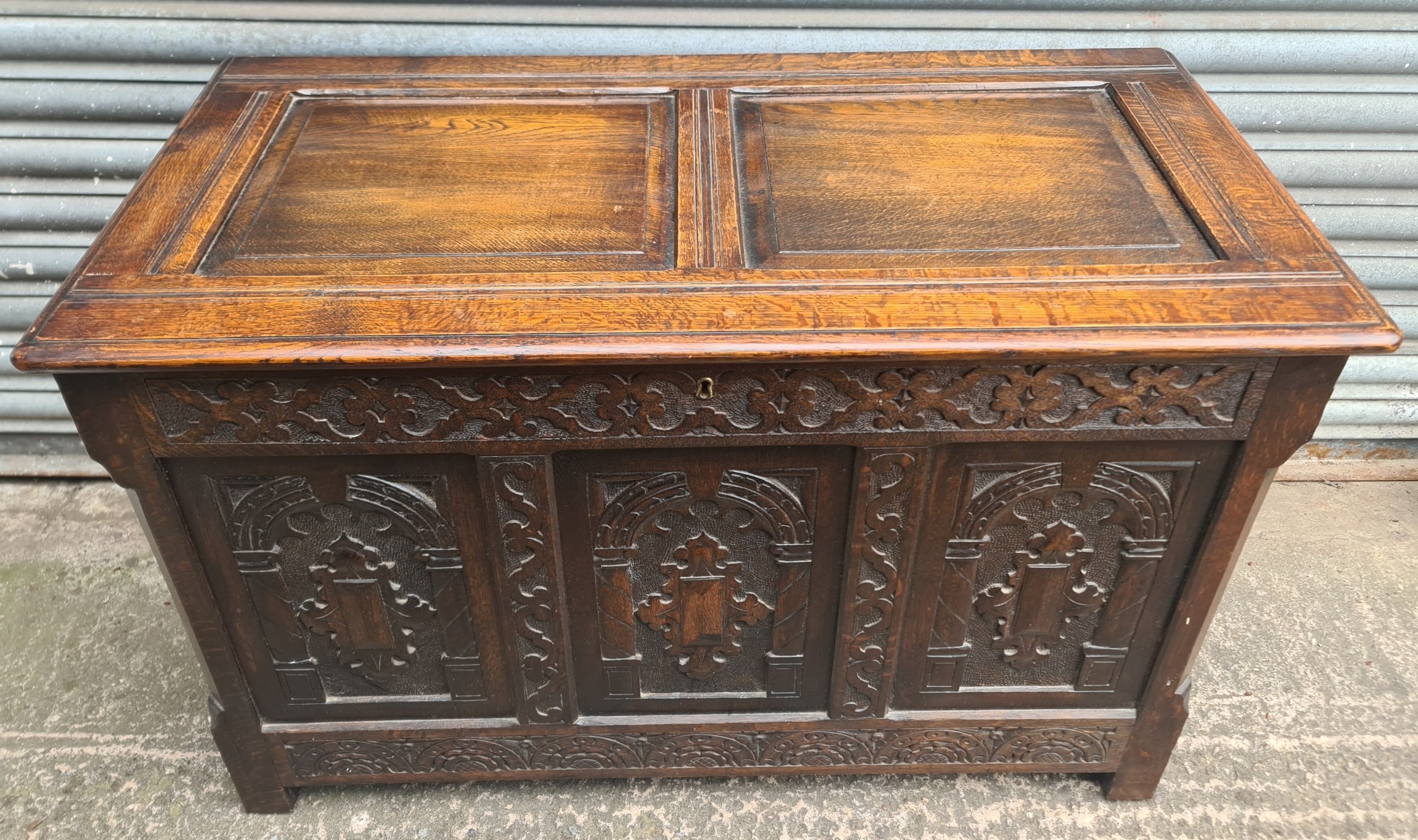 Antique Oak Coffer with Carved Panels and Front Sides. Measures 105cm by 54cm by 66cm. Shipping is available. Please ask for a quote before bidding. Where possible we combine shipping costs. Remember, if you are the highest bidder above reserve on this Lot you have bought the item and are legally responsible for the item. Viewing is recommended in either person or via video link. Contact us to arrange.