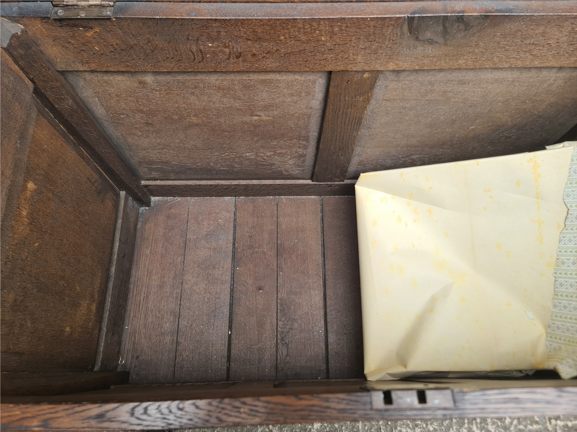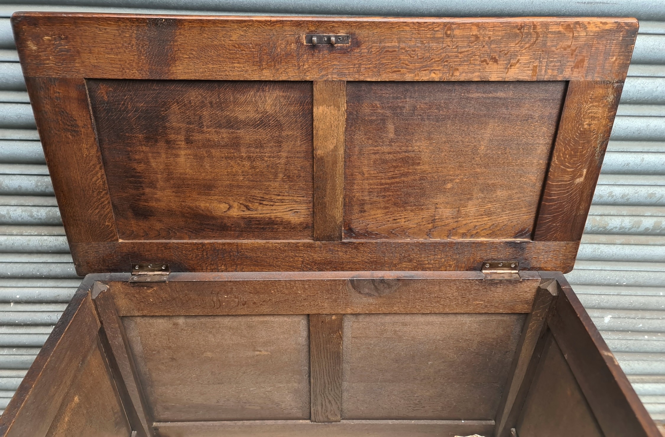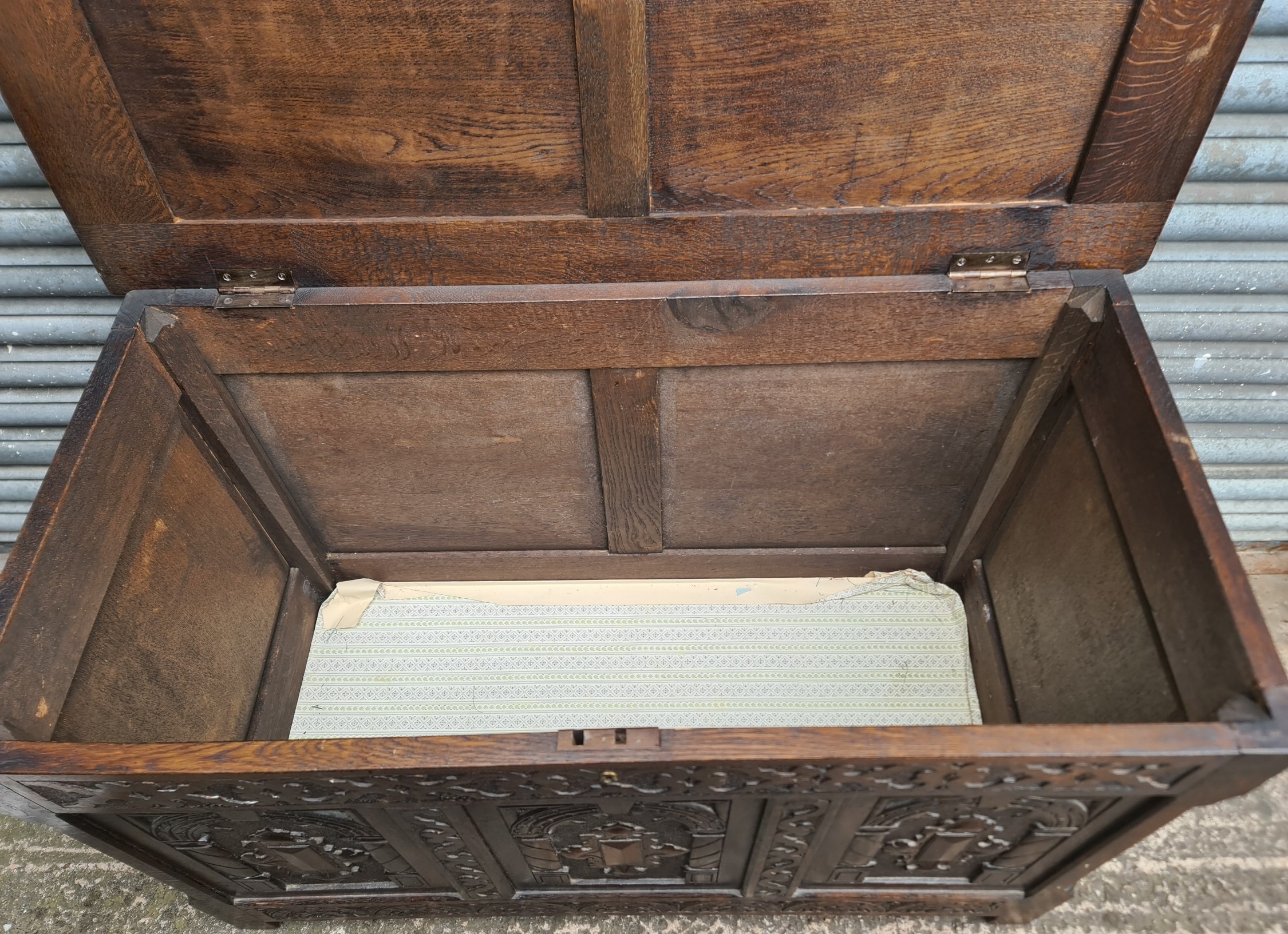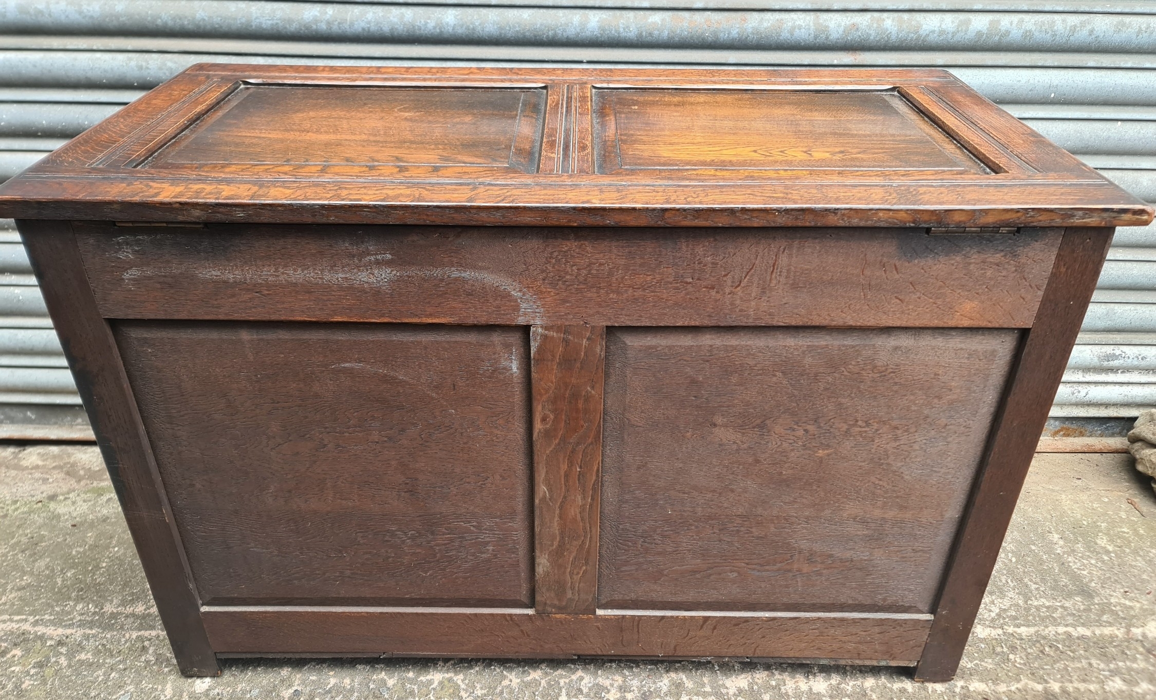 Antique Oak Coffer with Carved Panels and Front Sides. Measures 105cm by 54cm by 66cm. Shipping is available. Please ask for a quote before bidding. Where possible we combine shipping costs. Remember, if you are the highest bidder above reserve on this Lot you have bought the item and are legally responsible for the item. Viewing is recommended in either person or via video link. Contact us to arrange.