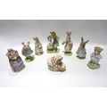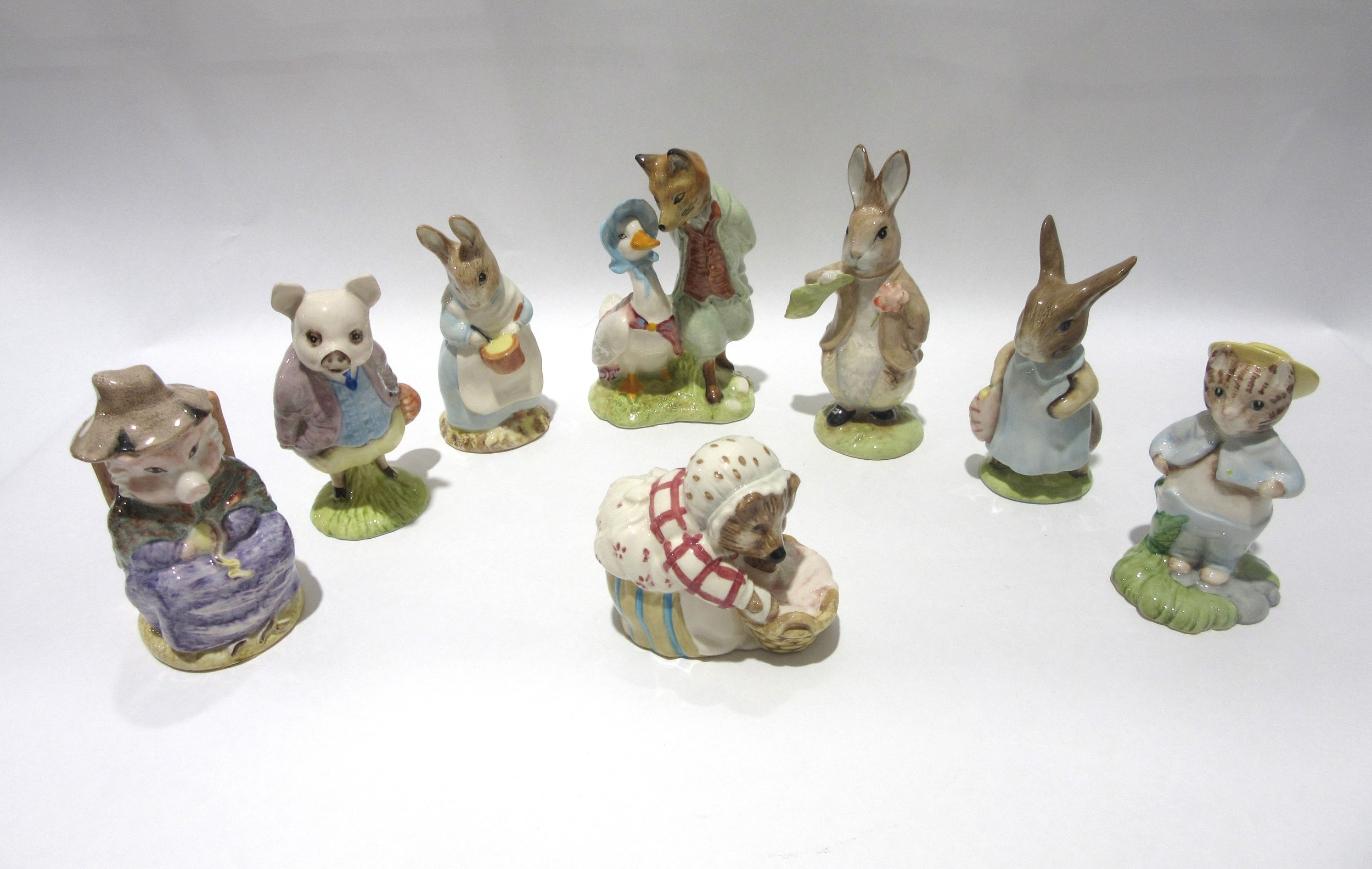 Eight Beswick Beatrix Potter figures - "Mrs Rabbit Cooking", "Benjamin ate a lettuce leaf", "And this little Pig had None", "Jemima Puddle-Duck with Foxy Whiskered Gentleman", "Tom Kitten in the Rockery", "Mrs Tiggy-Winkle Washing", "Mrs Flopsy Bunny" and "Pigling Bland"
