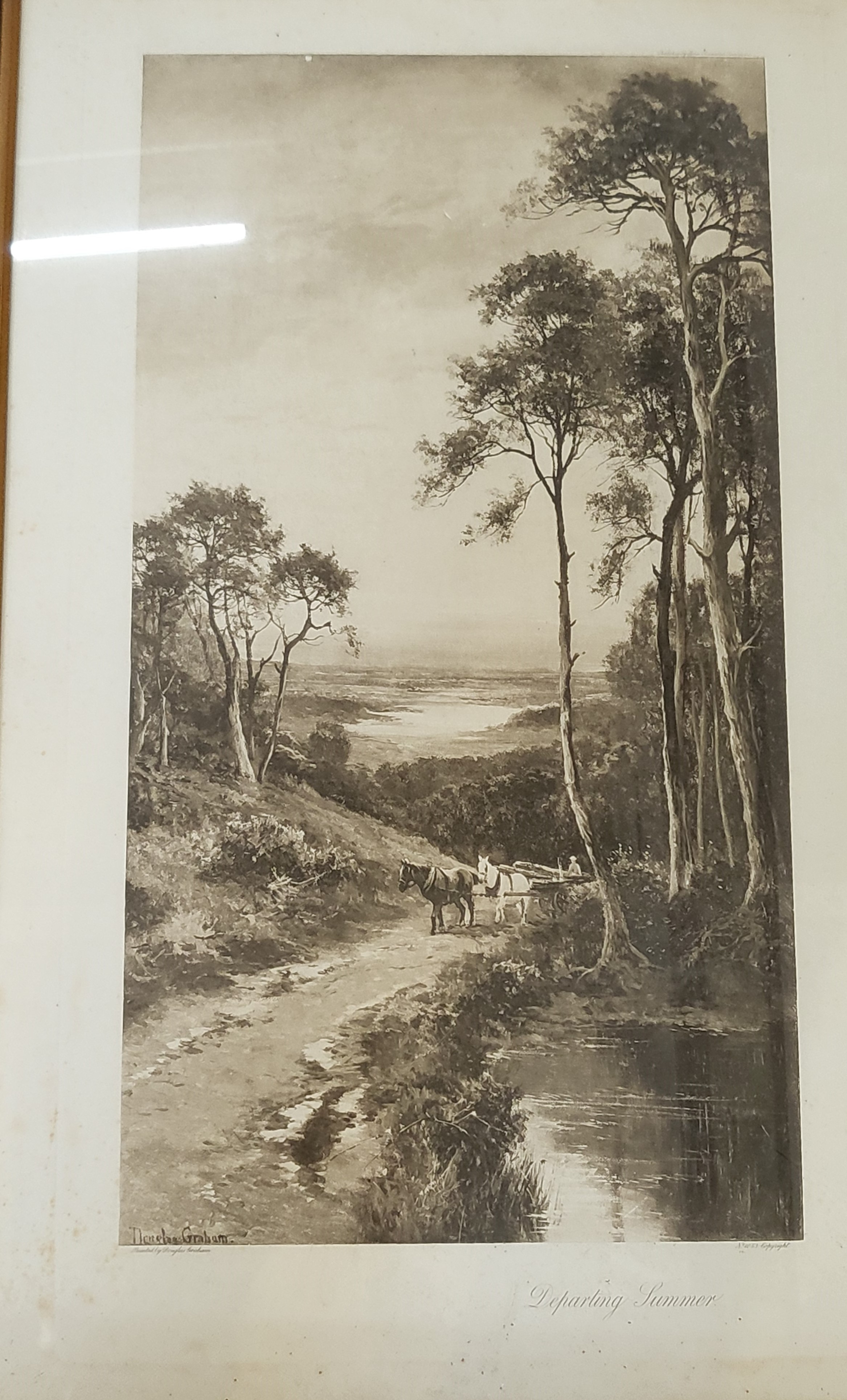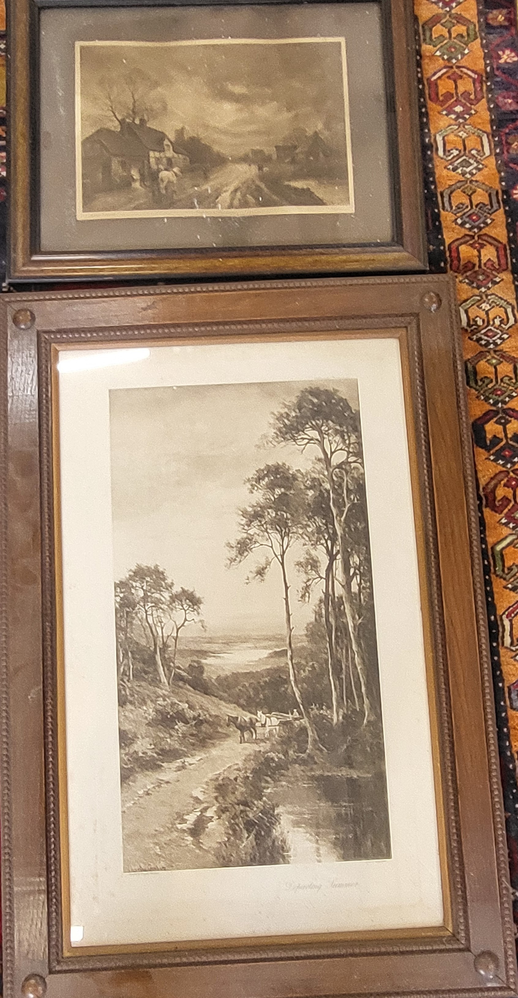 Two framed and glazed prints including: The Forge - Moonrise by F R London W:59cm H:47cm and Ellens Isle - Loch Katrine 'Departing Summer' W:64cm H:95cm.