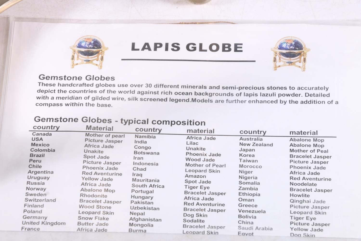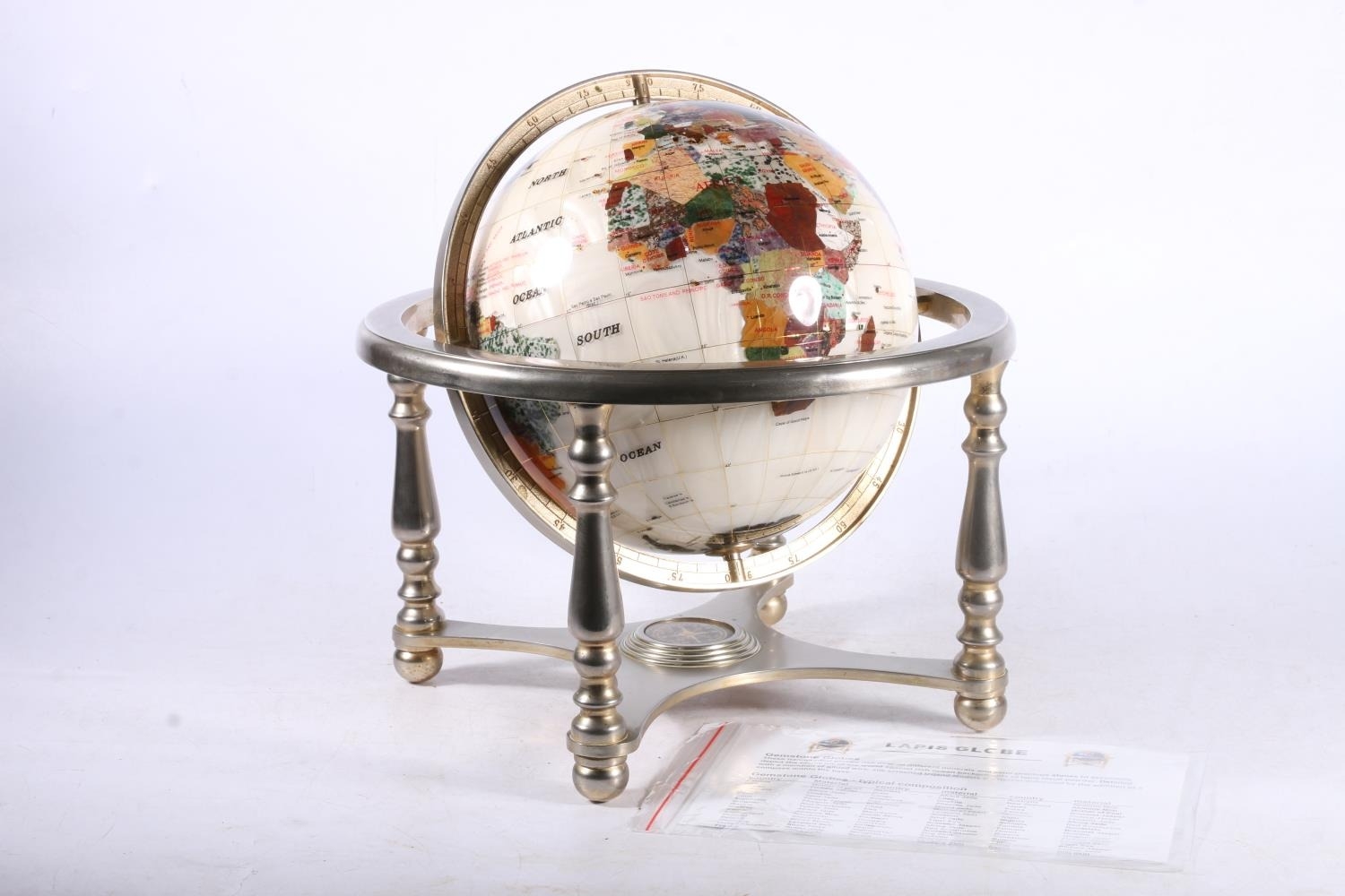 Terrestrial globe inset with minerals and semi-precious stones, 32cm