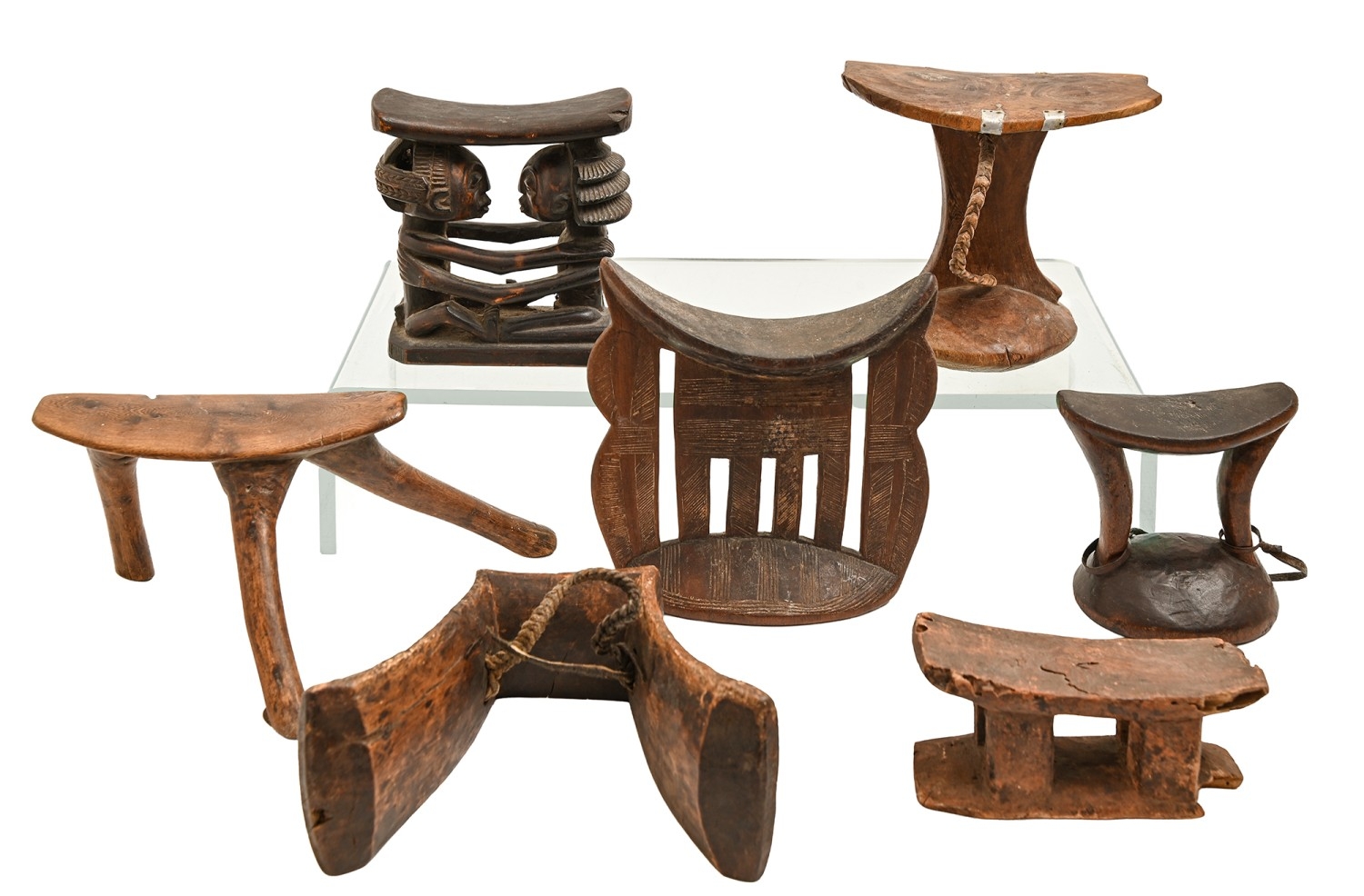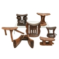 Tribal art. Seven wood head rests, Africa, including Ethopia, Lobi, Luba and Turkana articles, largest 20cm h