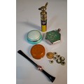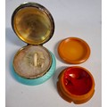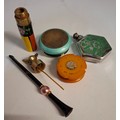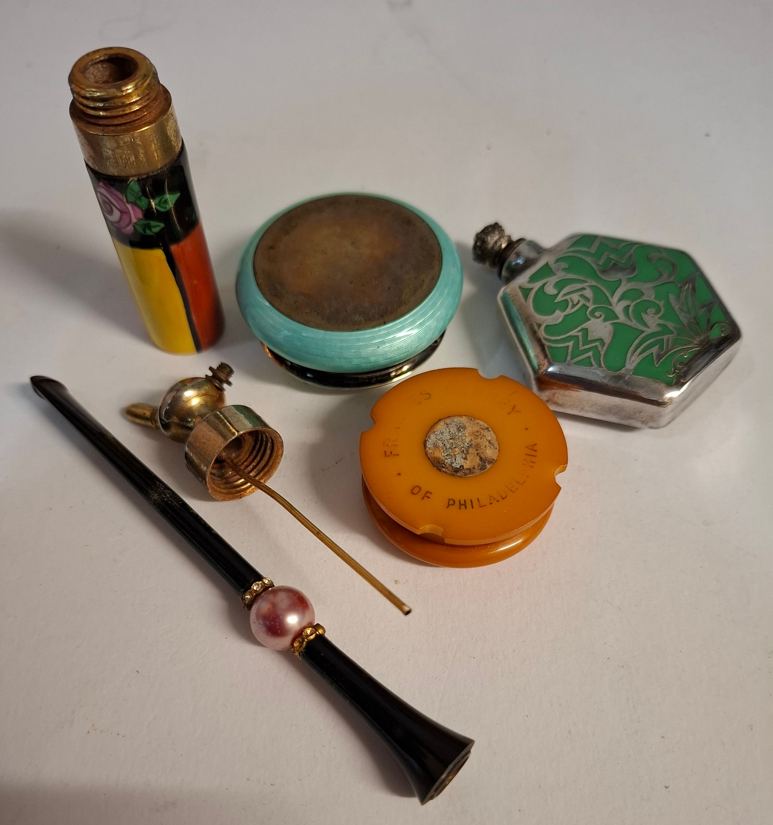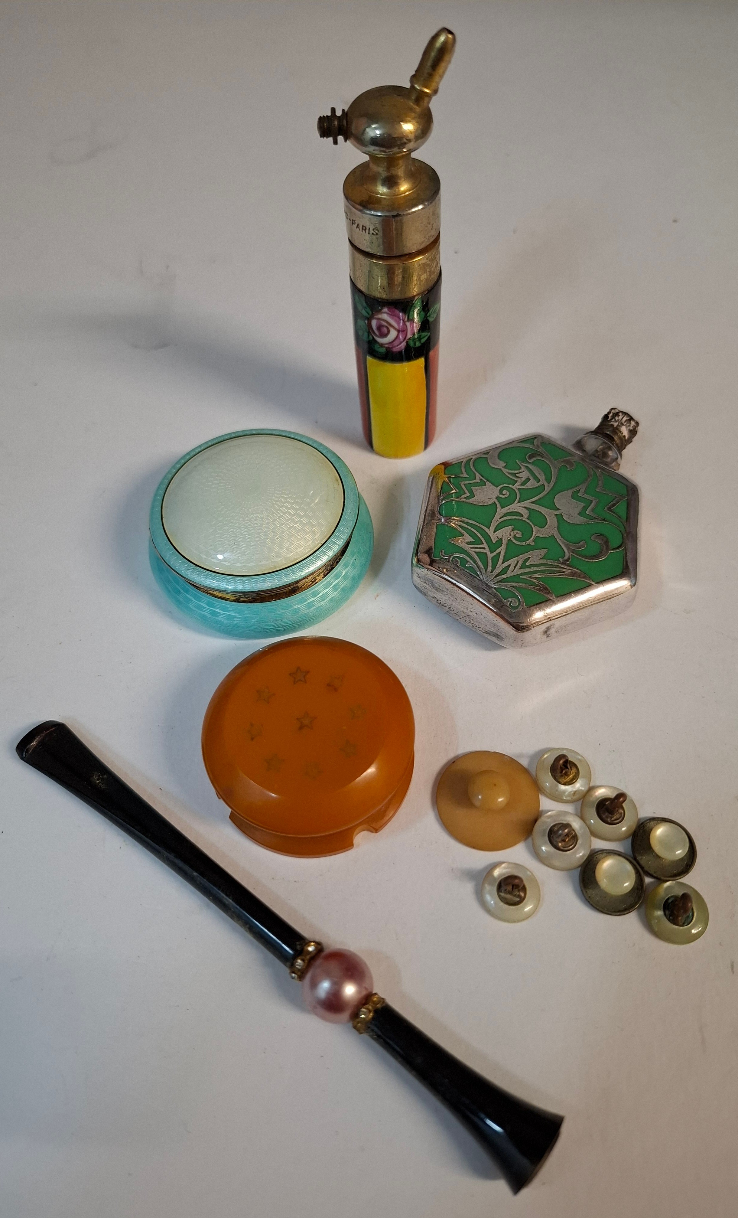 An early 20th Century blue and white enamel powder pot, a silver overlay scent bottle, a cheroot, a Frances Denney of Philadelphia rouge pot, a Paradis, Paris scent bottle and vintage shirt buttons. Location: A4B