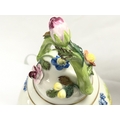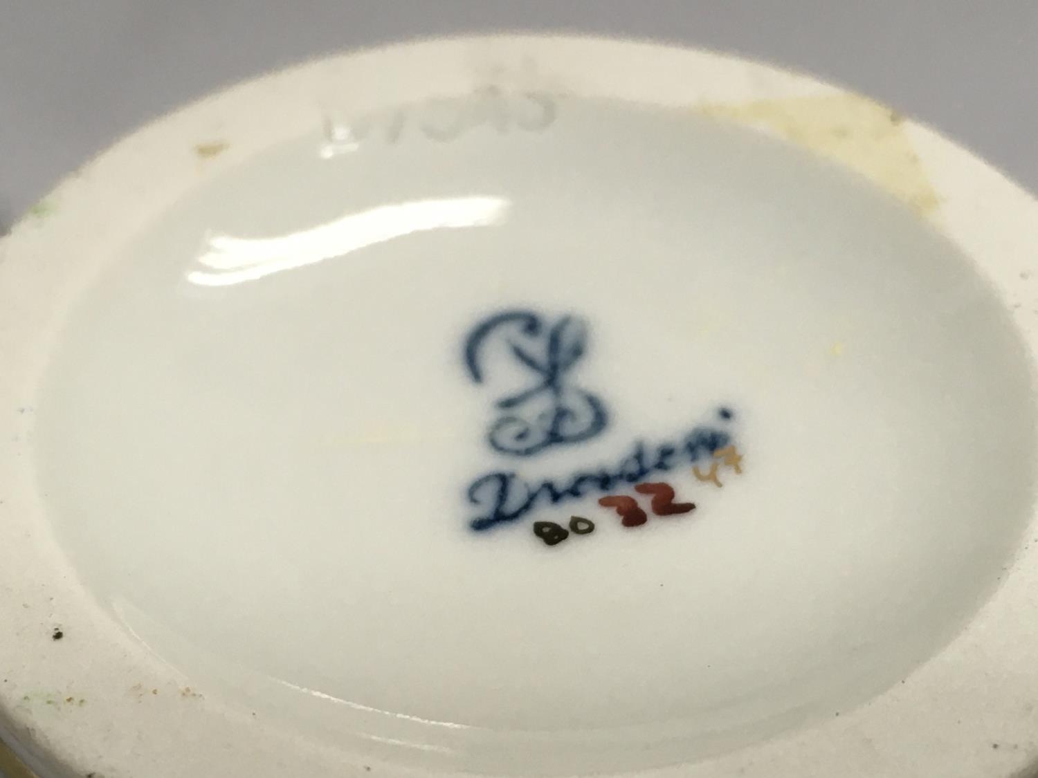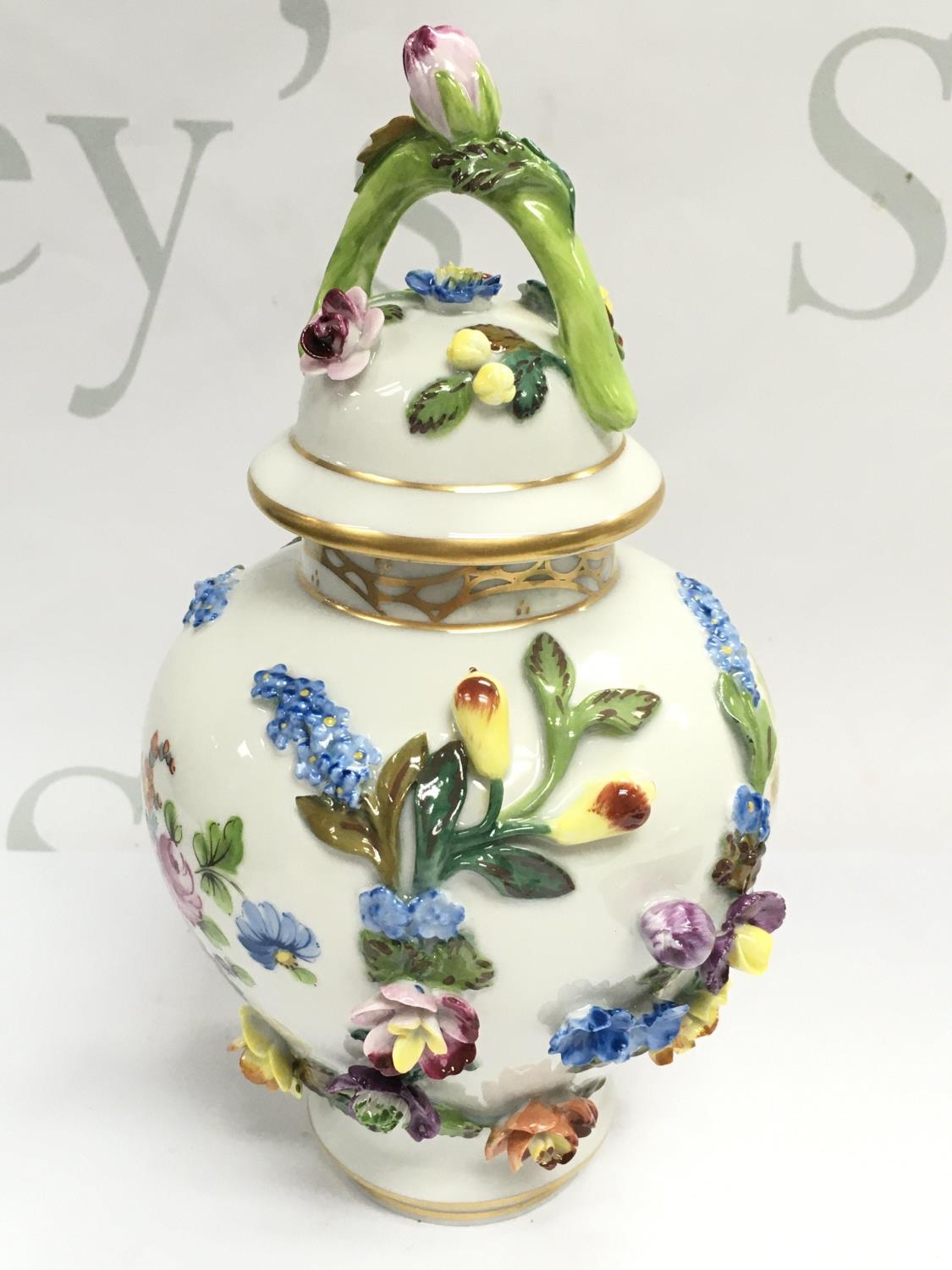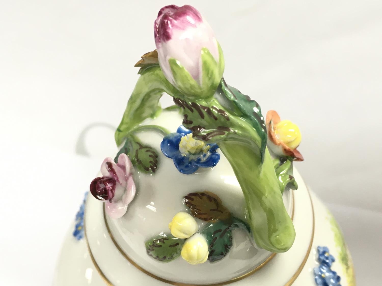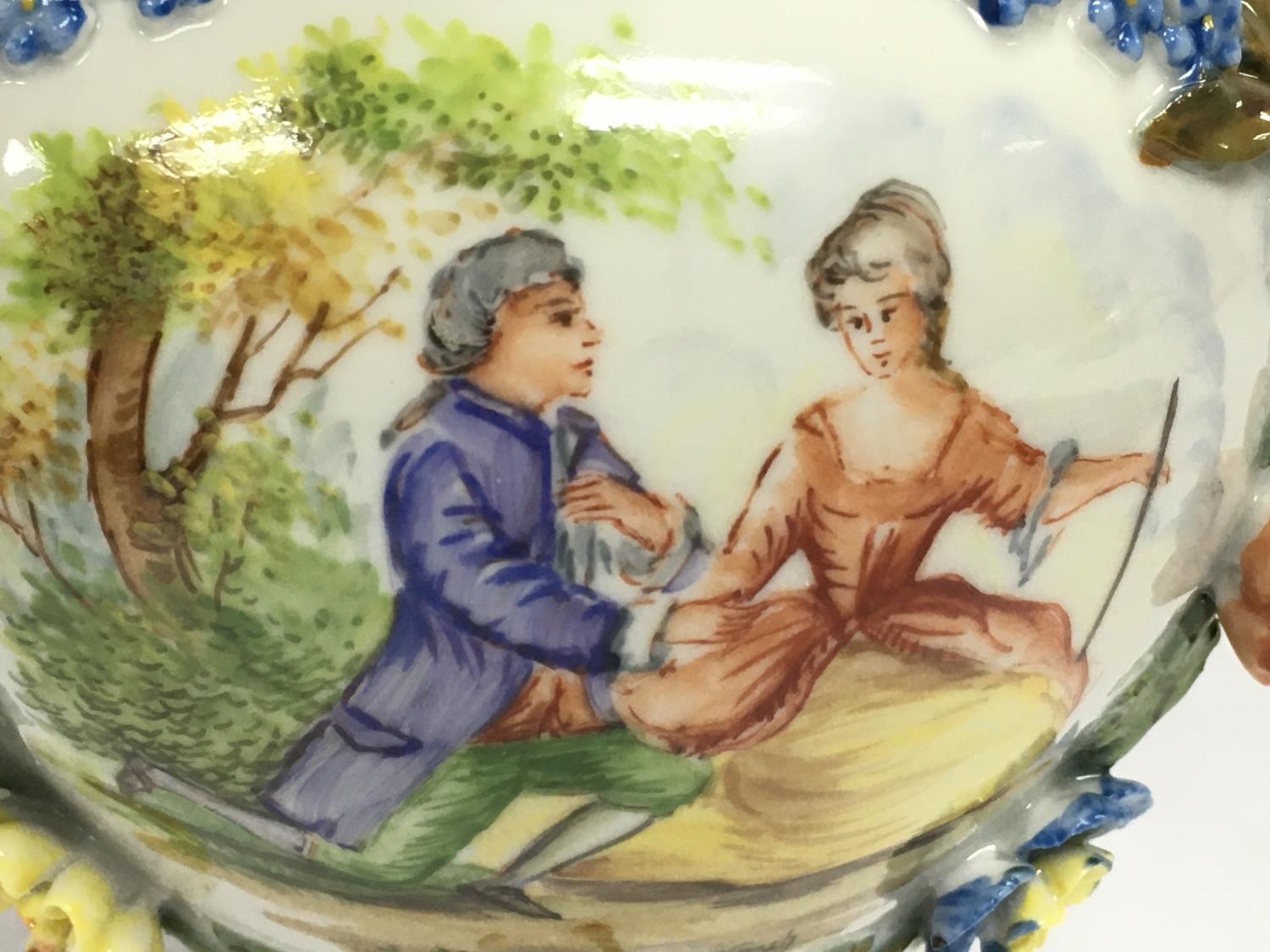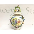 A Dresden urn & cover, hand painted with a figural scene and floral decoration . 19cm tall. This lot cannot be posted. NO RESERVE