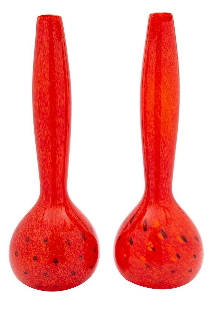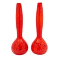 A pair of hand blown studio glass vases, of globular form with slender swelling neck, the speckled orange body with bands of black, ground pontil marks to base, 45cm high.