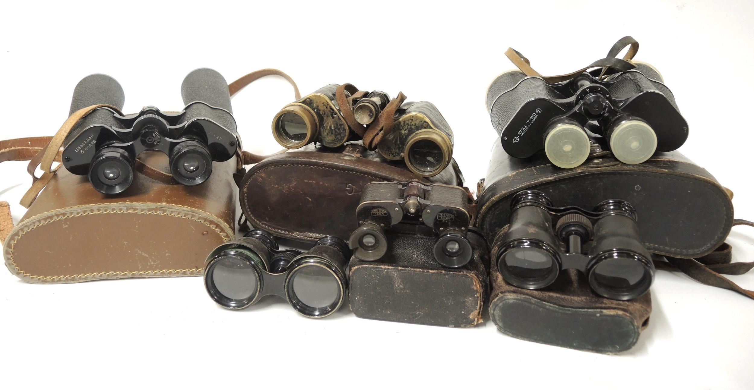 Three cased pairs of binoculars, together with three pairs of opera glasses