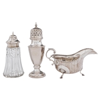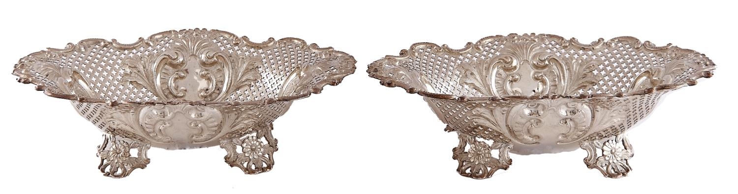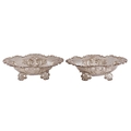 A pair of Victorian die stamped and pierced silver sweetmeat dishes, on four floral feet, 18.5cm l, by Sibray, Hall & Co, Sheffield 1893, 9ozs 18dwts