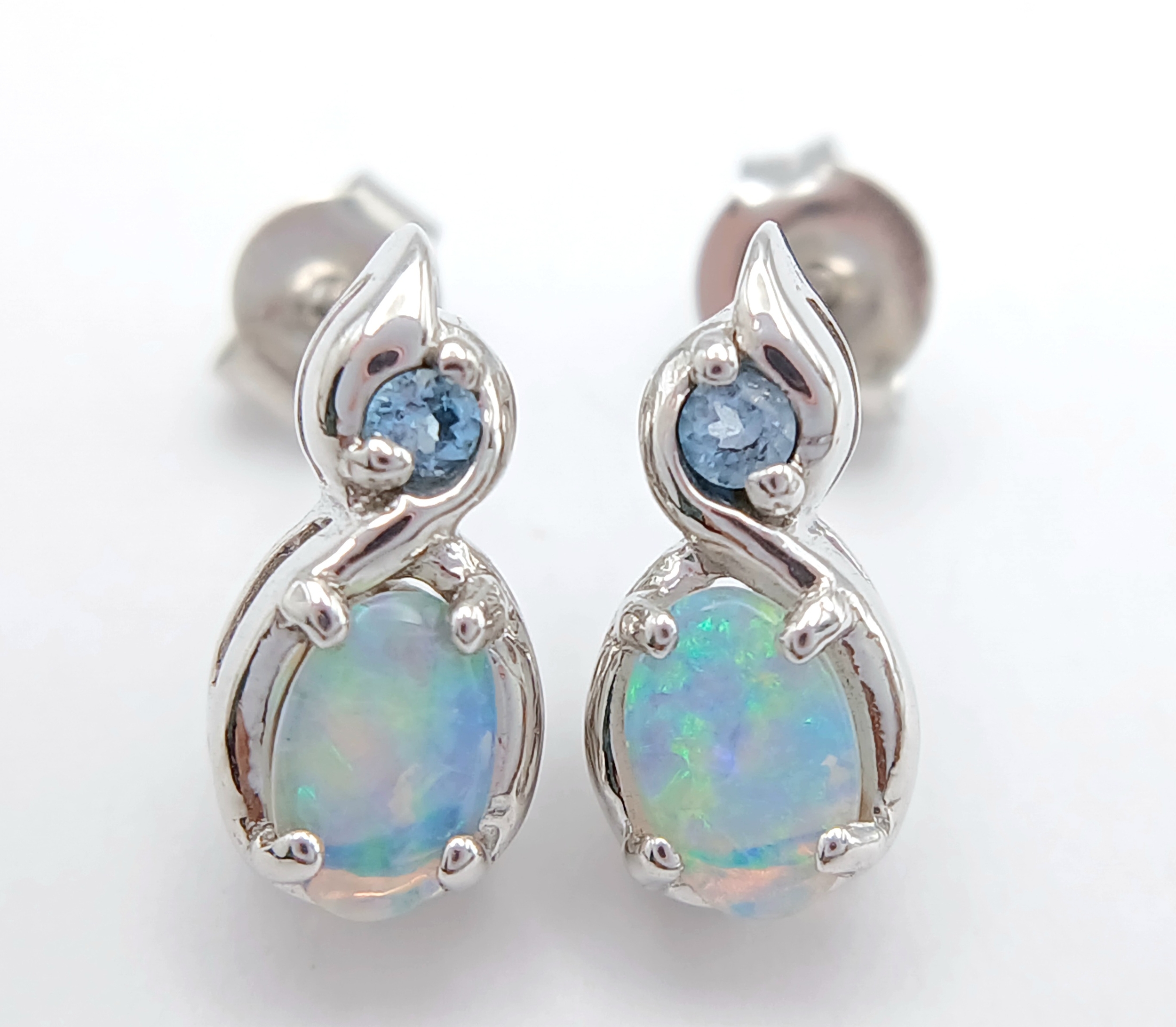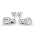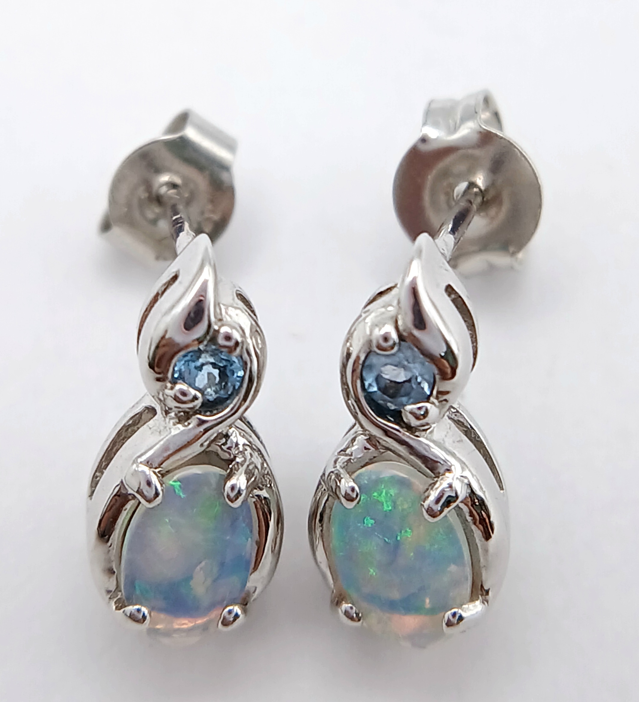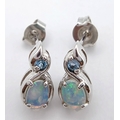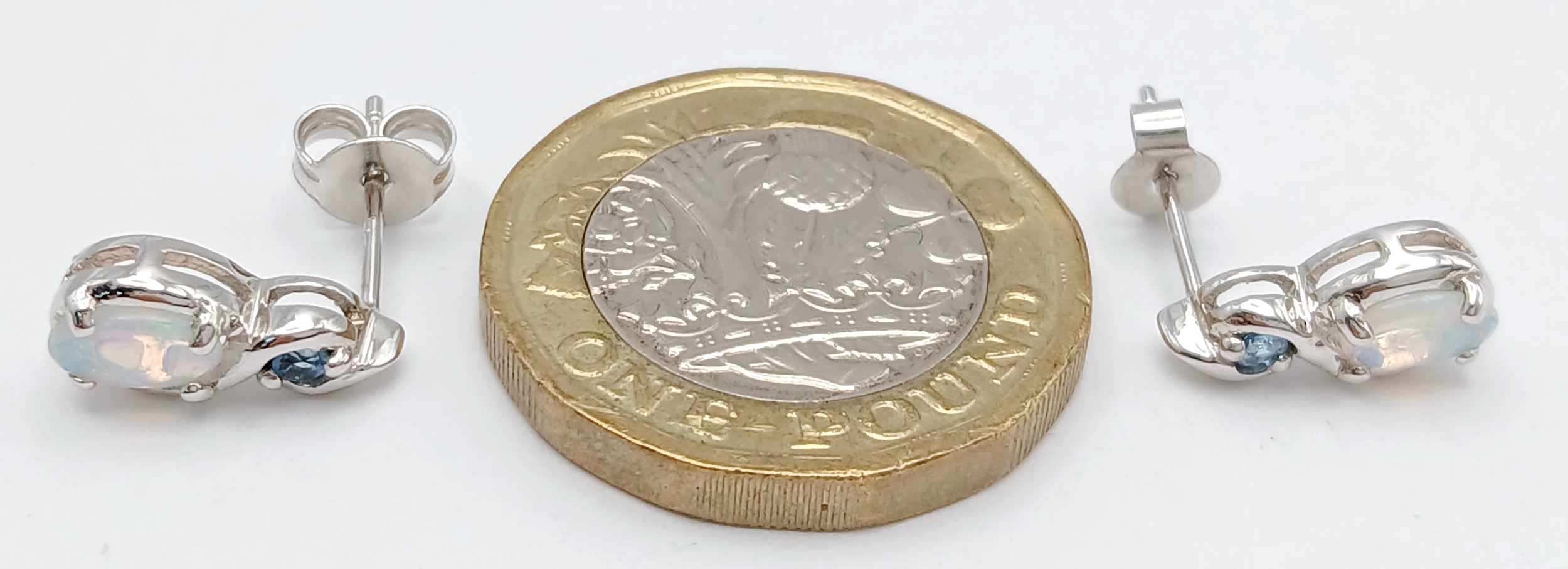 A Stunning Pair of 9 Carat White Gold Opal and Blue Topaz Set Stud Earrings. 1.2cm Length. Gross Combined Weight 1.81 Grams.