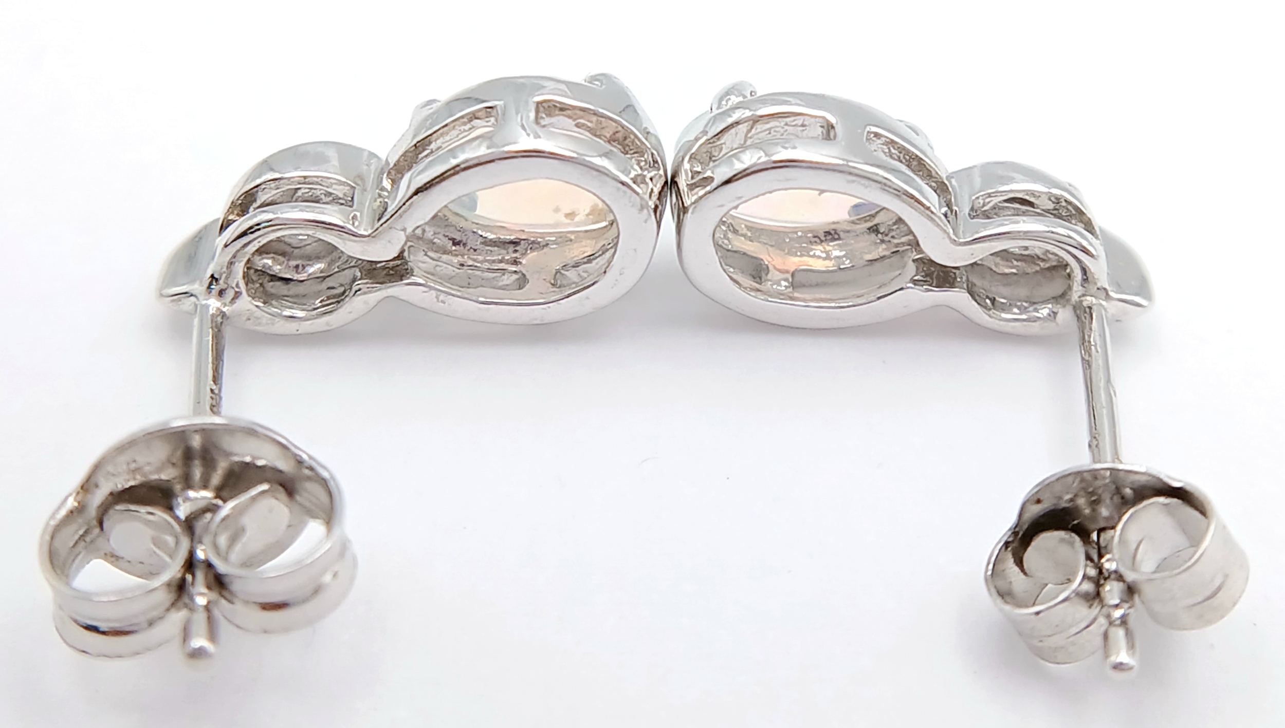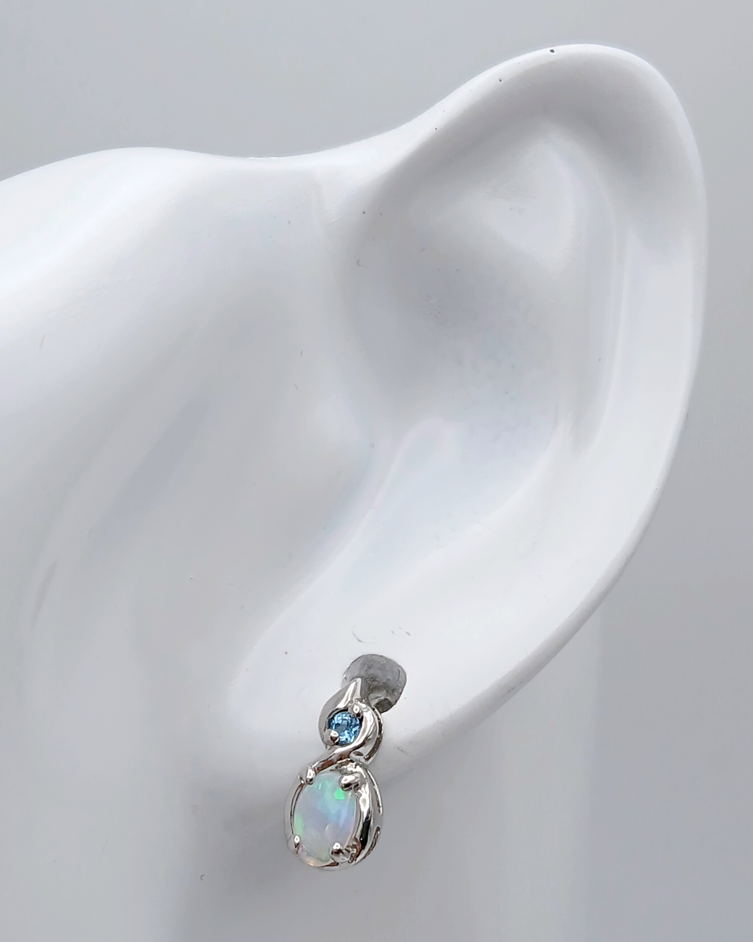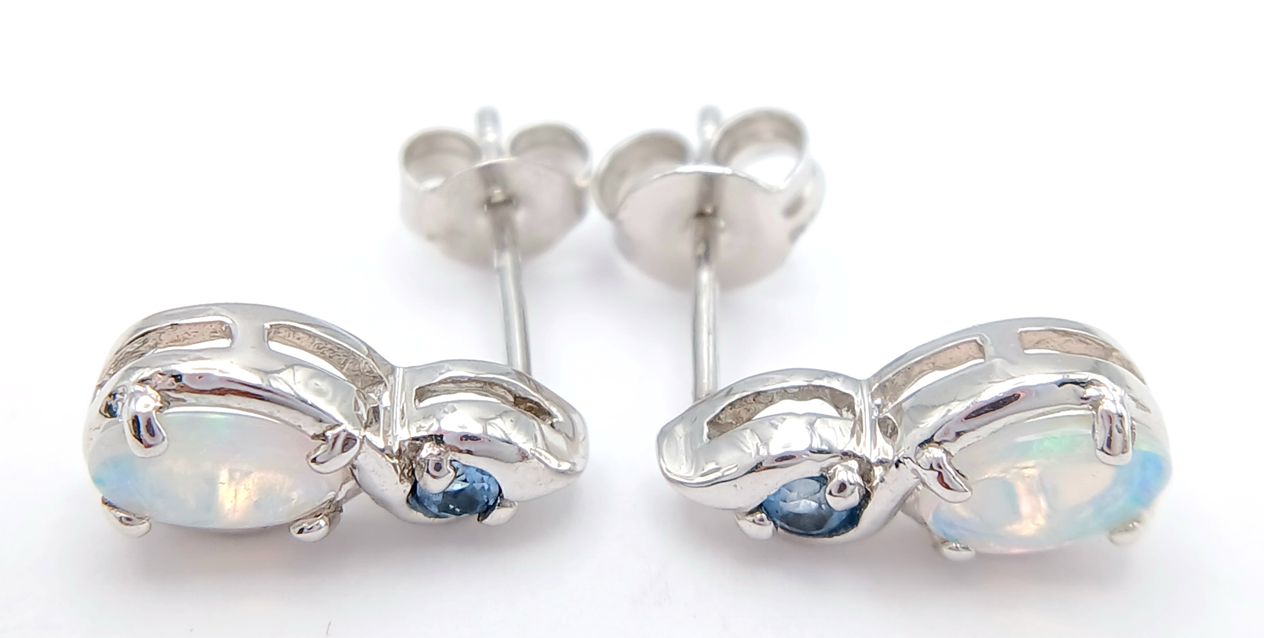 A Stunning Pair of 9 Carat White Gold Opal and Blue Topaz Set Stud Earrings. 1.2cm Length. Gross Combined Weight 1.81 Grams.