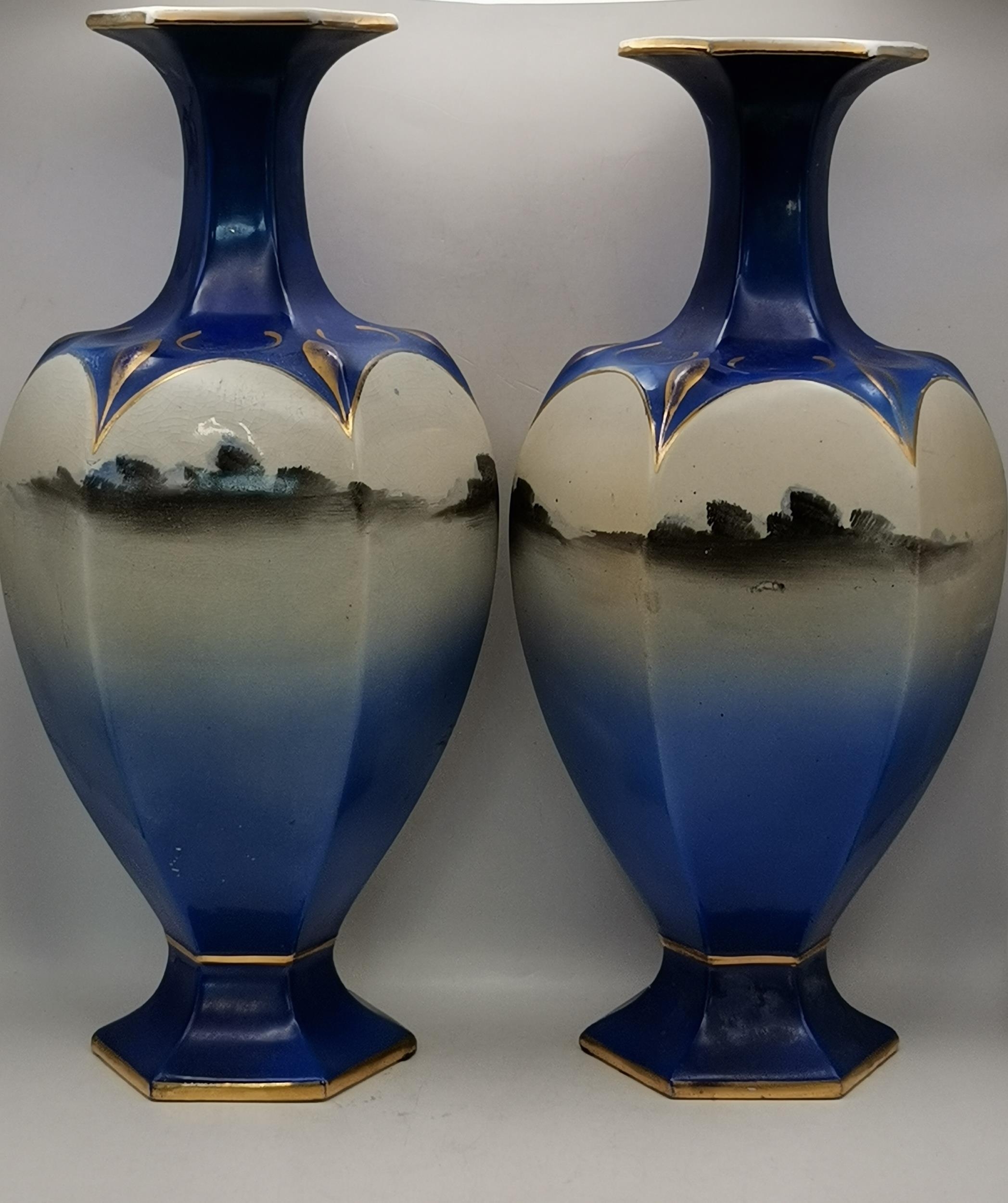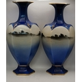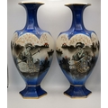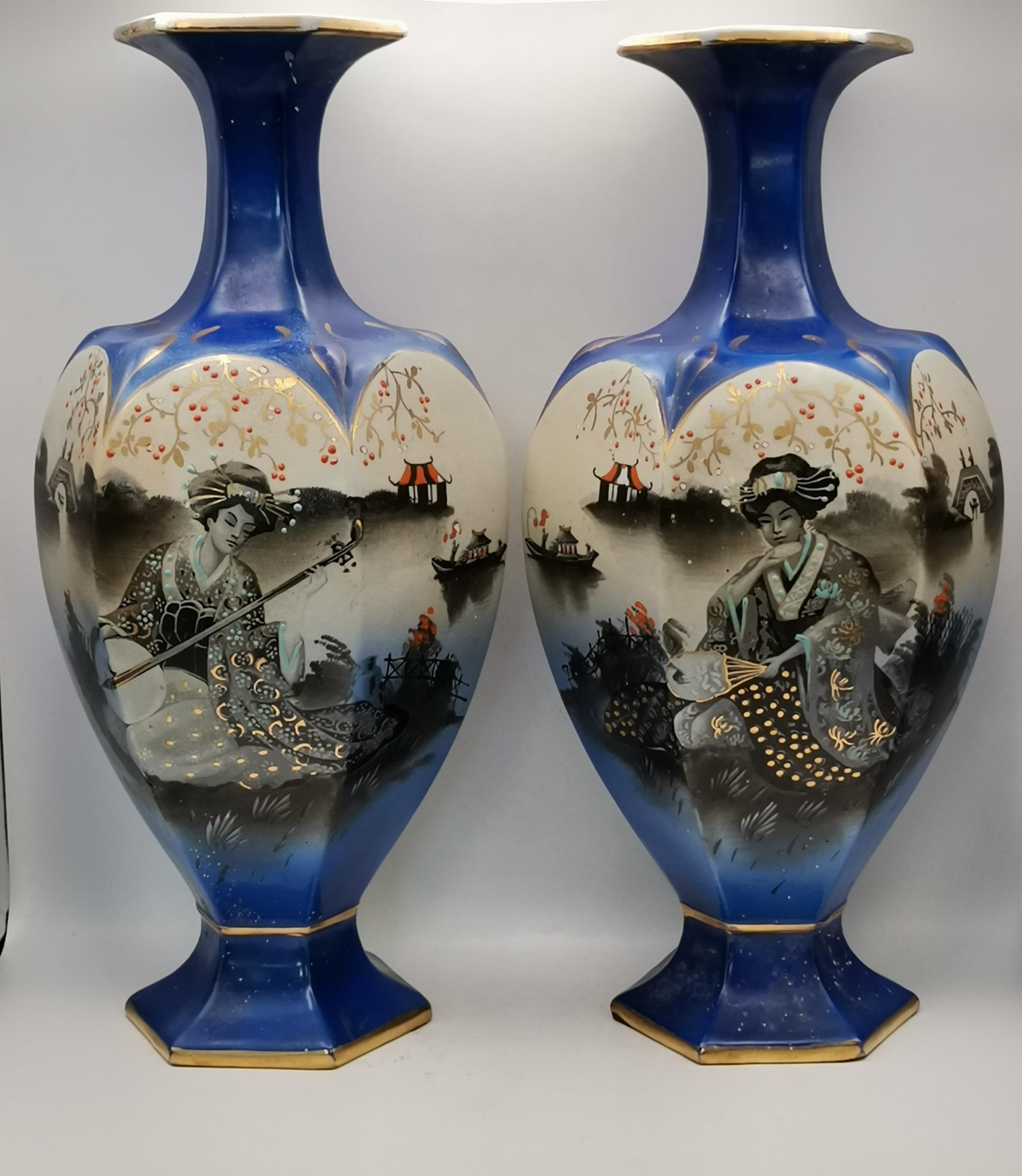 A Pair of cobalt Blue Mantel Vases with hand painted Japanese water scene with Geisha girl marked to base Roman Made in England H35cm