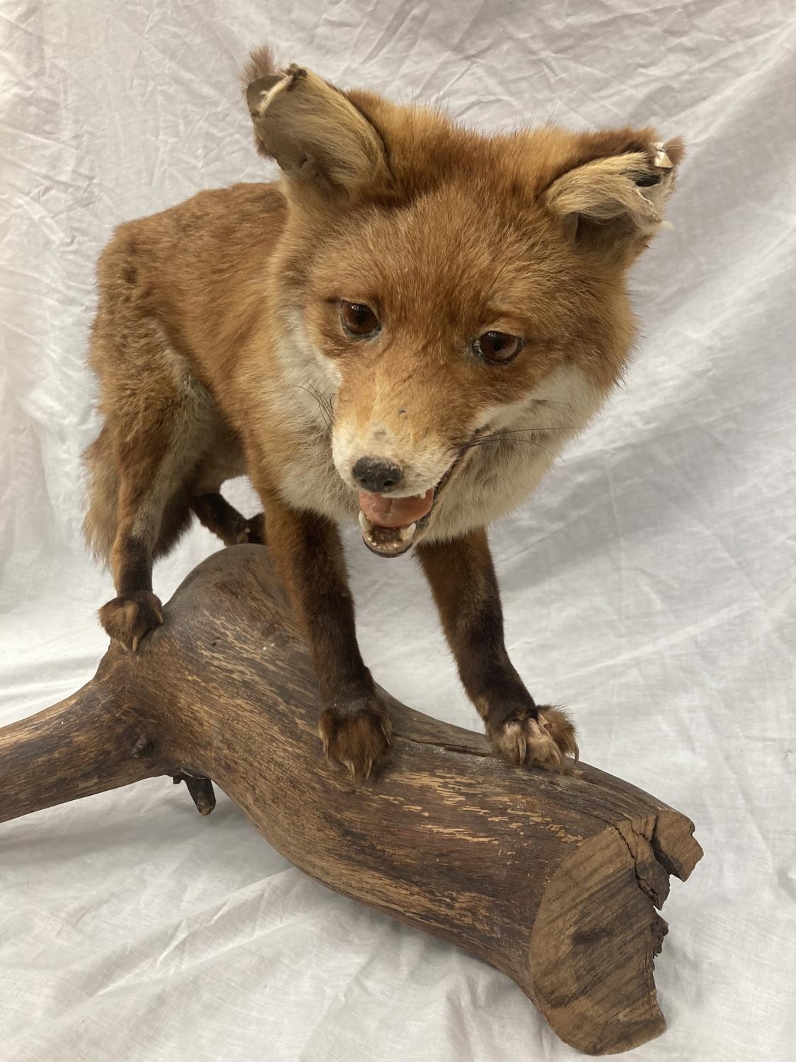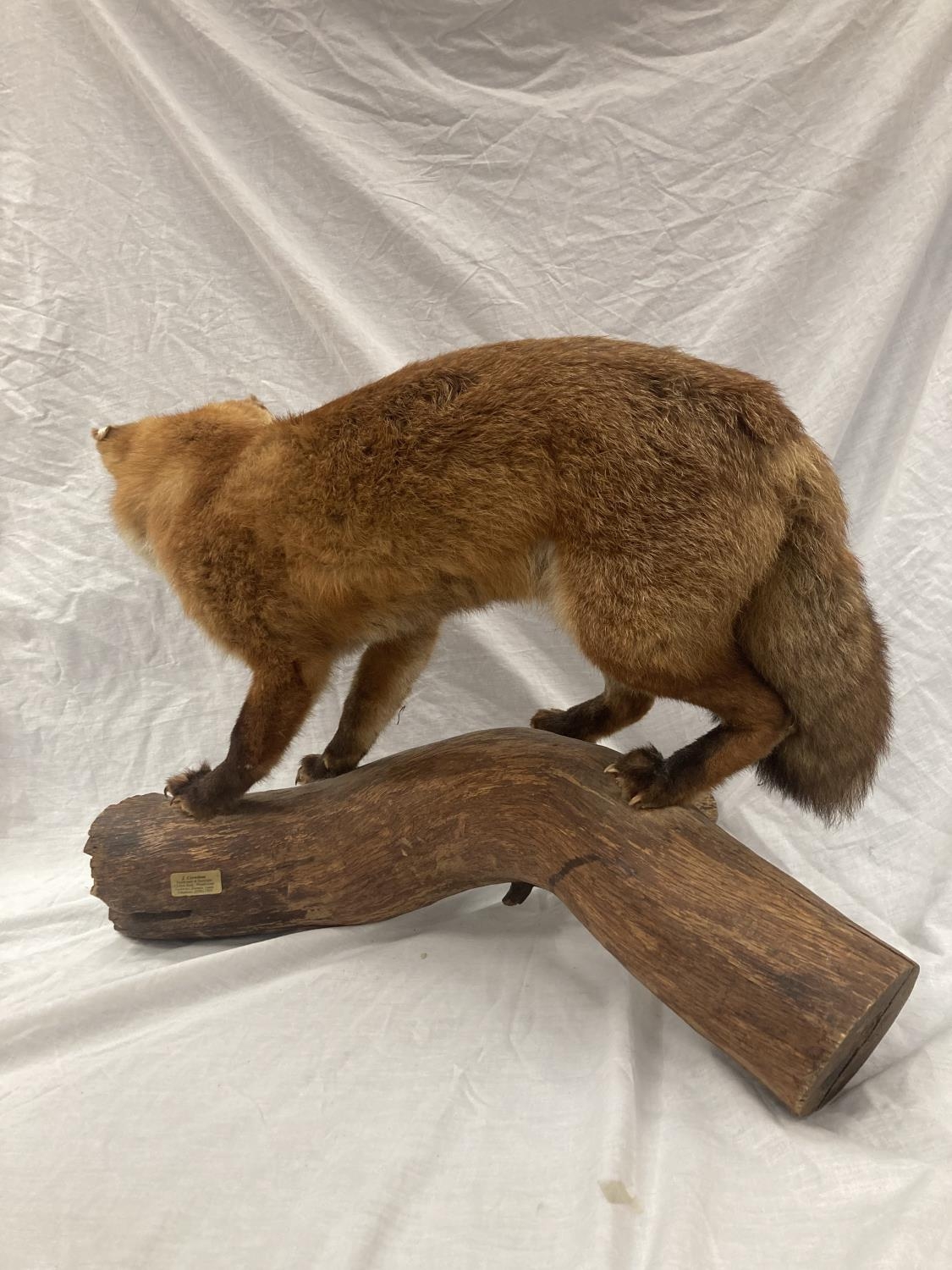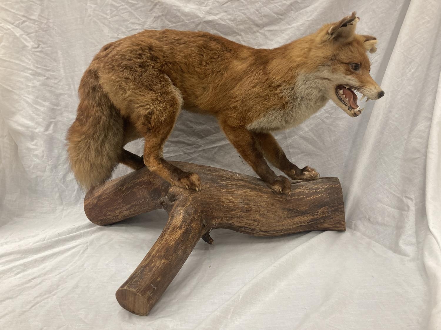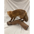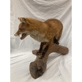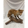 A TAXIDERMY RED FOX ON A BRANCH IN GOOD OVERALL CONDITION LENGTH APPROX 67CM, HEIGHT APPROX 49CM