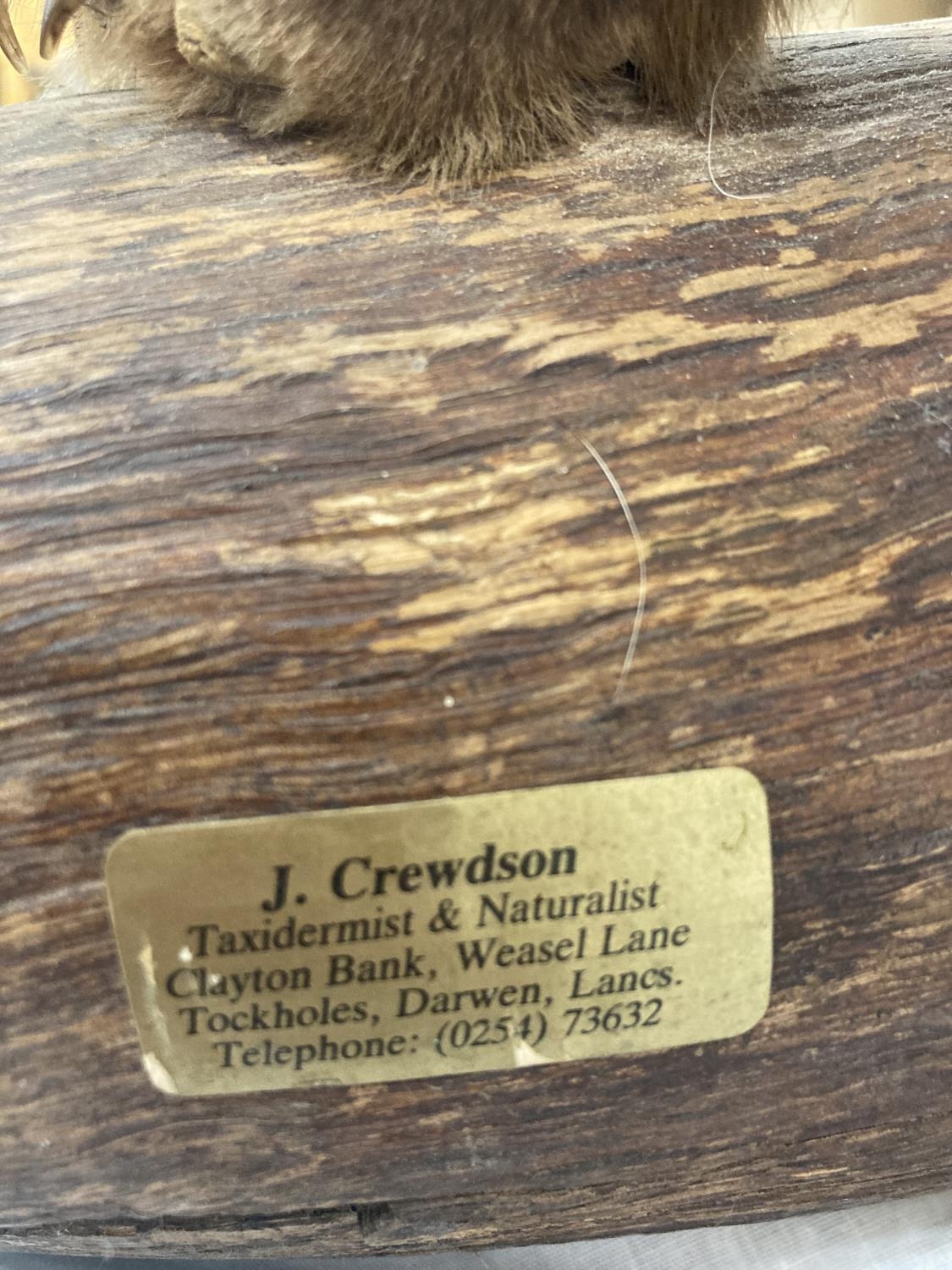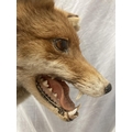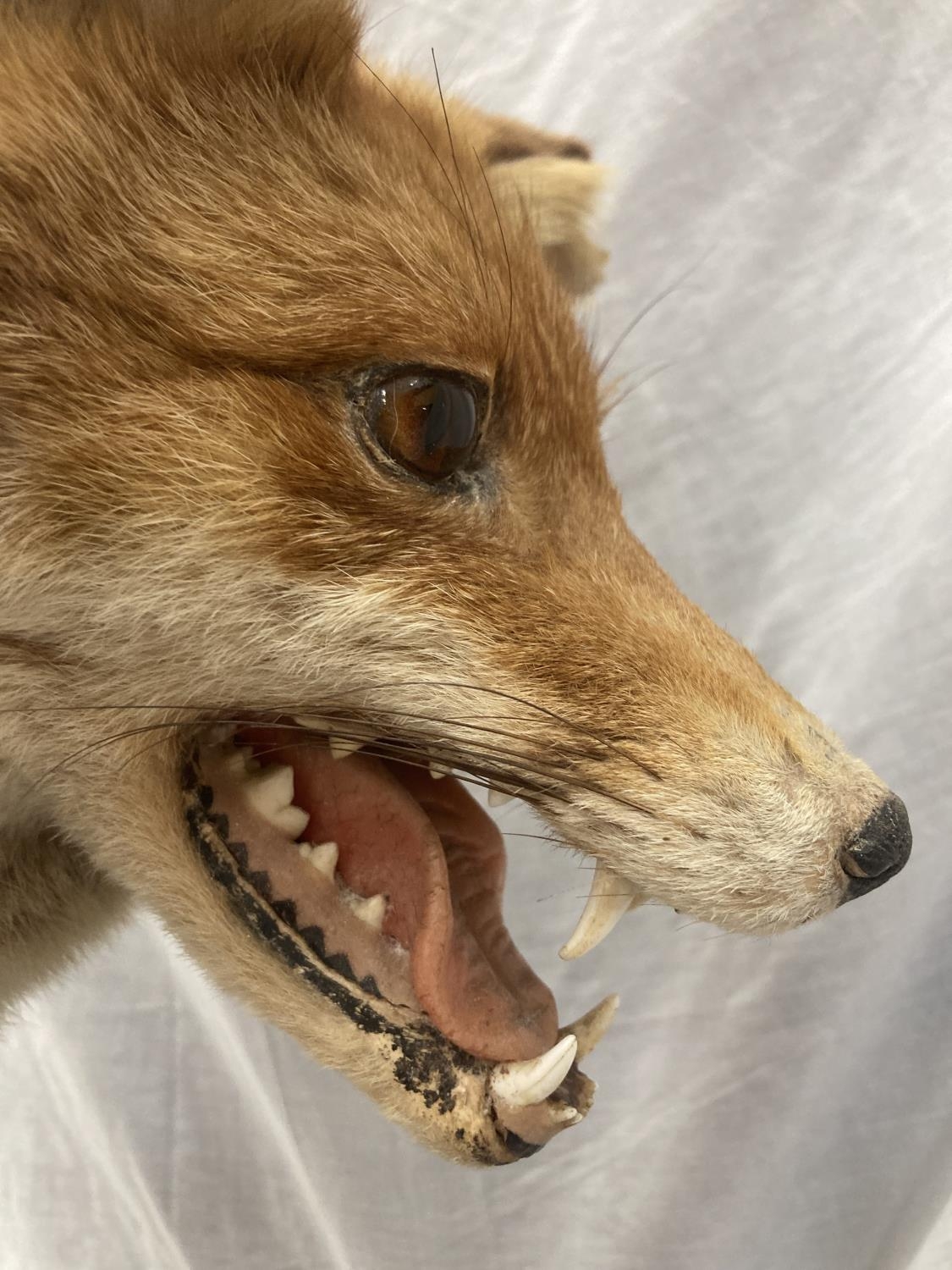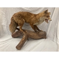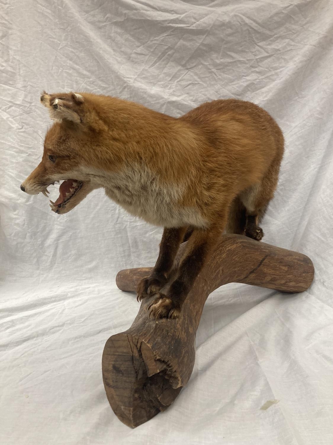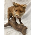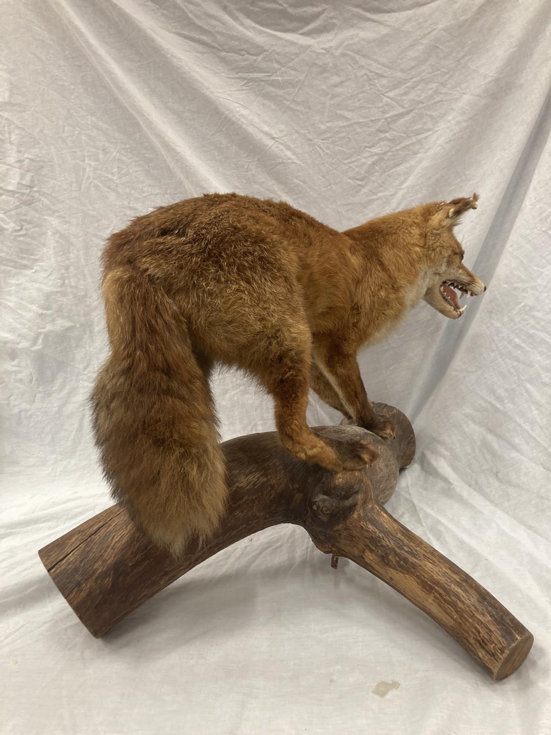 A TAXIDERMY RED FOX ON A BRANCH IN GOOD OVERALL CONDITION LENGTH APPROX 67CM, HEIGHT APPROX 49CM
