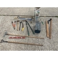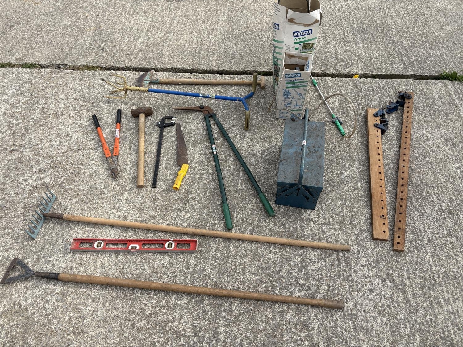 Garden tools, toolbox, two sprayers and 2 cramps