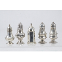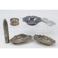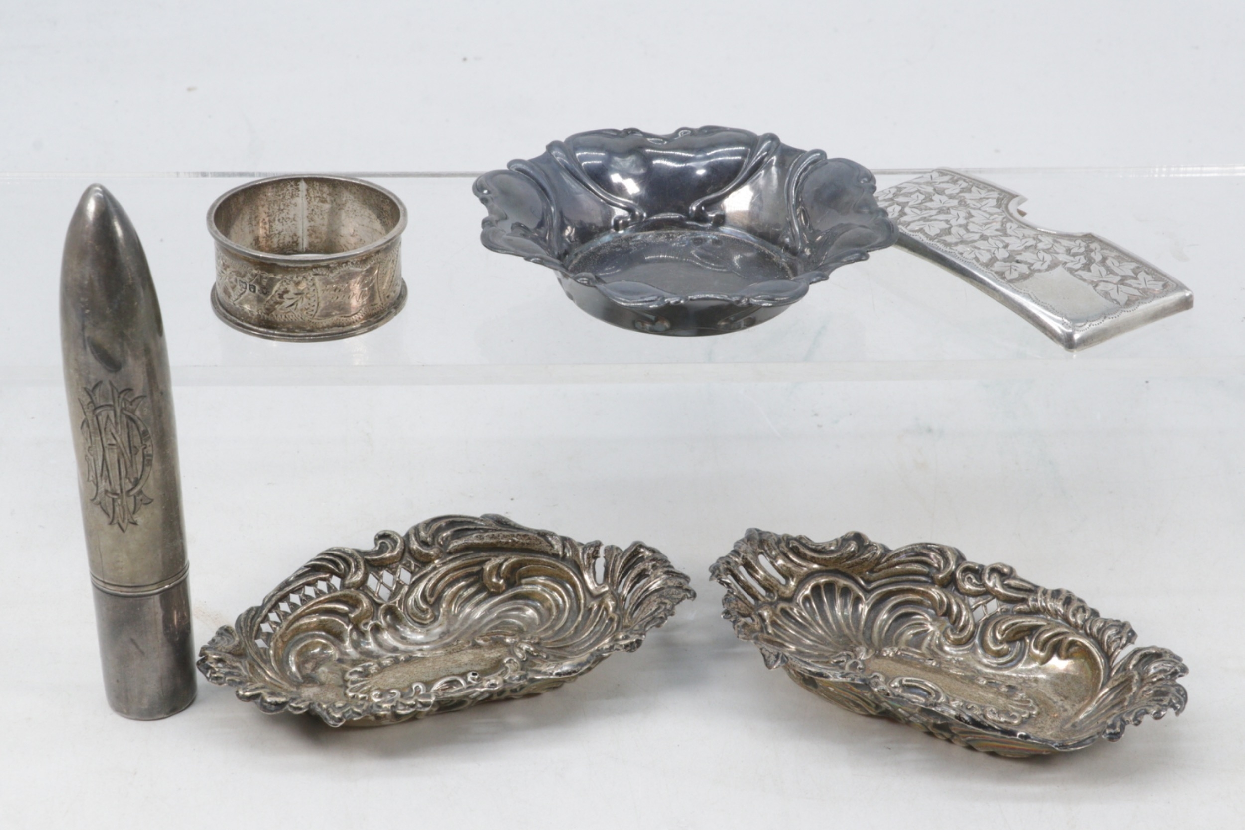A pair of silver small trays, silver round dish, card holder, napkin ring, cigar tube (approx. 180g)