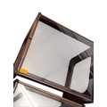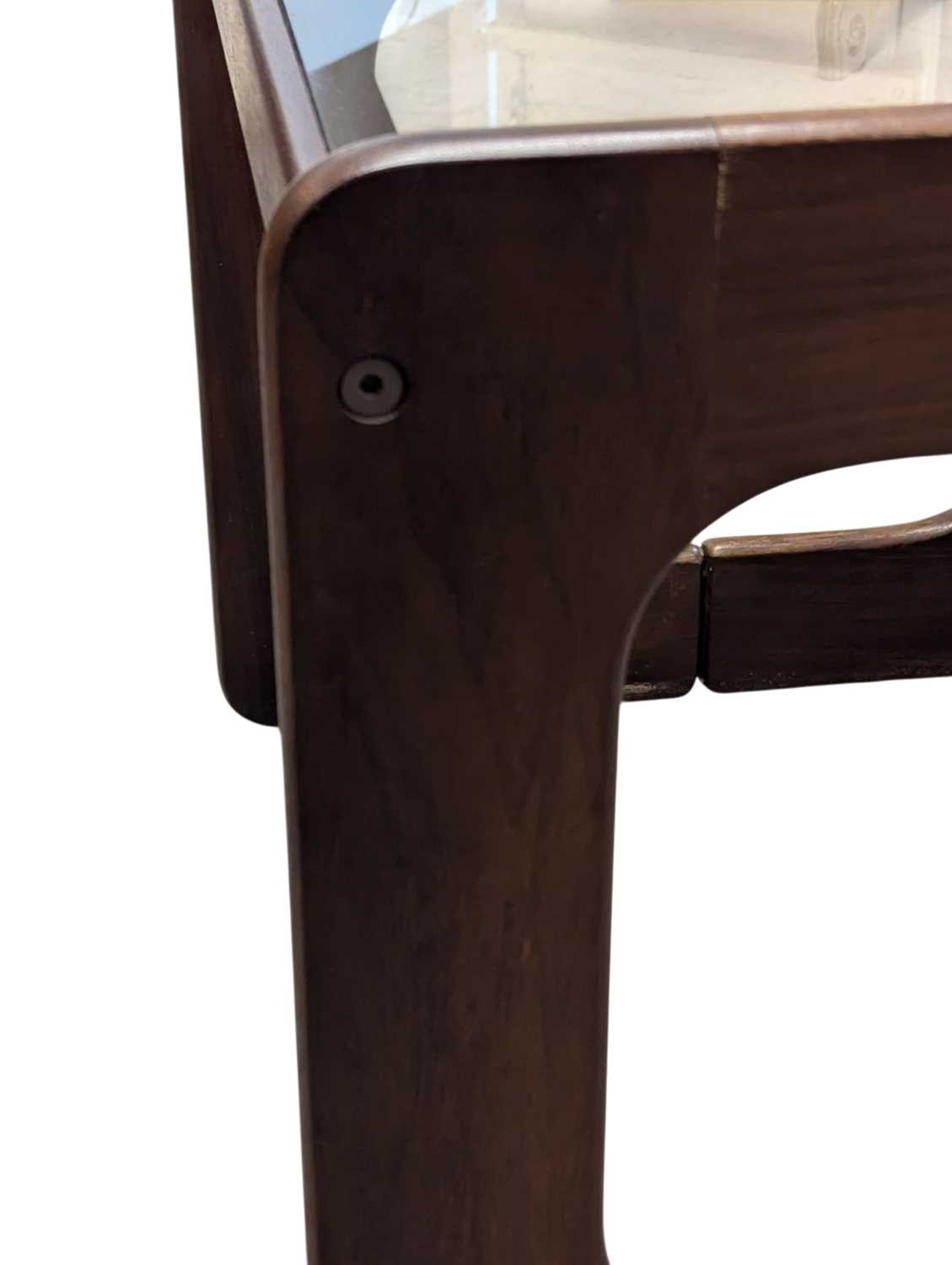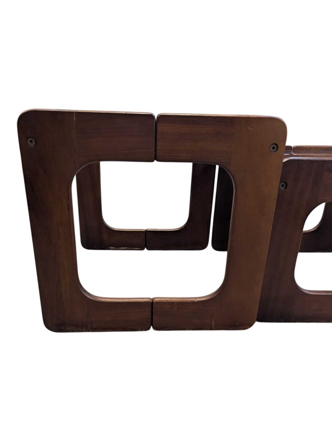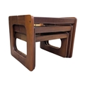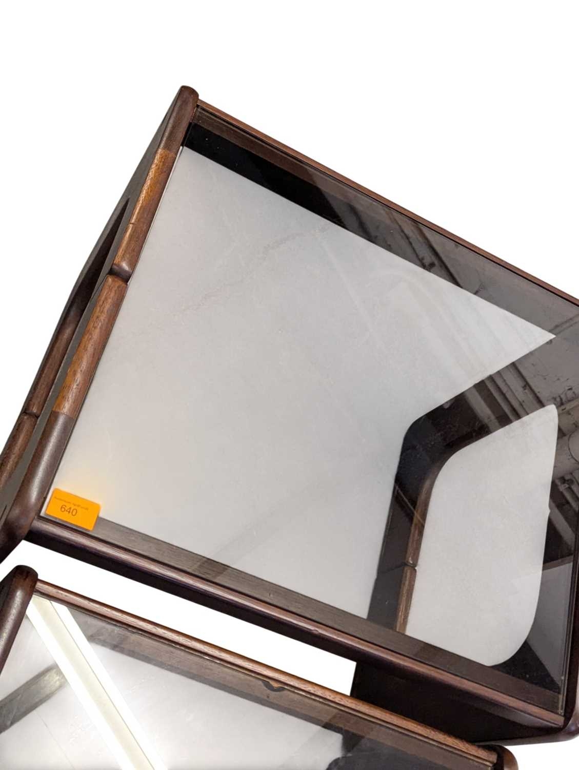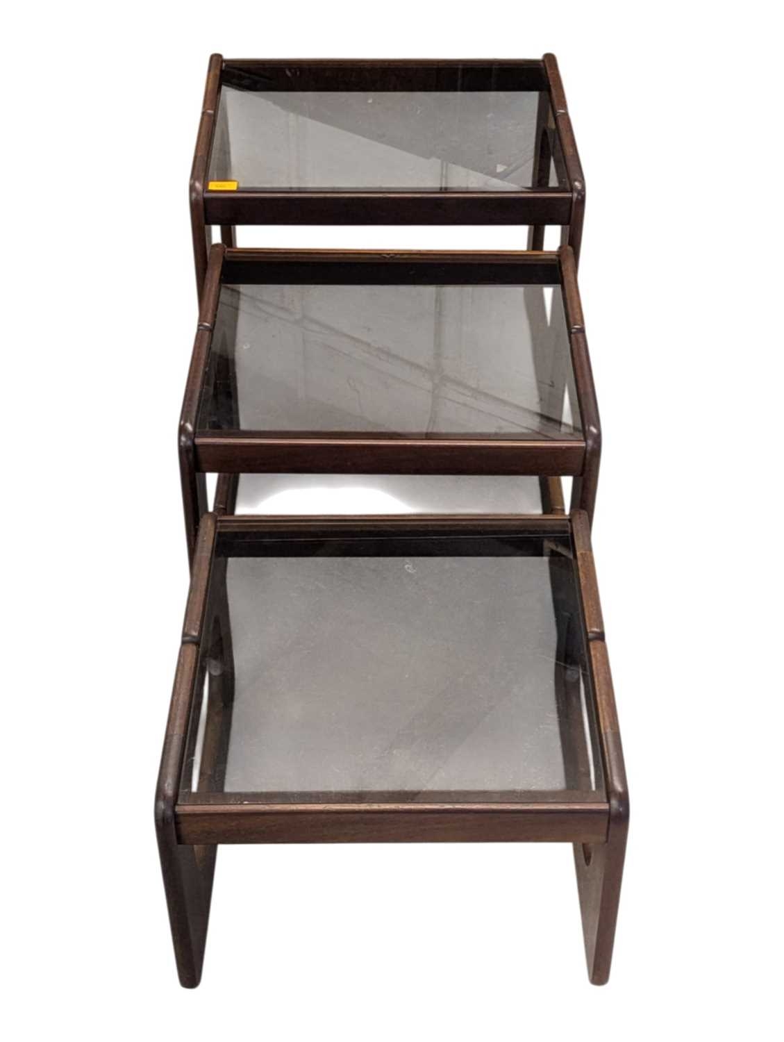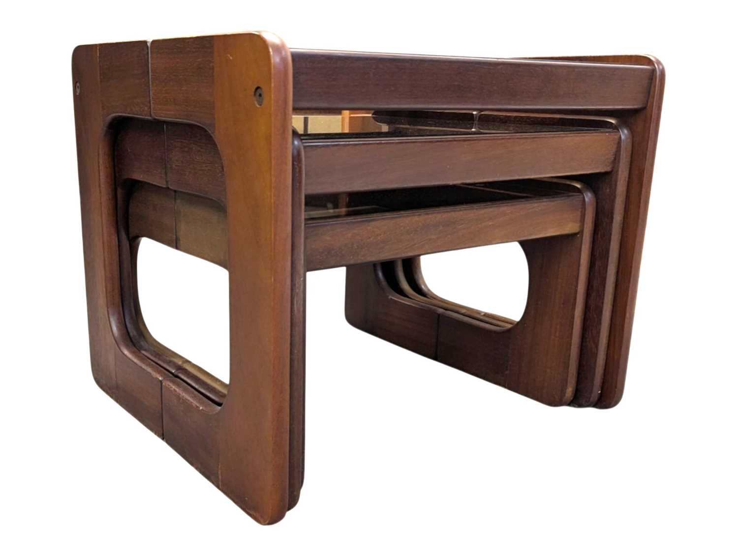 British Modern Design - A vintage 20th century teak and smoked glass nest of tables. Rectangular form with quadrille suppose with smoked glass insert in graduating form. Measures approx: 46x55x48cm