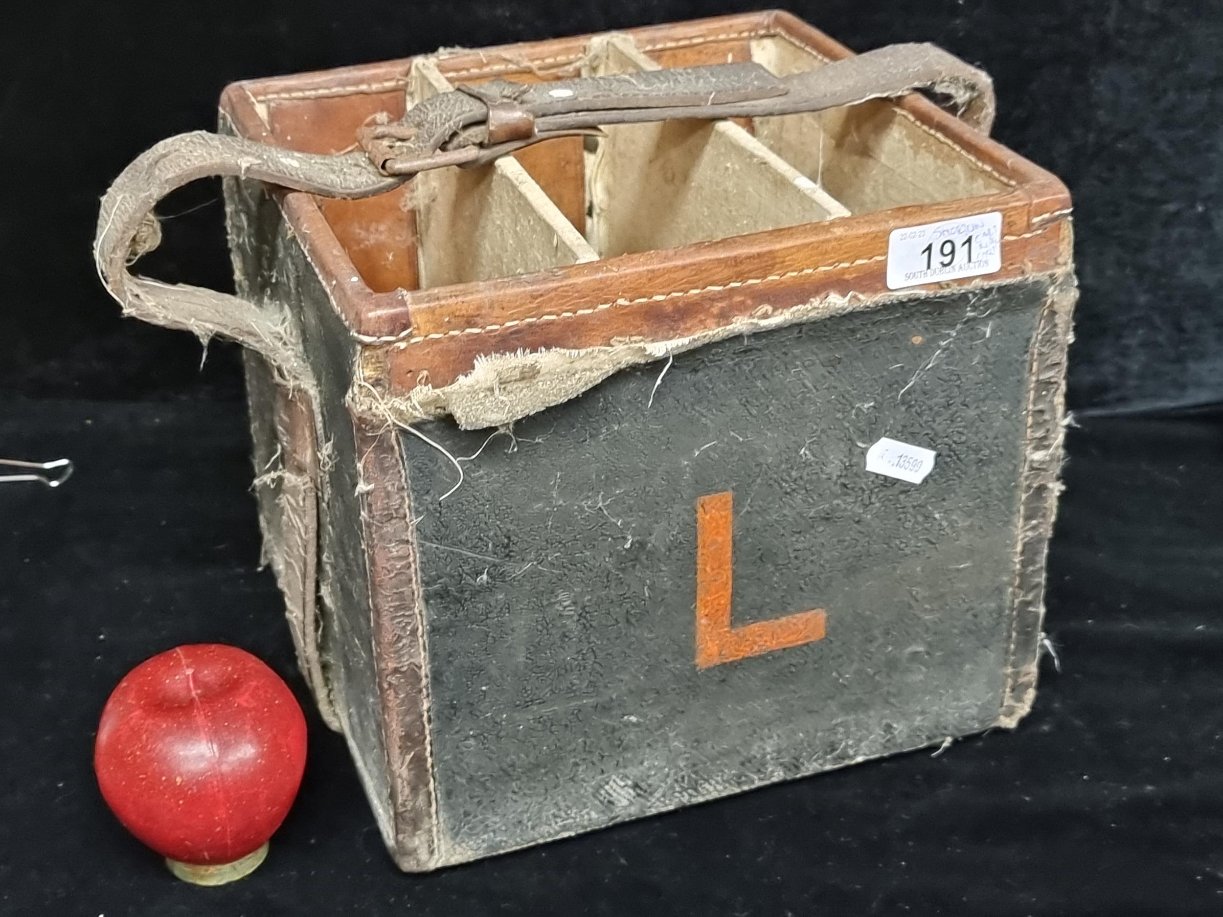 A handsome antique shotgun cartridge case with leather strap handle, brass escutcheon and three neatly sized compartments. Printed with the letters 'X' and 'L' in large letters, possibly had military use. From the large estate in Wicklow.