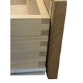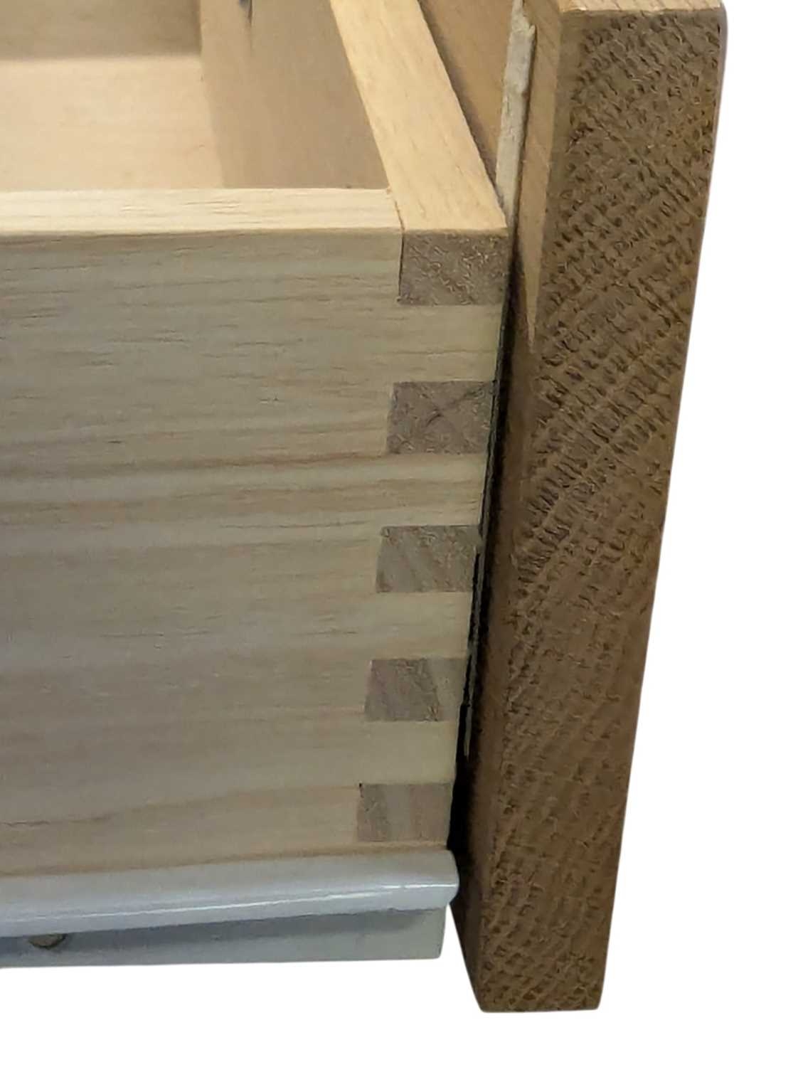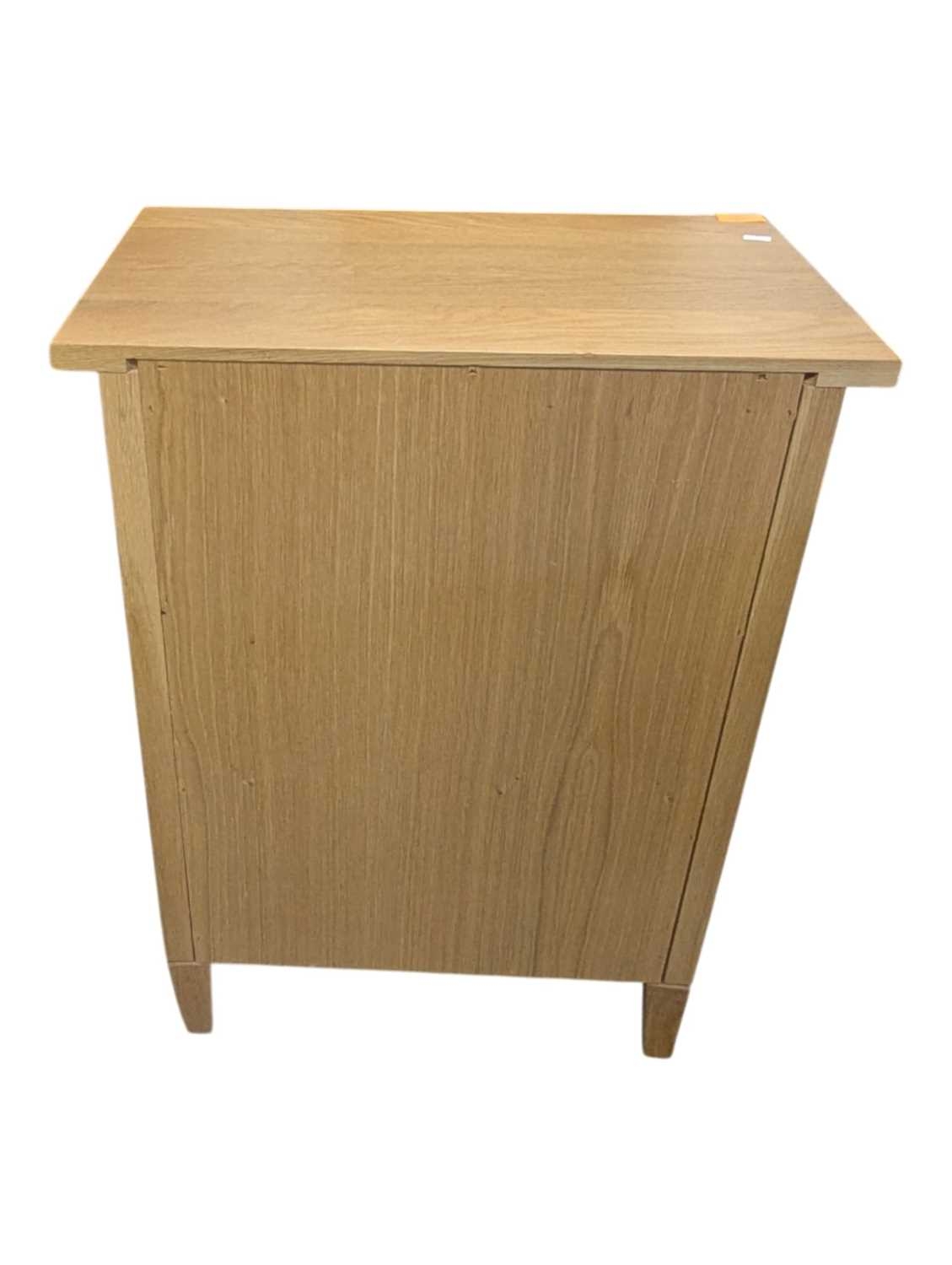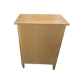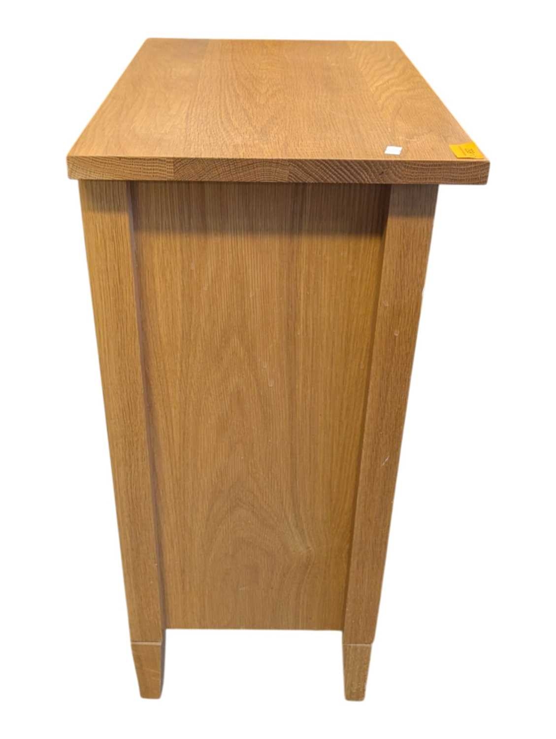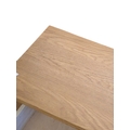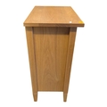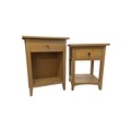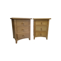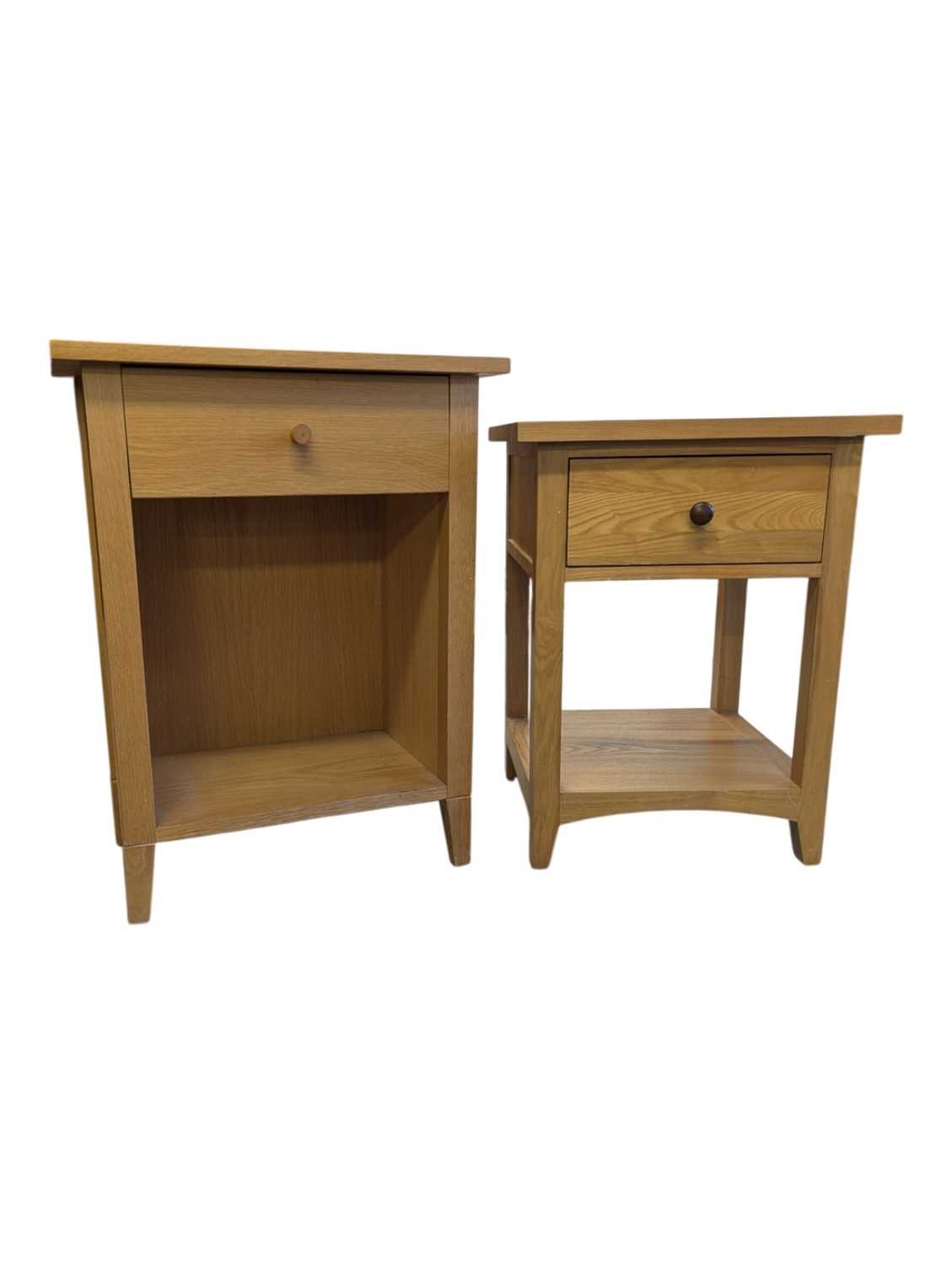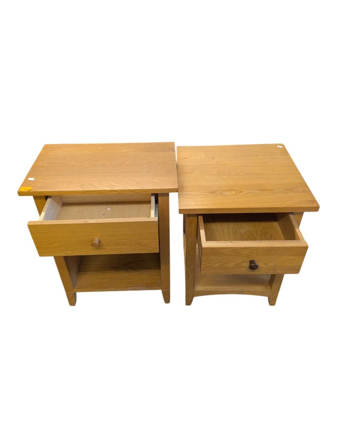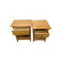 A pair of contemporary oak bedside tables / side tables. Each having overhanging top with drawer beneath on stile supports united by undertier. Measures approx: 72x54x34cm