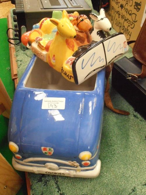 POTTERY NOVELTY BISCUIT BARREL OF CAR WITH COOKIES AND ANIMALS