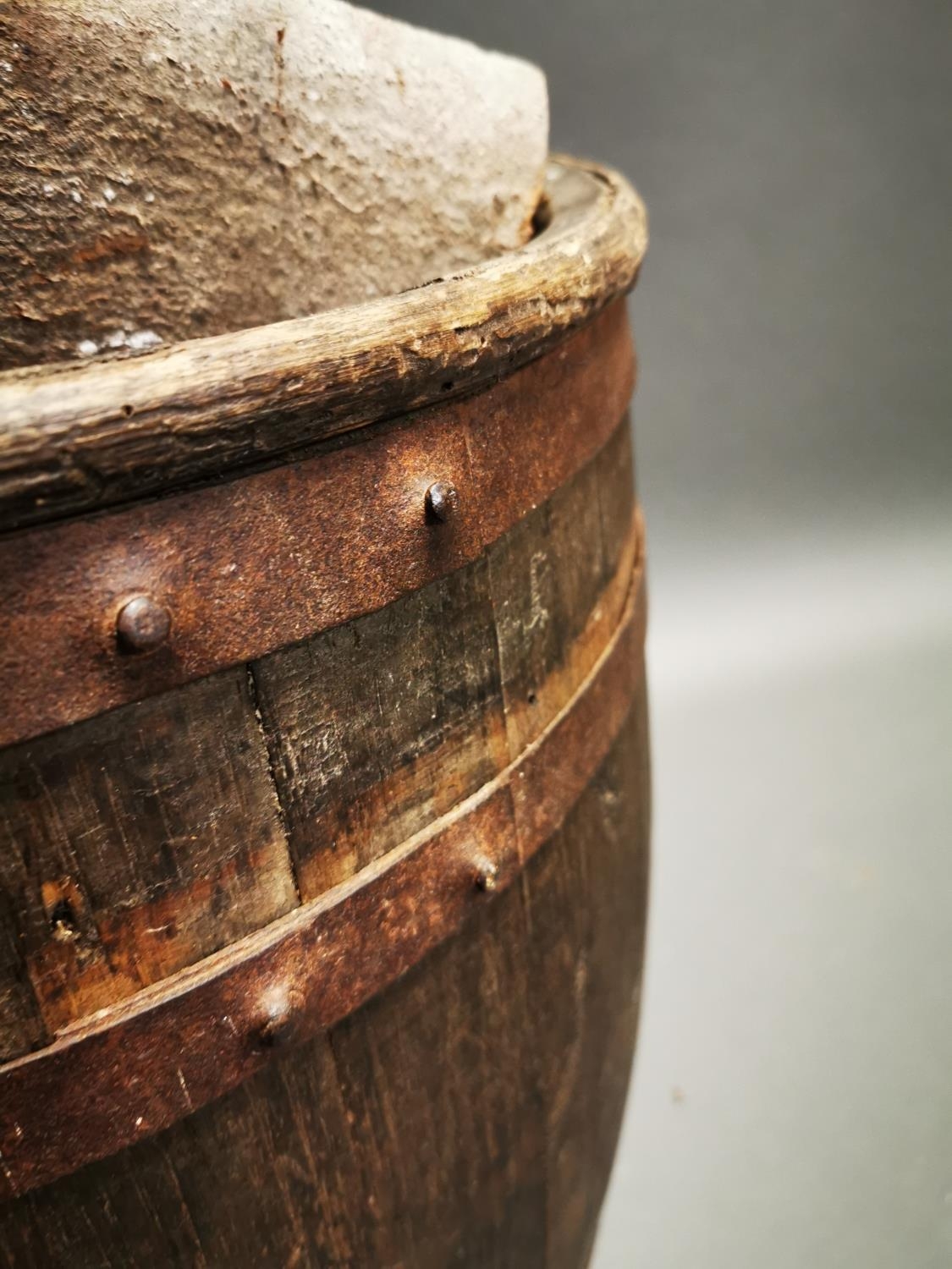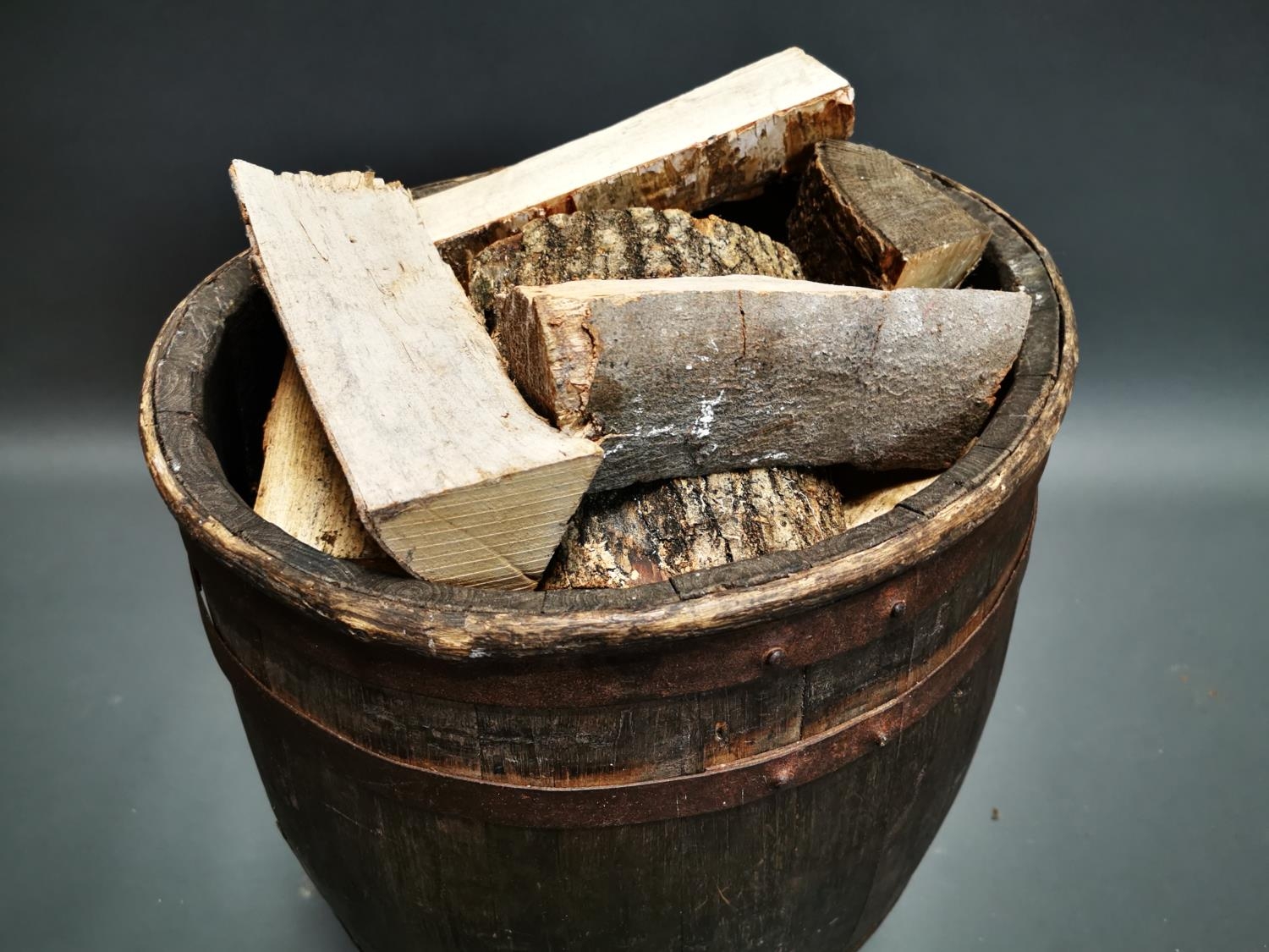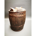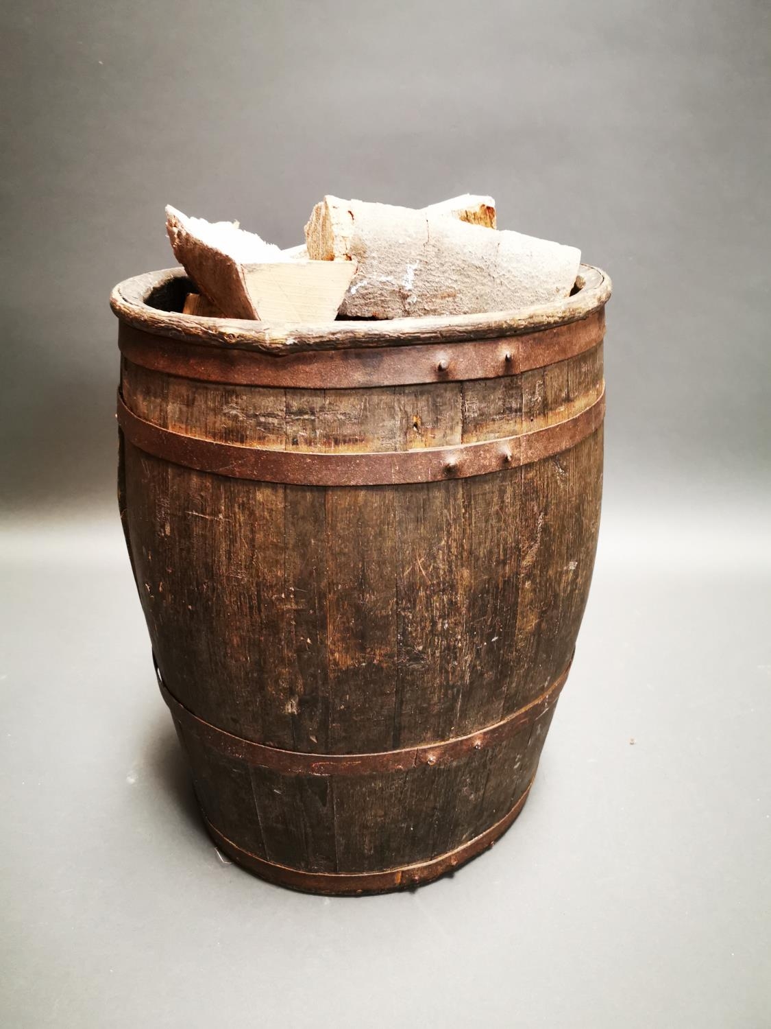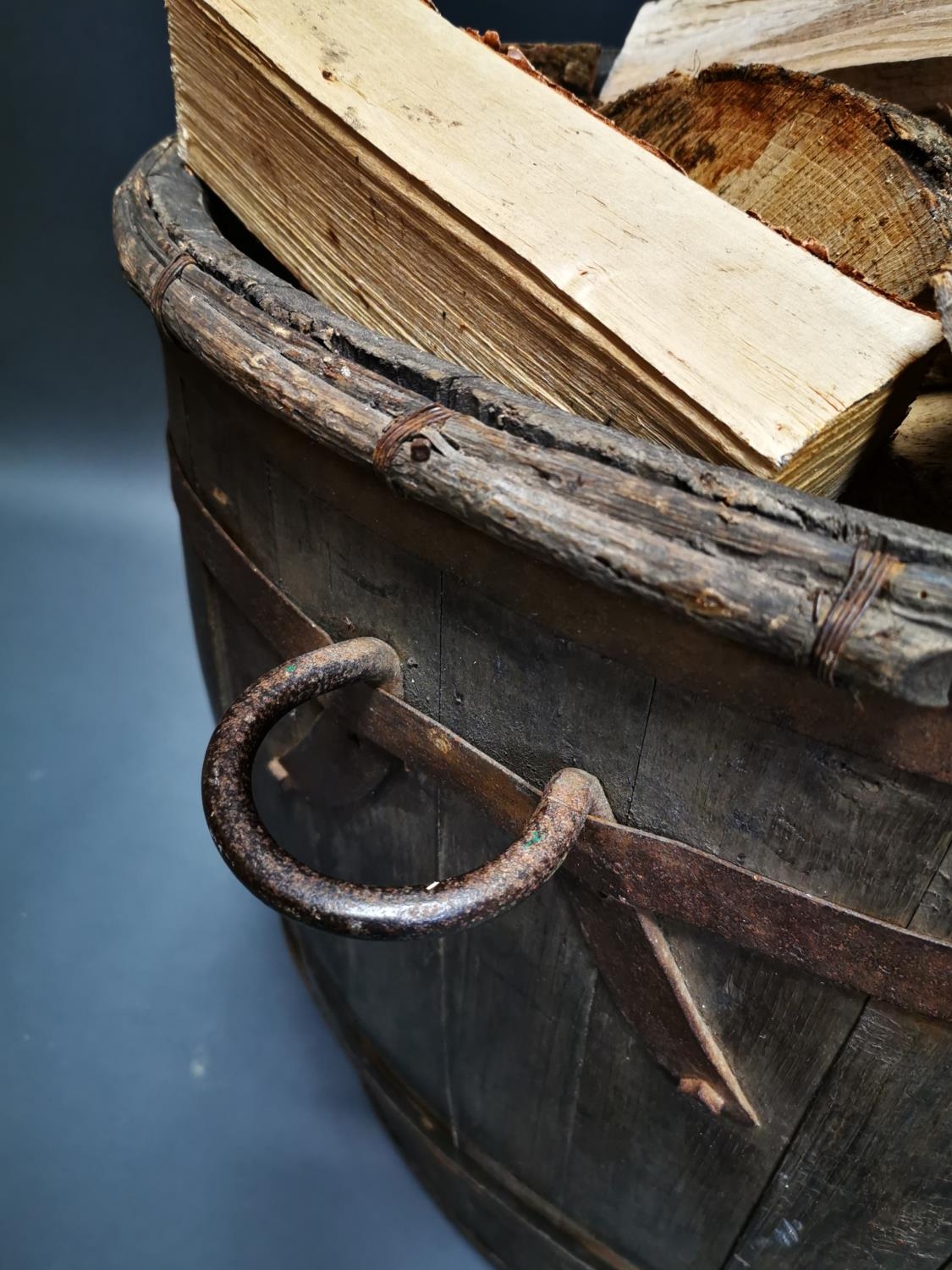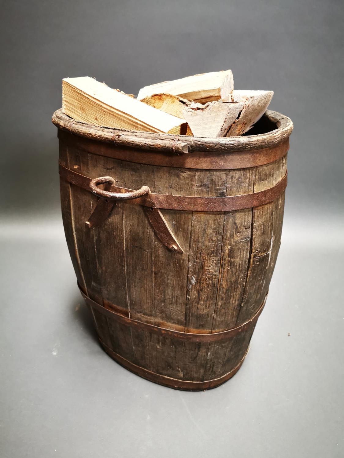 Early 20th C. metal bound log bucket with wrought iron handle {59 cm H x 47 cm W x 46 cm D}.