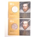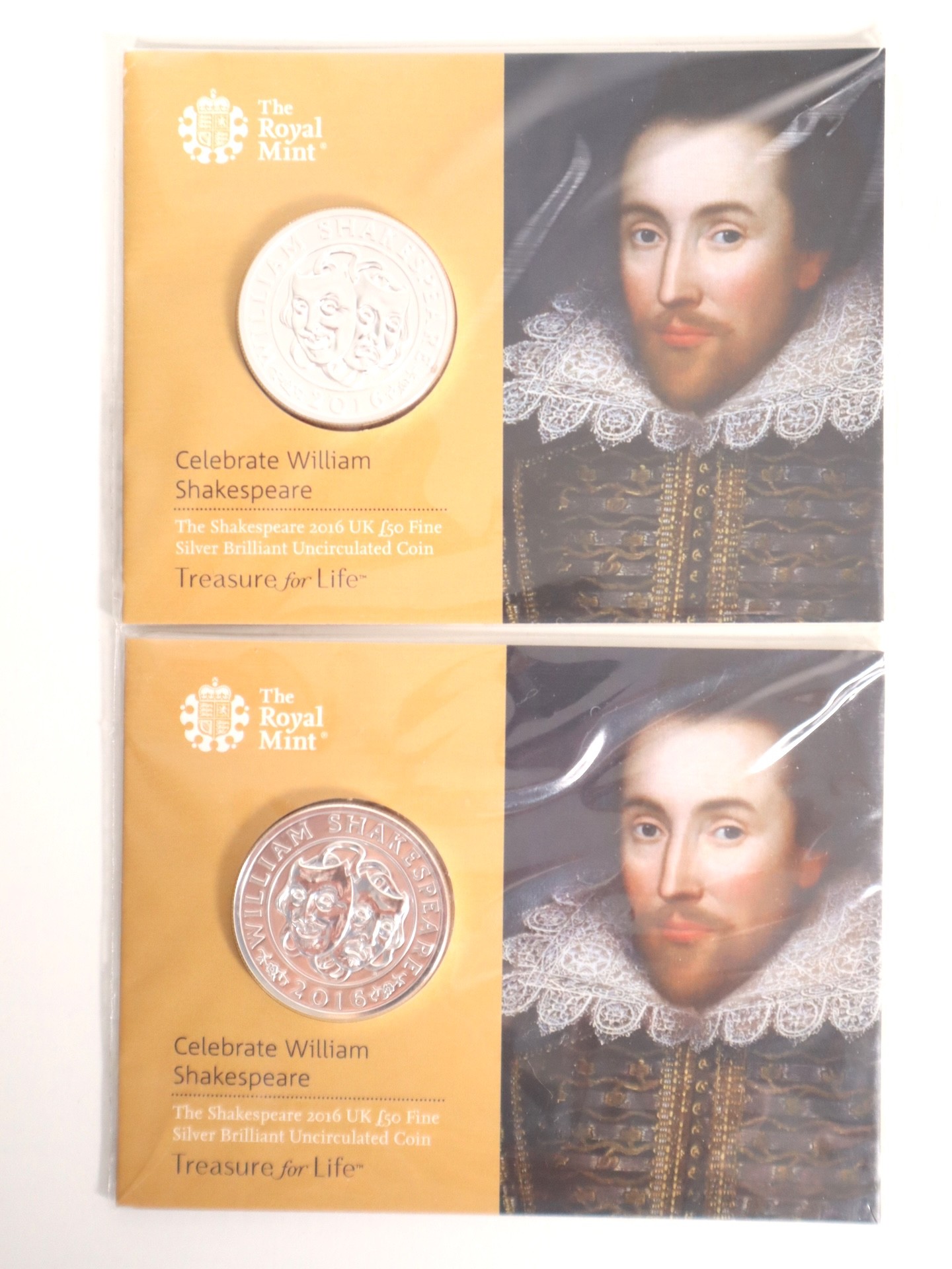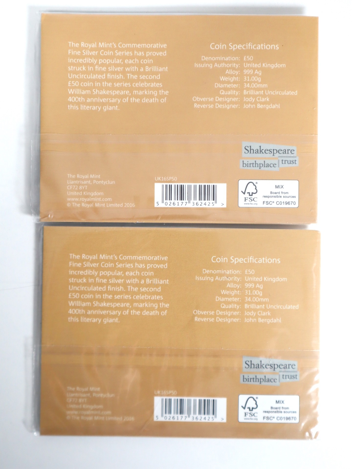 Two The Shakespeare 2016 UK £50 Fine Silver Brilliant Uncirculated Coins 999Ag 31g each