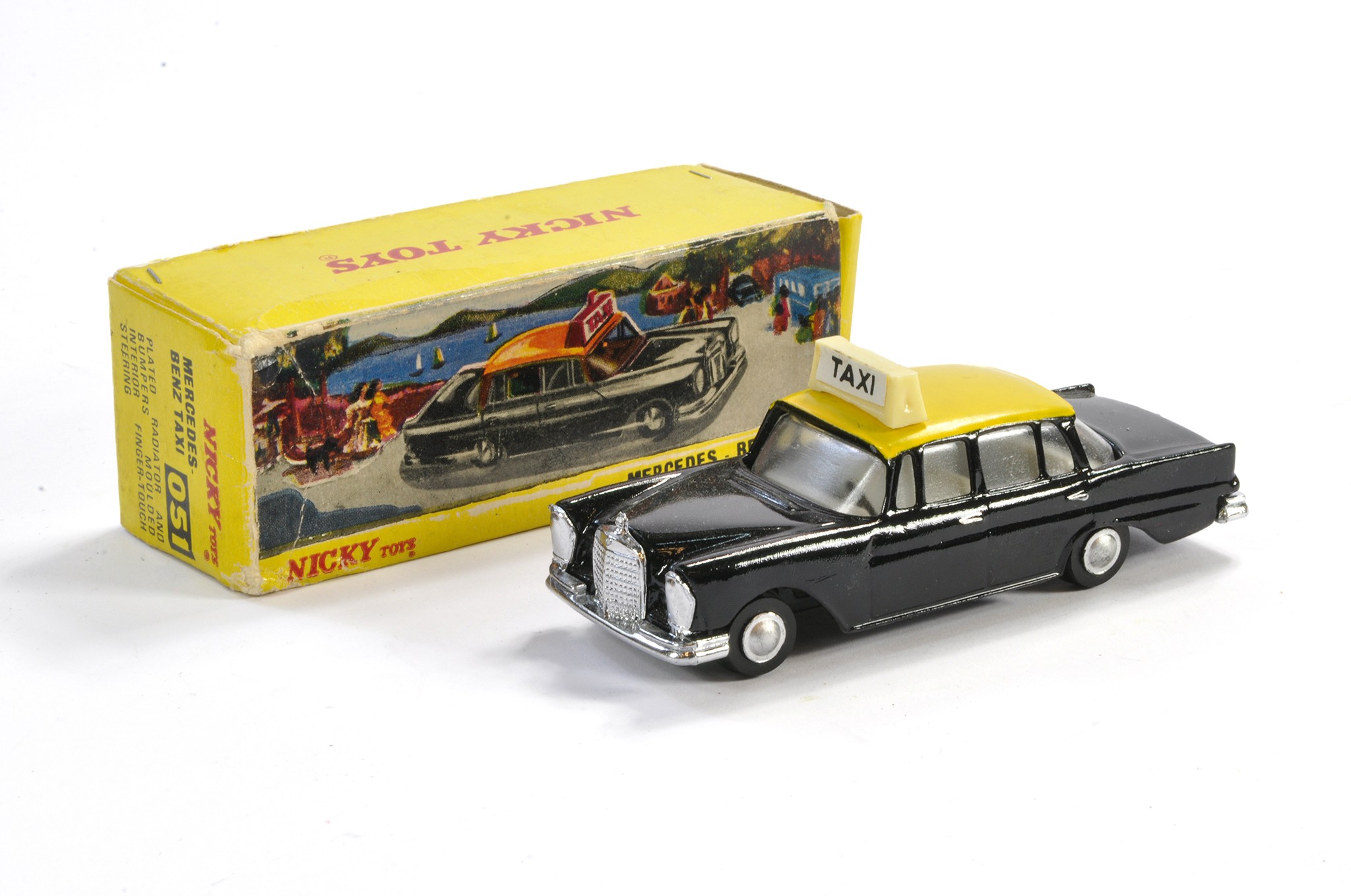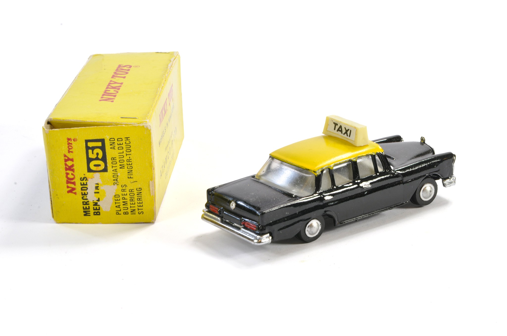 Dinky (Nicky) Toys No. 051 Mercedes Benz Taxi. Black and Yellow with white interior. Generally excellent with very little sign of wear in good to very good original box.