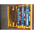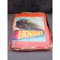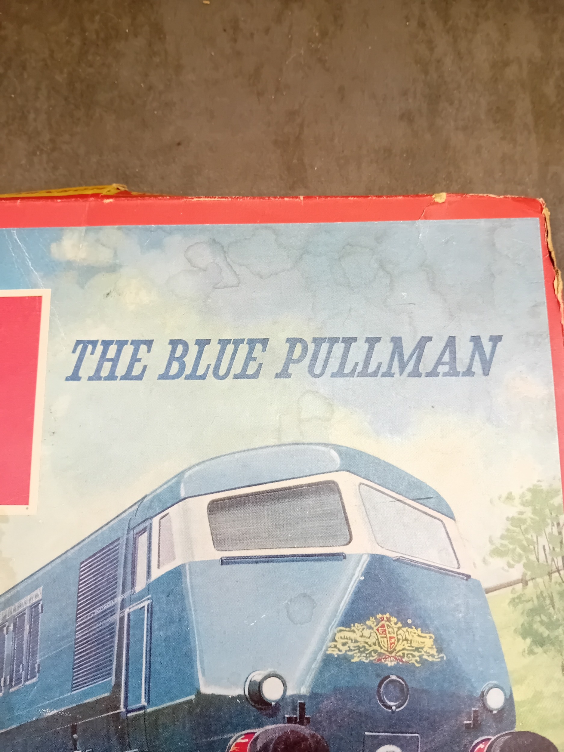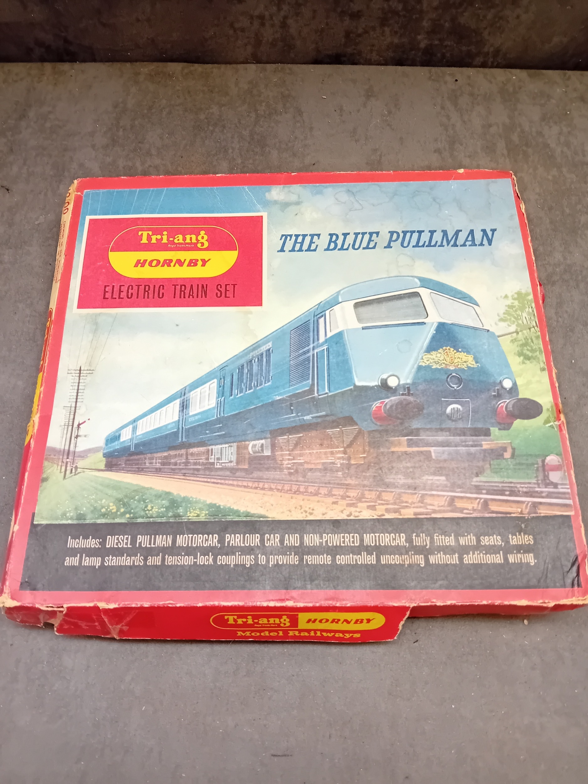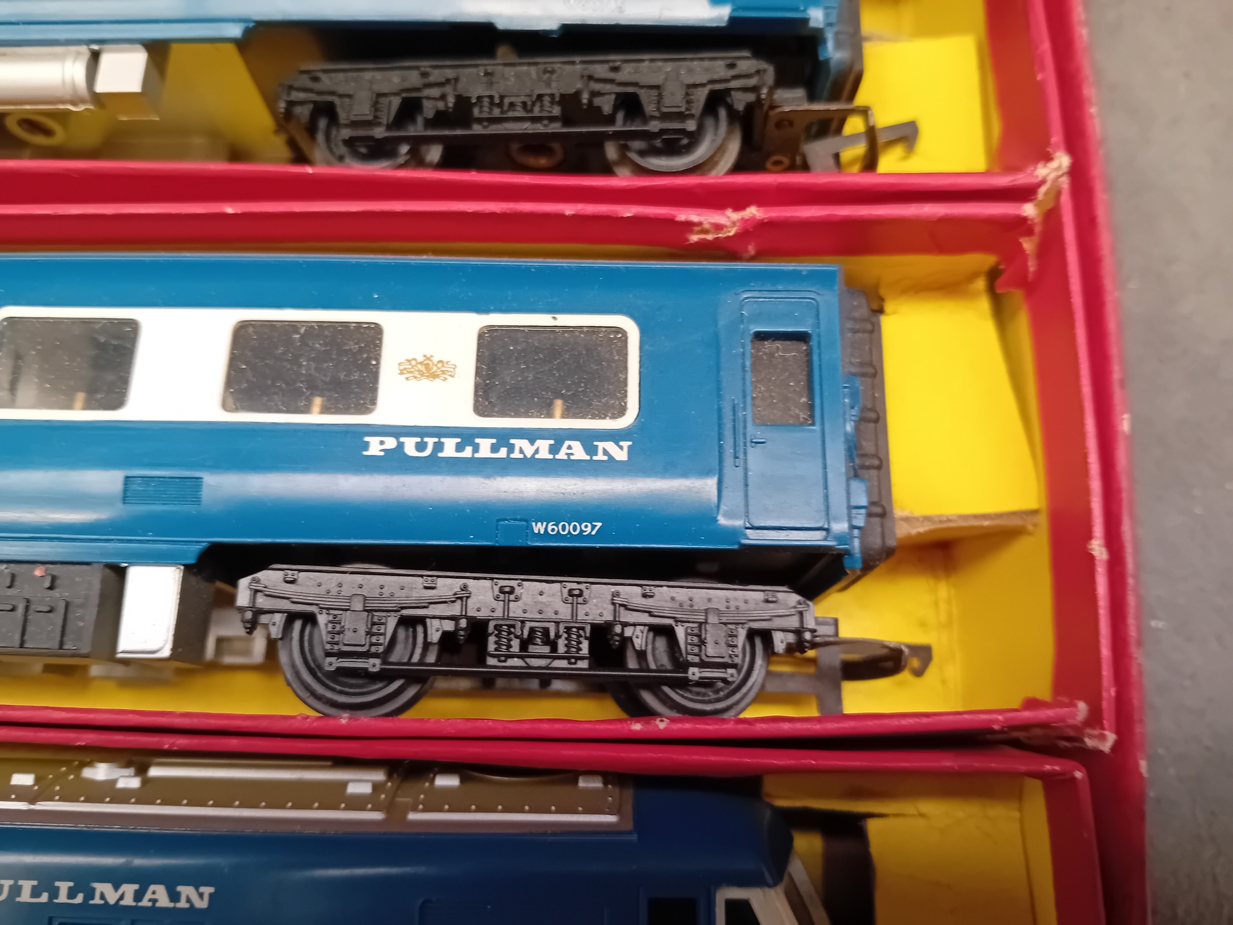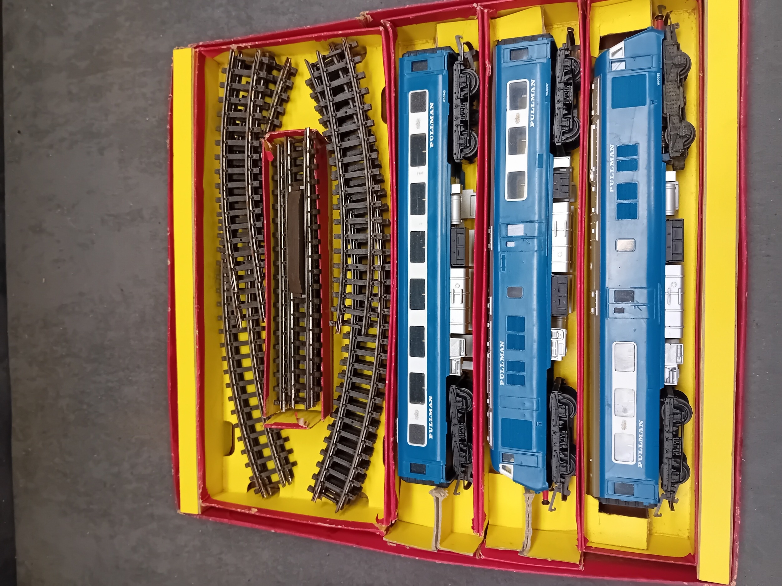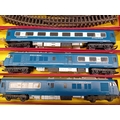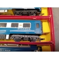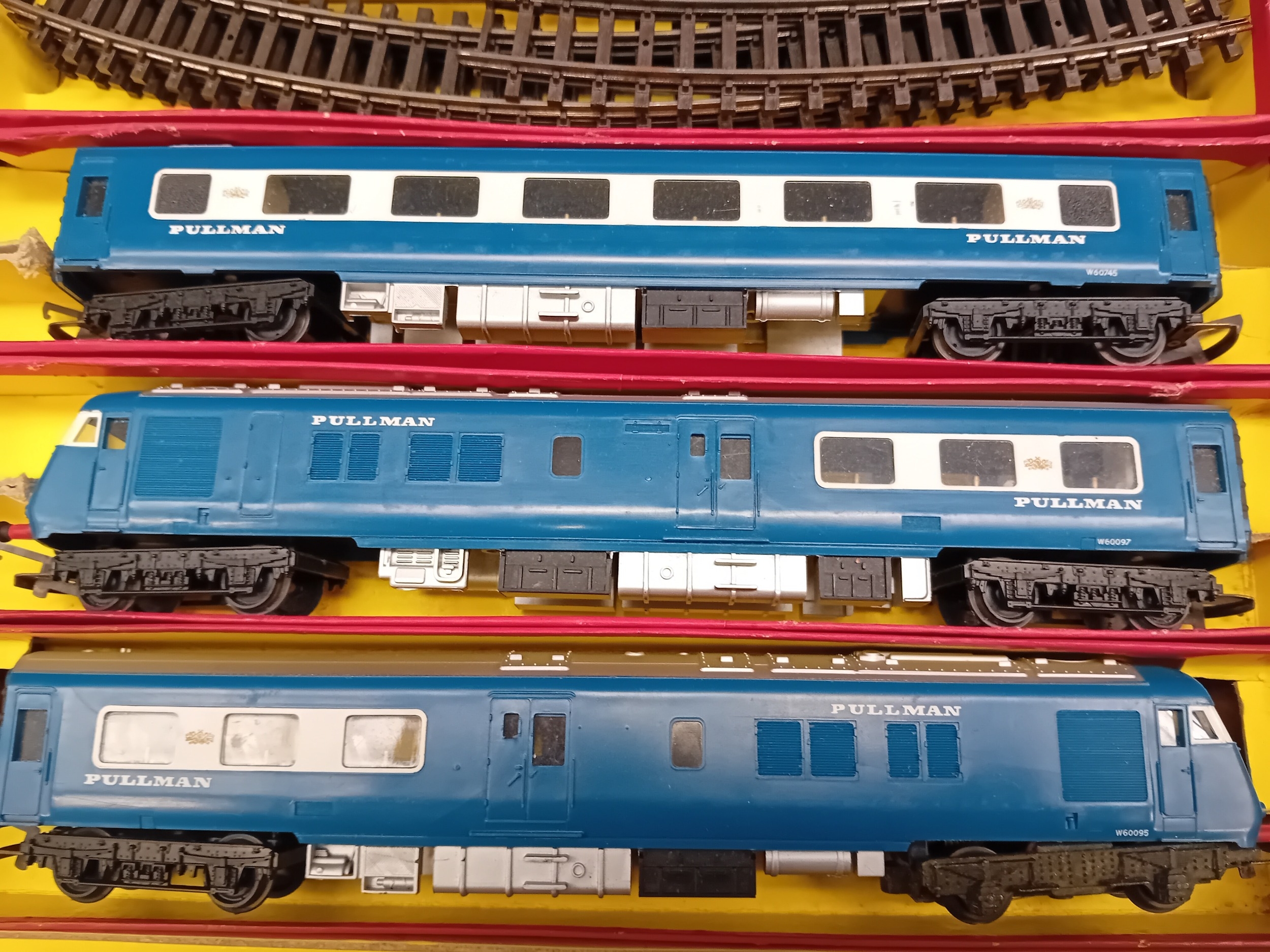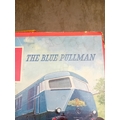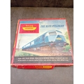 A Tri-ang Hornby Railways 'The Blue Pullman' RS52 electric train set, presented in its original cardboard box. The set includes a blue and silver diesel locomotive featuring a distinctive crest on its front, two matching Pullman coaches visibly marked "PULLMAN" and numbered W60095 and W60097, and numerous sections of track. The trains are constructed from plastic and metal components, nestled within worn yellow cardboard inserts.