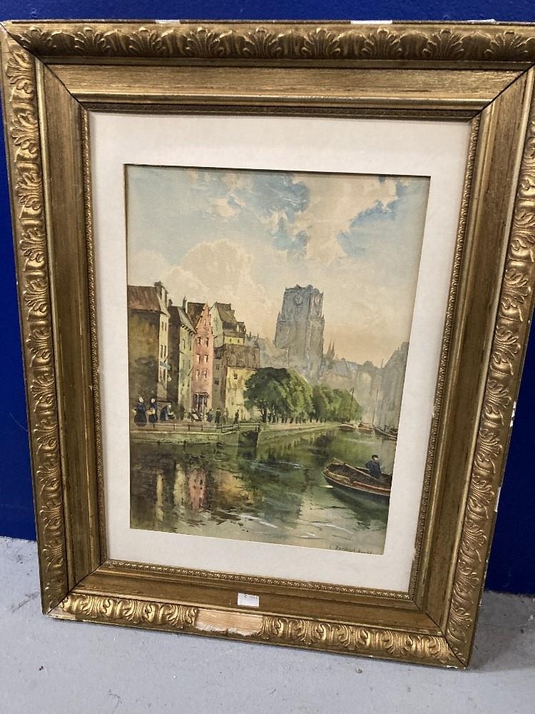 Louis Burleigh Bruhl 1861-1942 print of an inland waterway, possibly Dutch. 12ins. x 16ins.