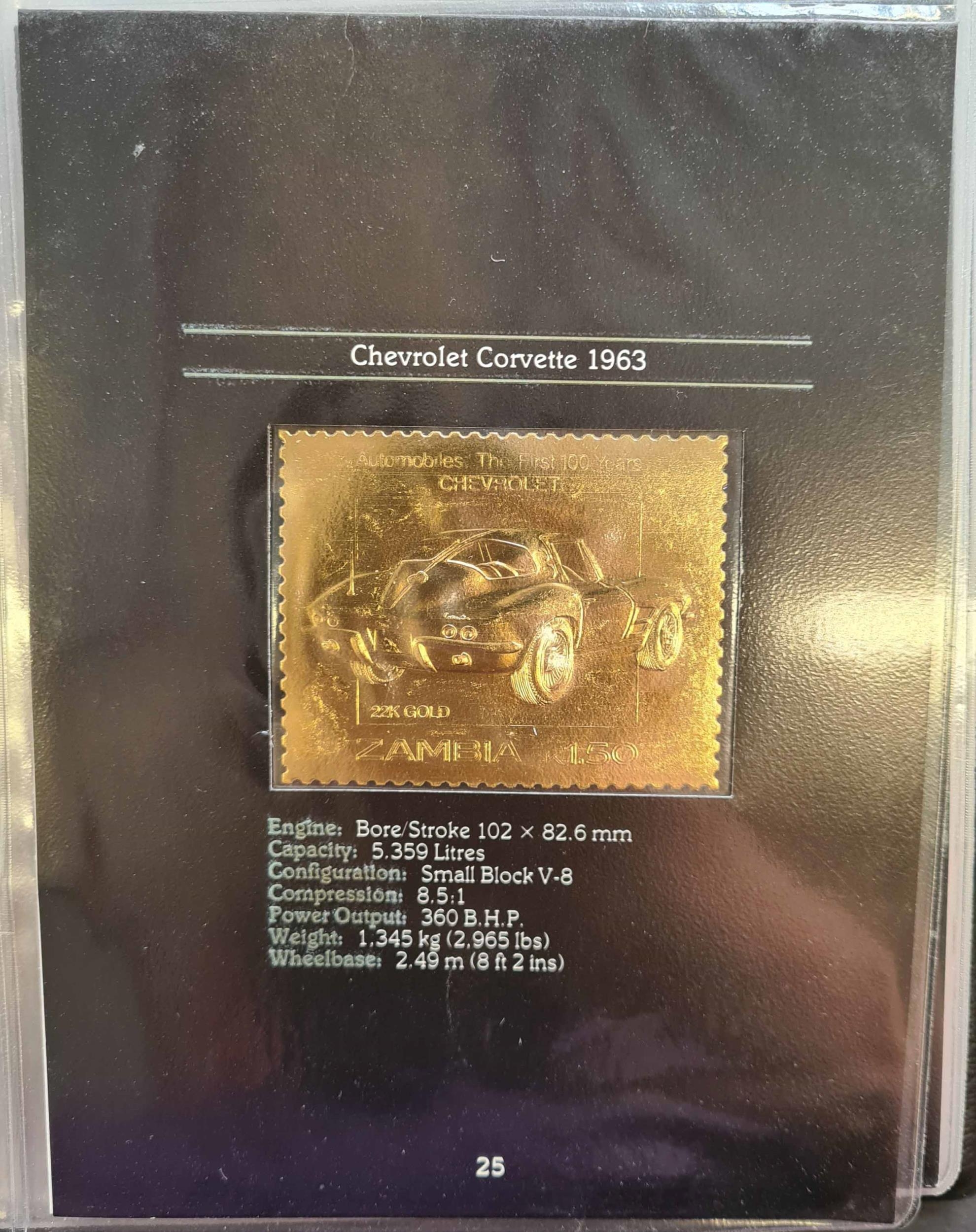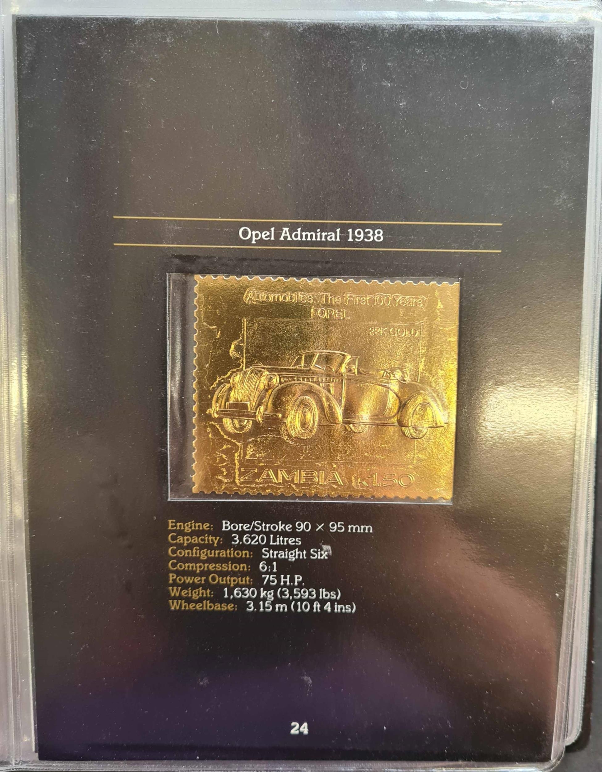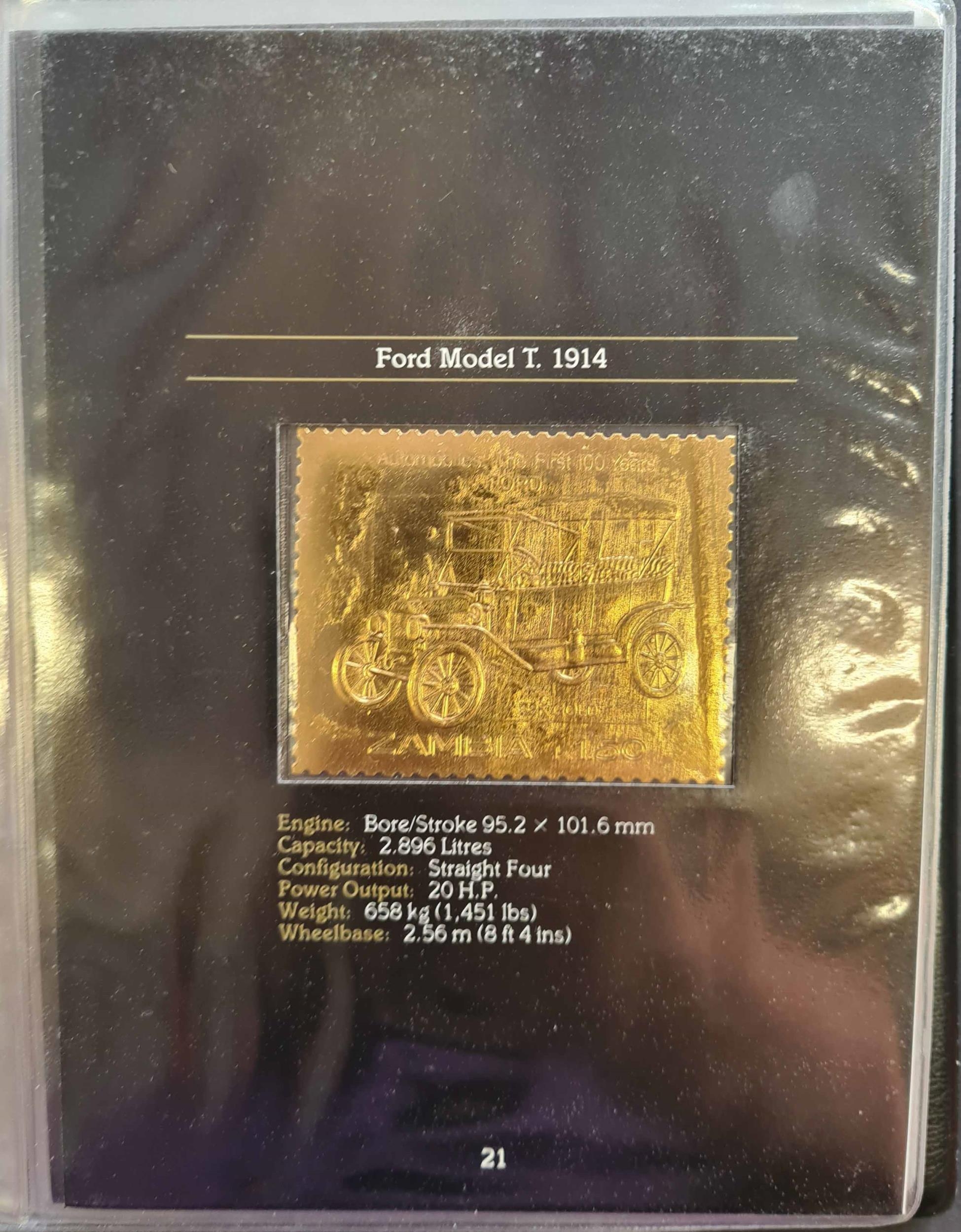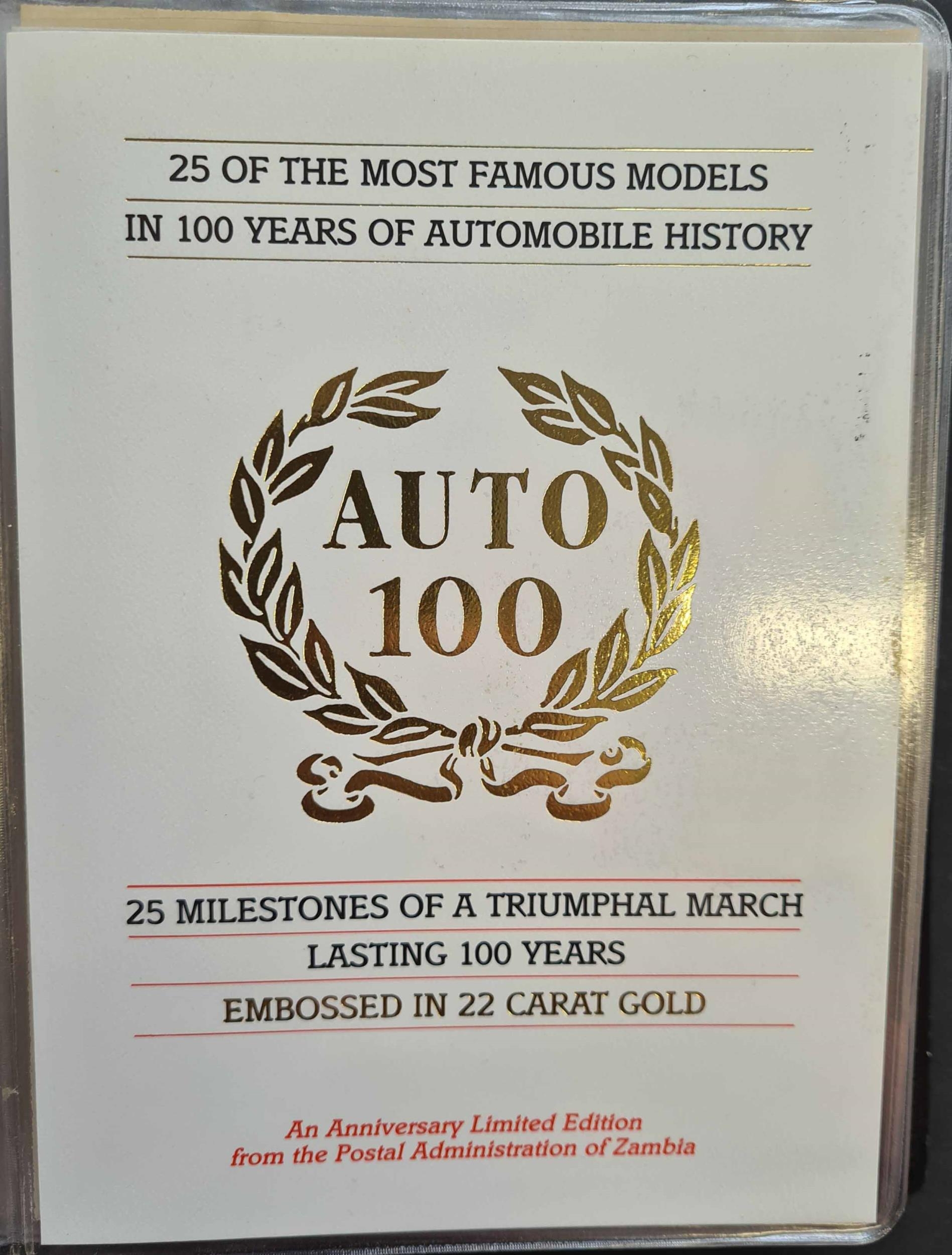 CARS: An album containing 22 carat gold embossed stamps representing 24 of the 25 most famous models in 100 years of automobile history. Issued by the Postal Administration of Zambia. Collection 574 (limited edition of 3000) contained in a special binder.Cross Reference: AUTOMOBILES, TRANSPORT