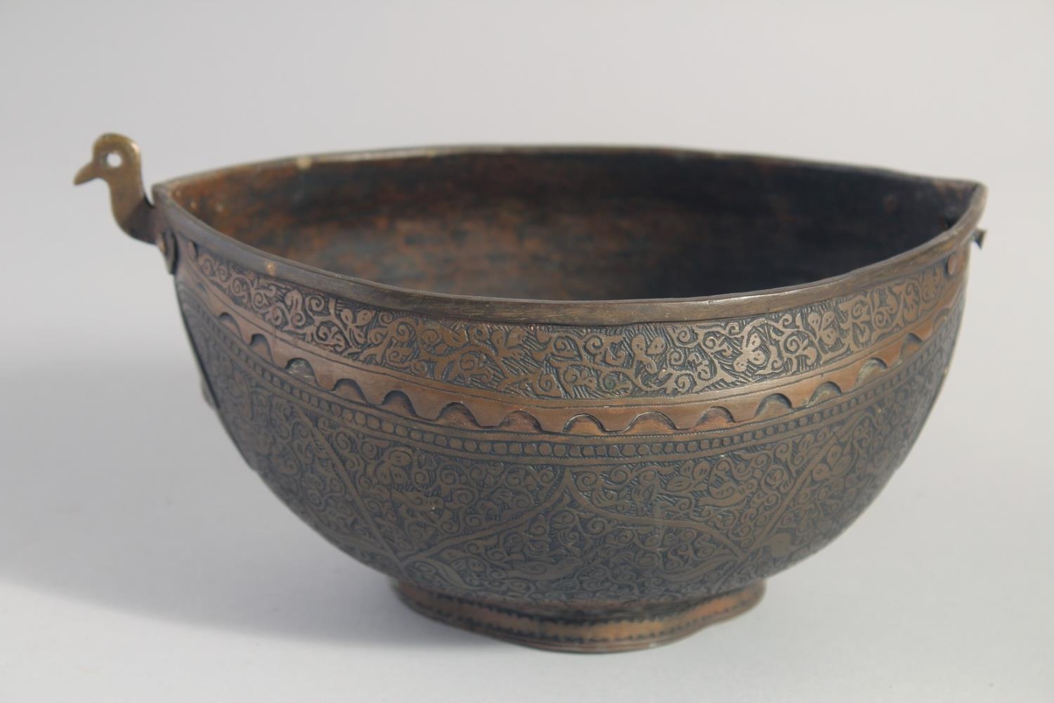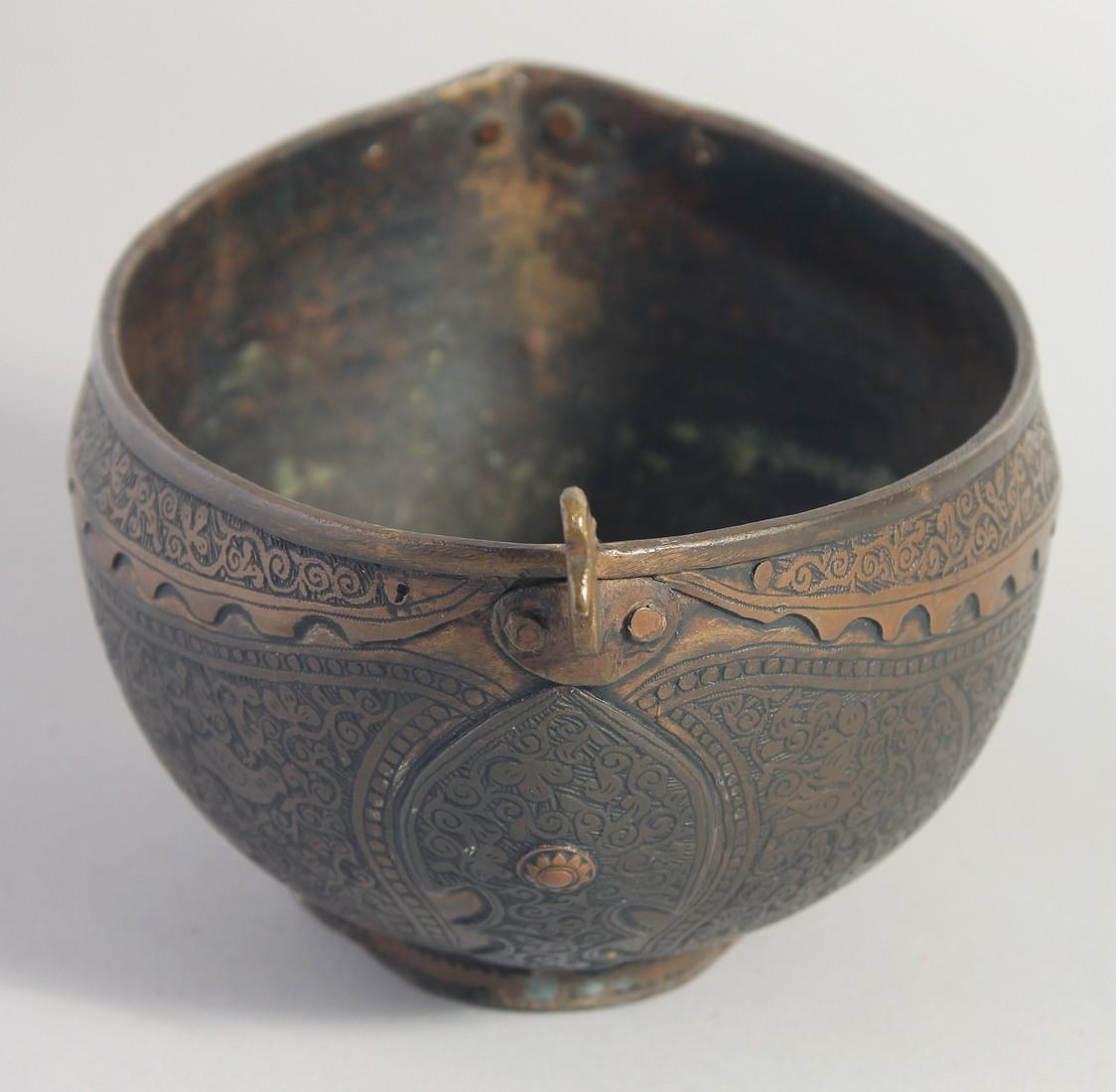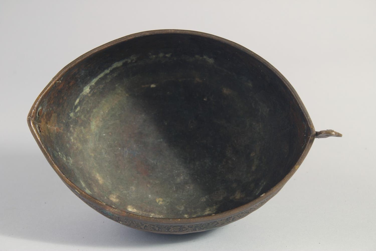AN ISLAMIC ENGRAVED BRASS KASHKOOL, 20.5cm wide.