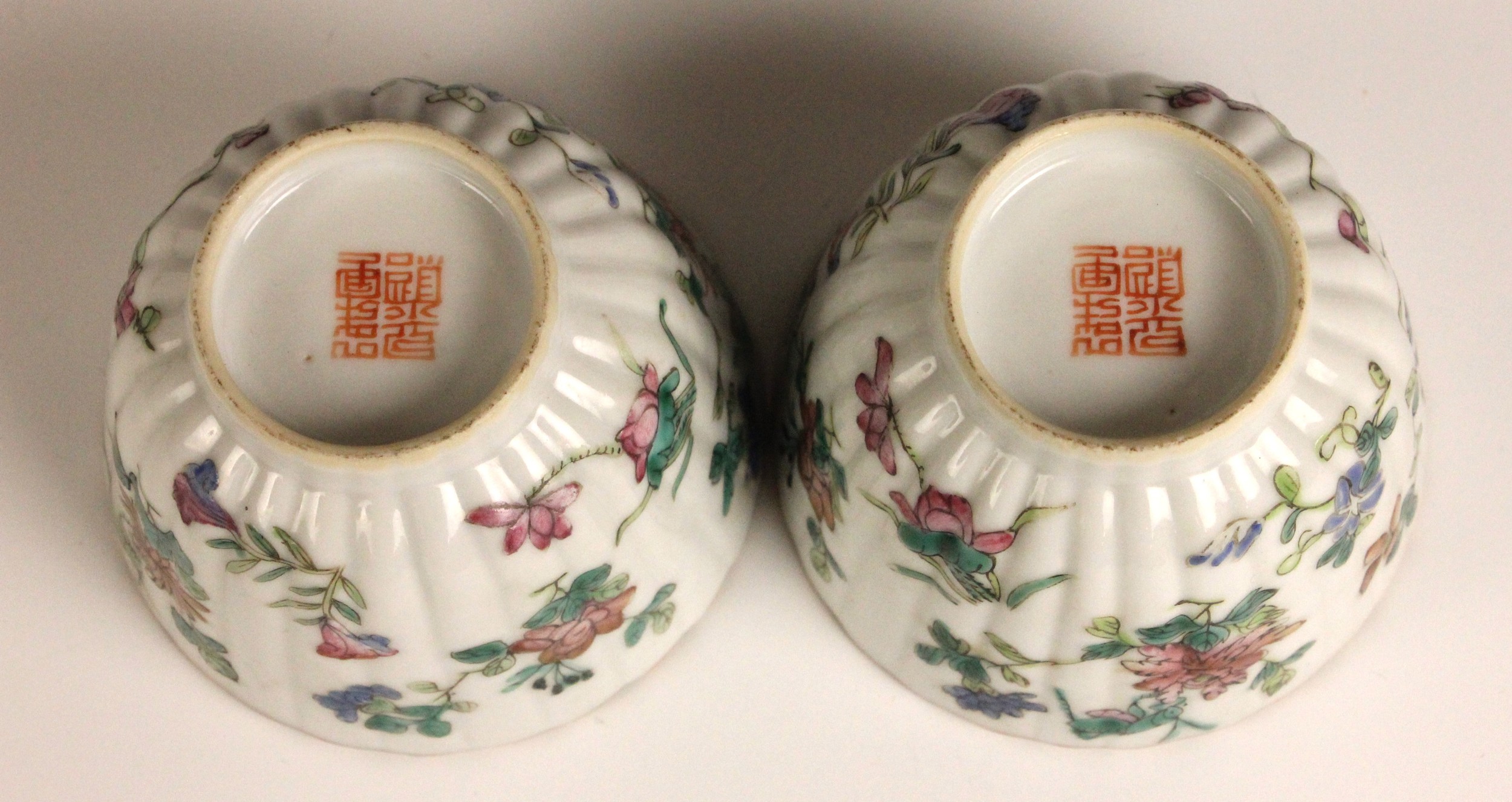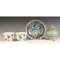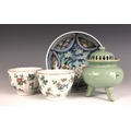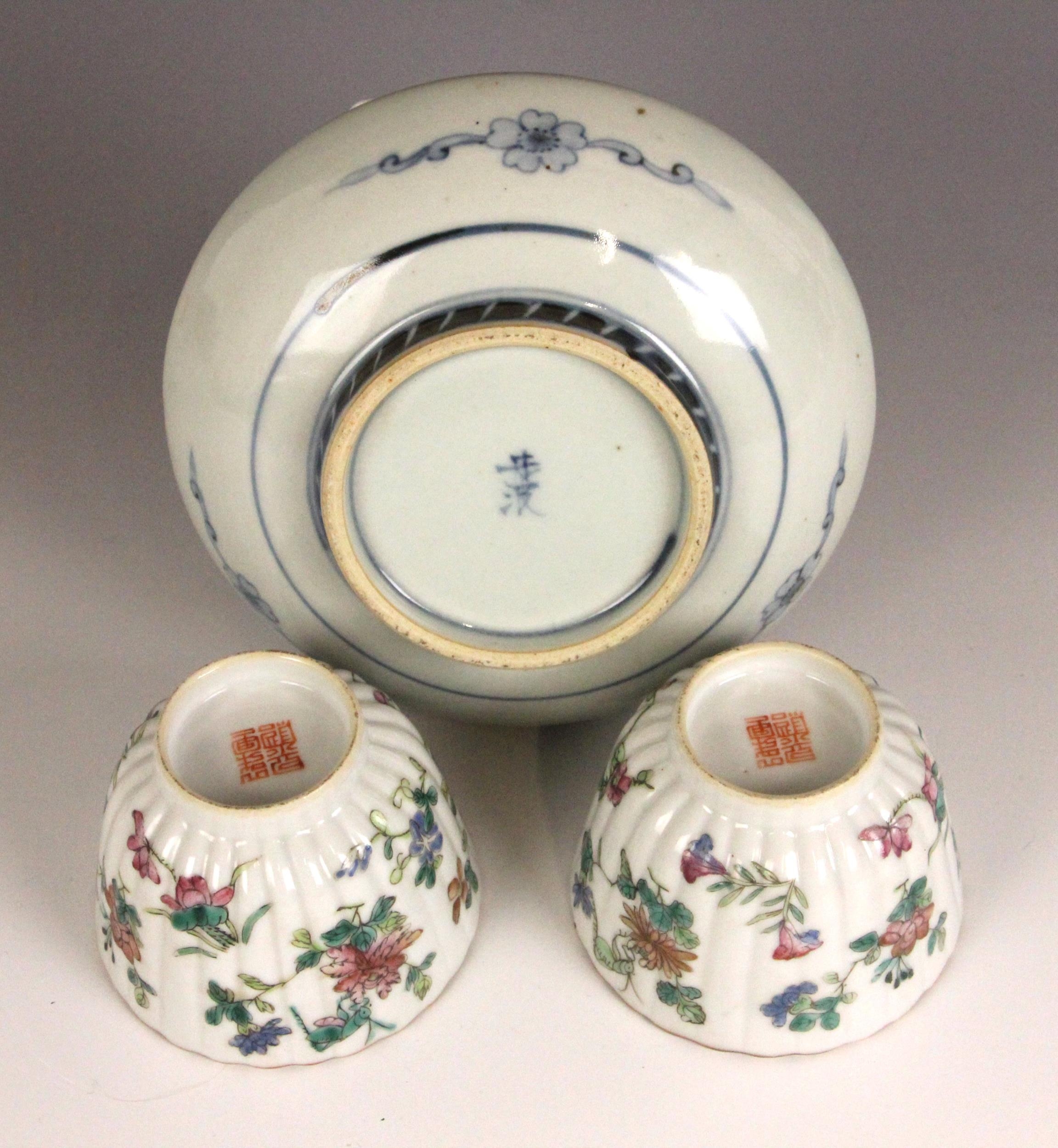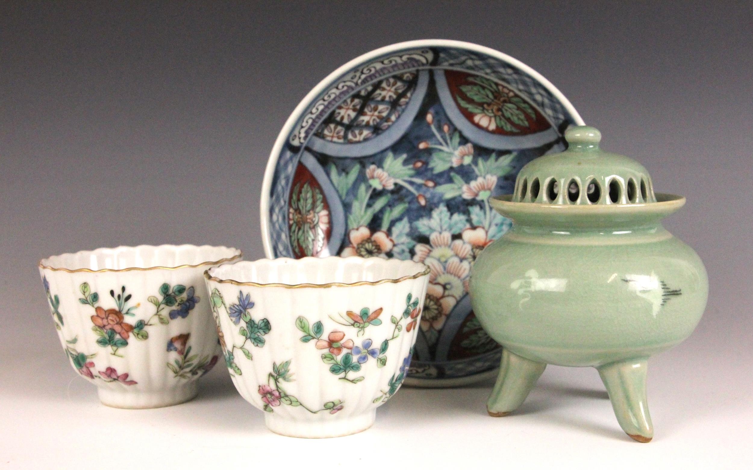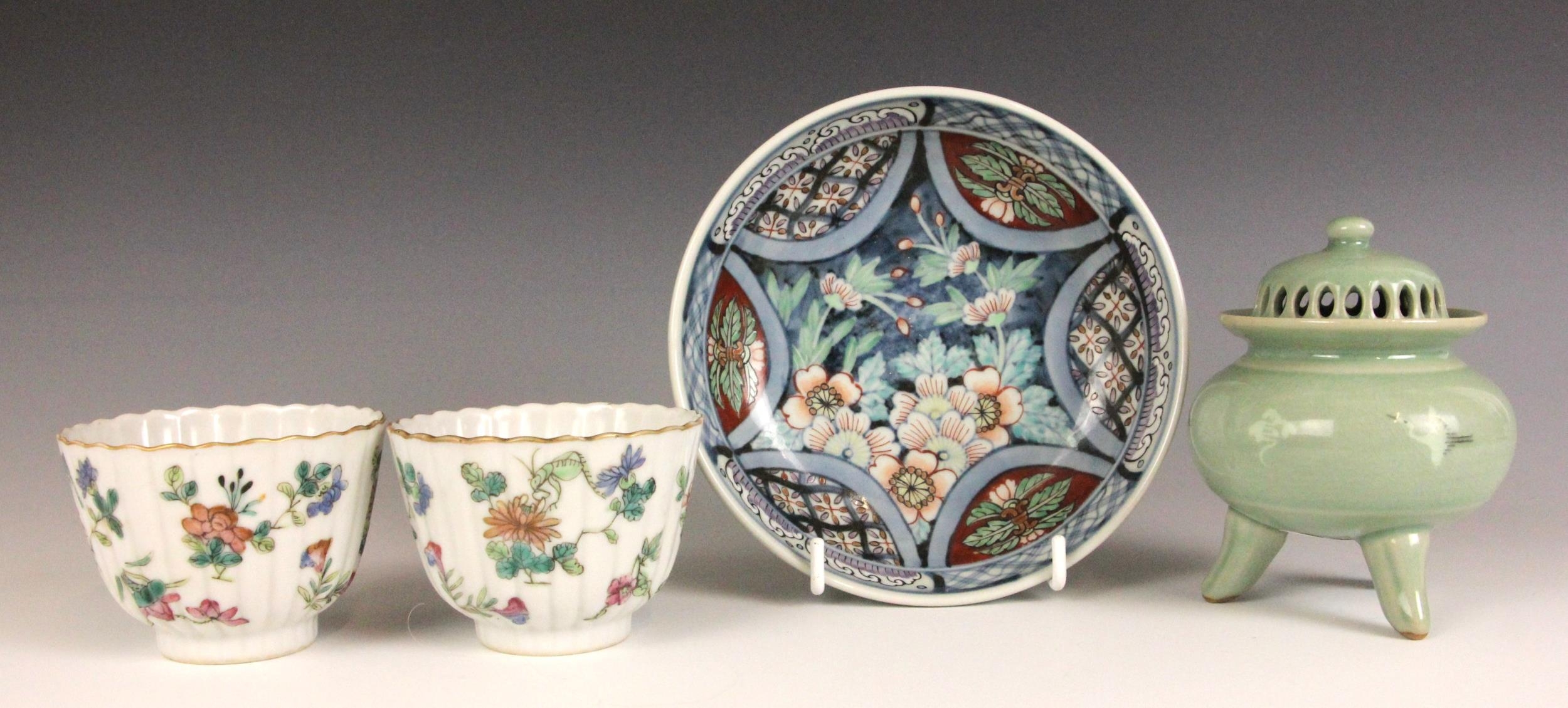 A pair of Chinese porcelain tea bowls, Guangxu (1875–1908), each of fluted circular form and painted to the exterior flora and fauna, iron-red seal mark to the undersides, 6cm high, with a Japanese celadon koro and cover, 10cm high, and a Japanese Imari dish, 15.5cm diameter (4)