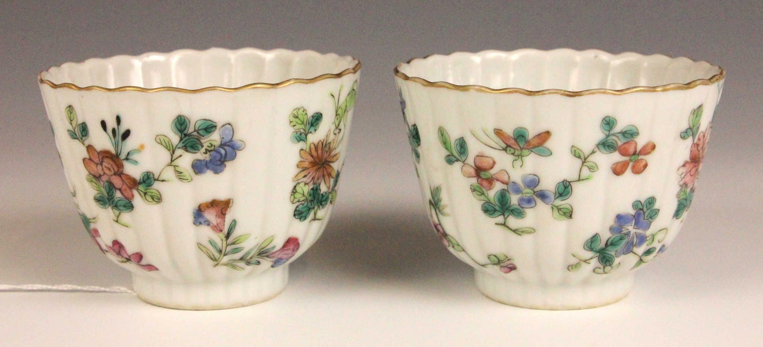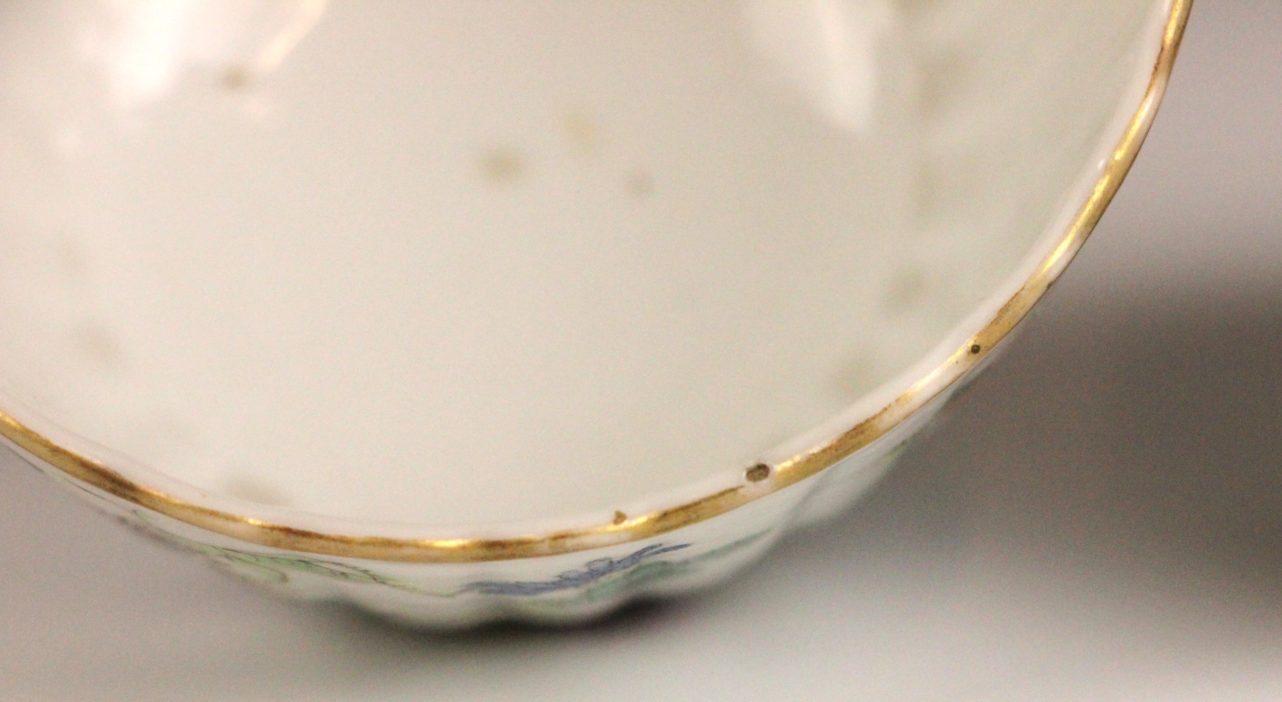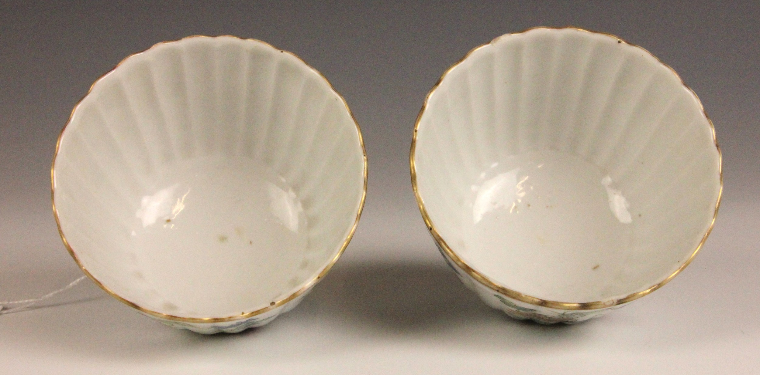 One tea bowl shows a small chip, further nibbles, a small glazing fault and rubbing to the gilt of the rim. The other shows nibbles and rubbing to the rim. Both shows pits and frits to the interiors, and surface wear to the exteriors, but no obvious cracks, crazing or evidence of restoration.