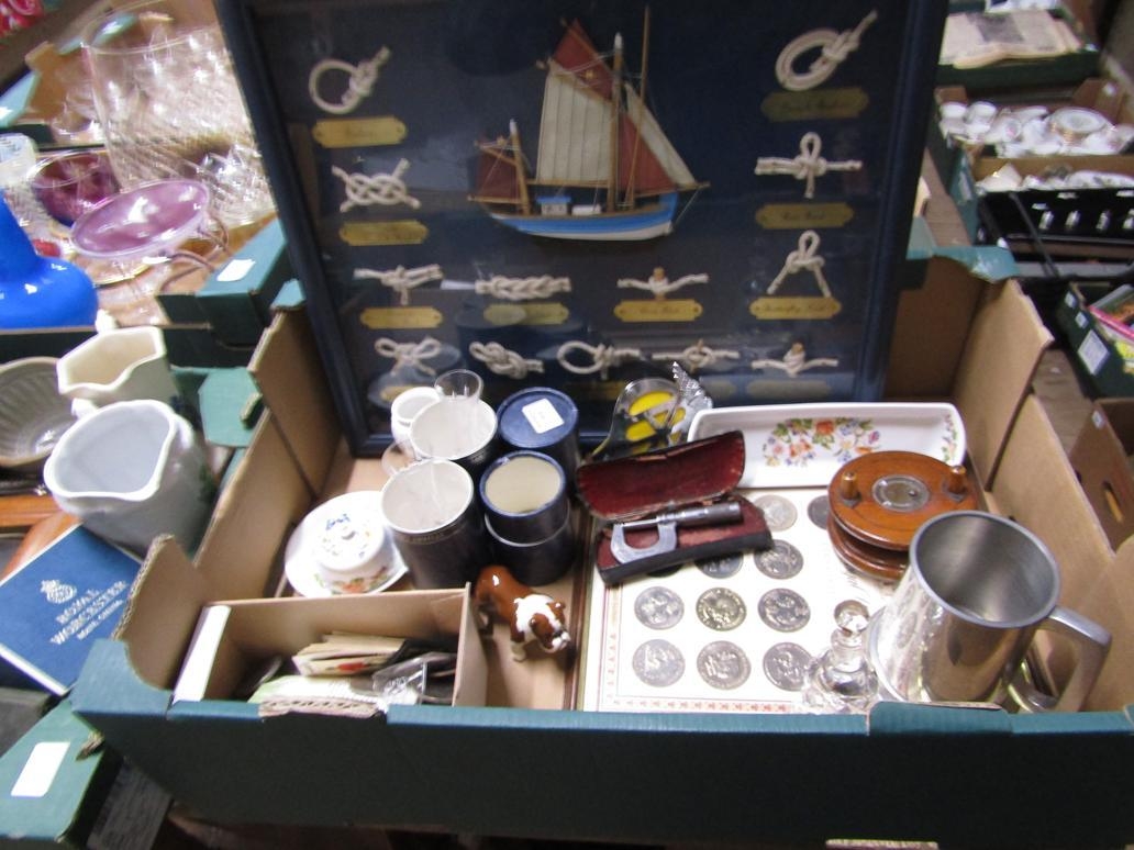 BOX OF MISC TO INCL KNOT PICTURE, FISHING REEL, TANKARD ETC