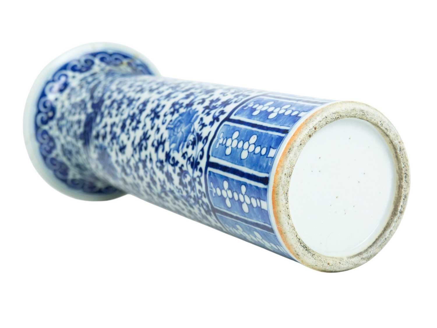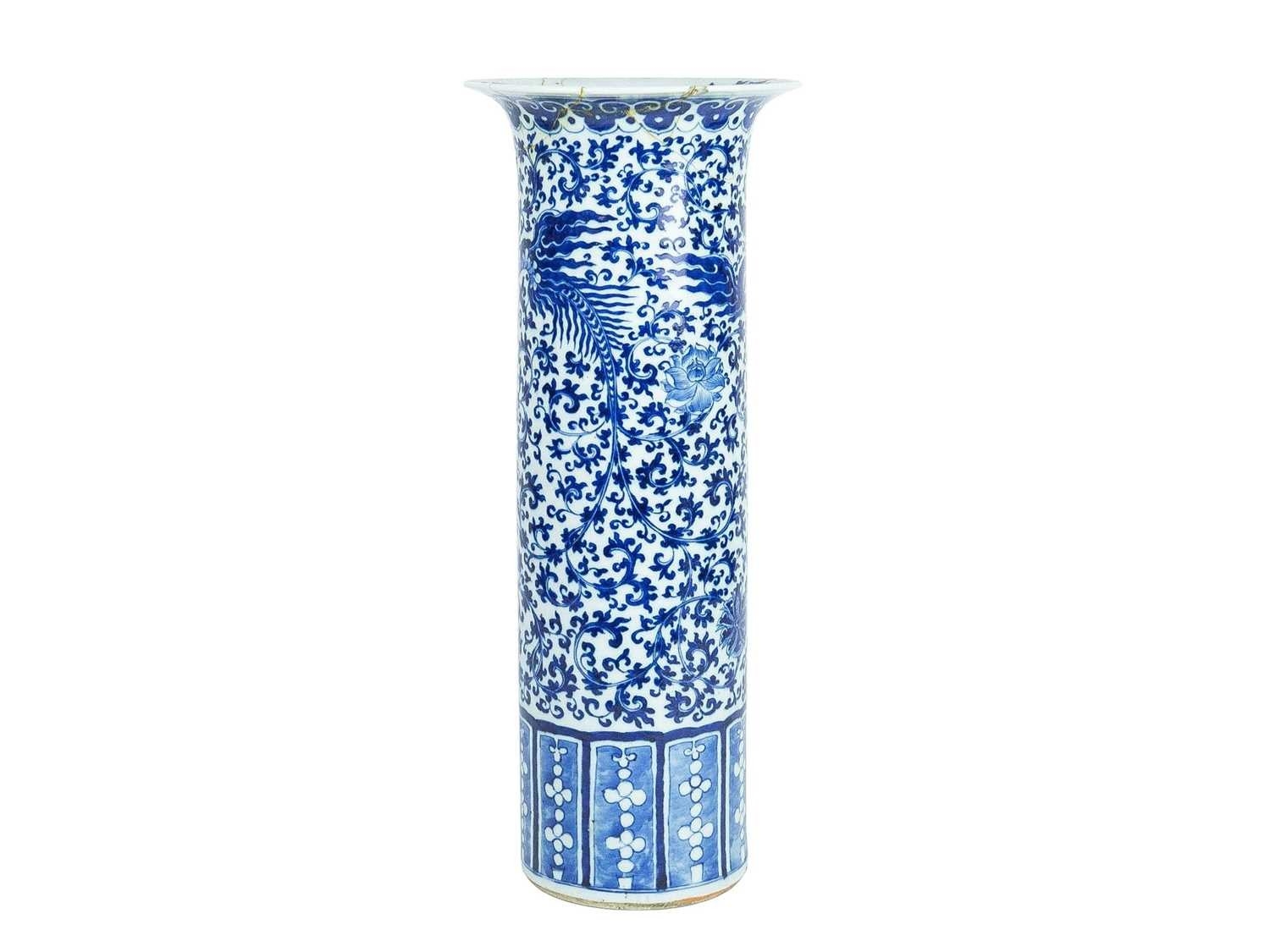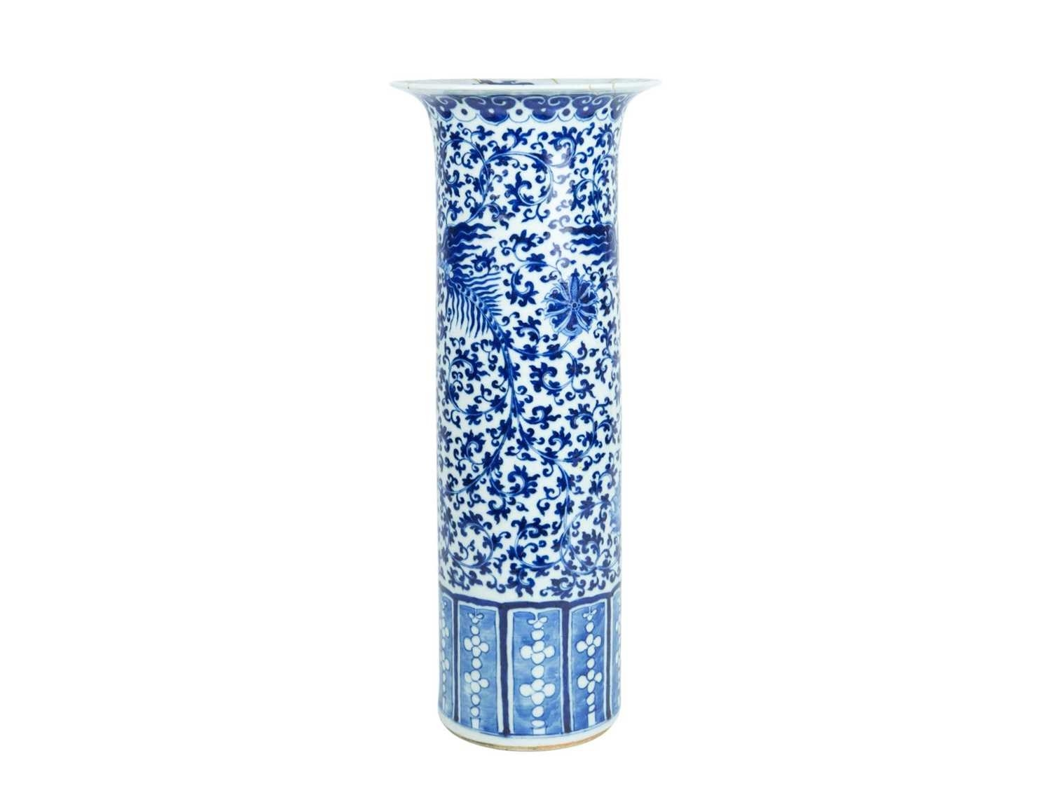 A Chinese blue and white cylinder vase. Late Qing, with a slightly everted rim, painted with dragons and scrolling foliage, height 45cm, diameter 18.5cm.