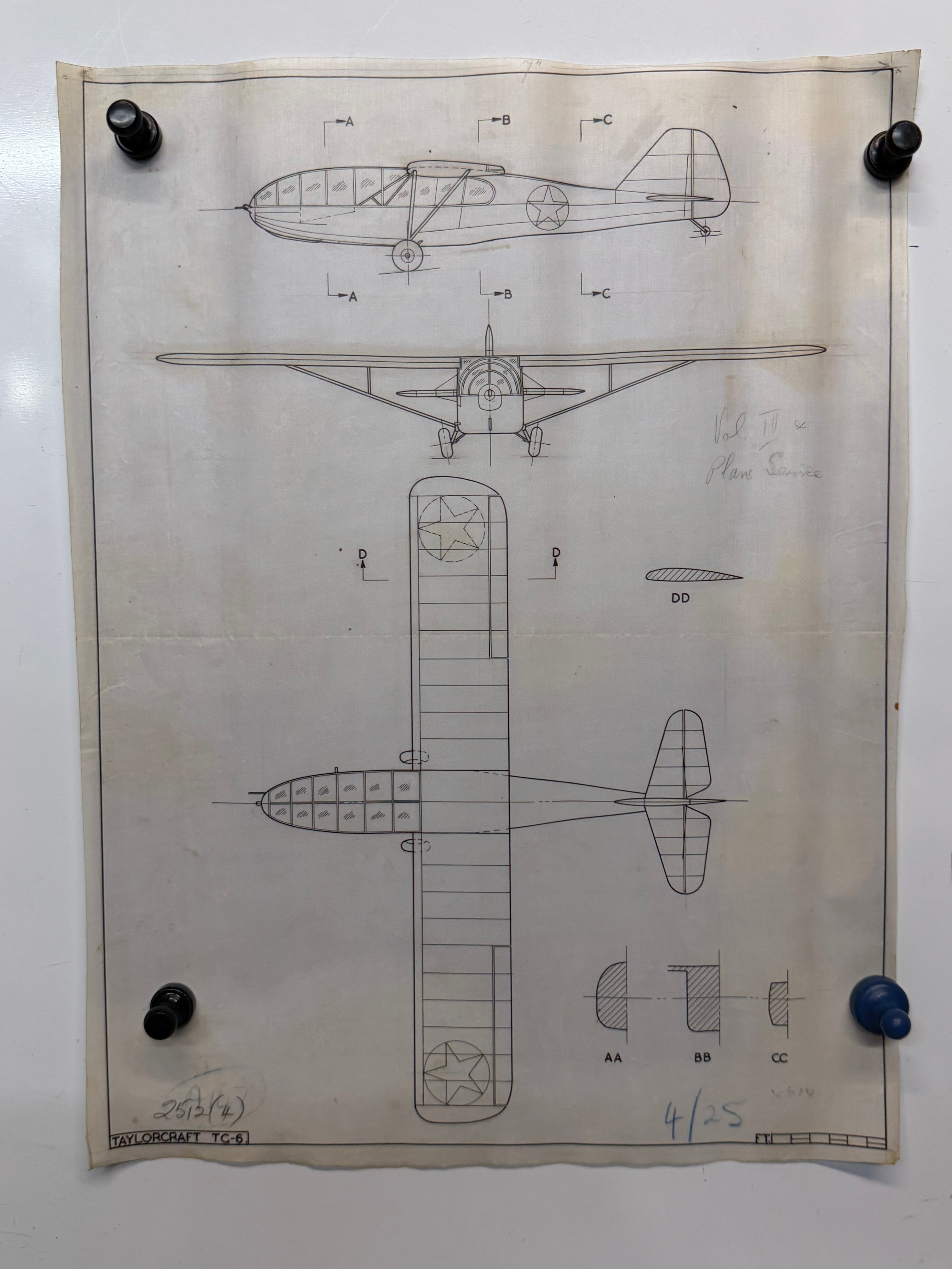 Militaria, ephemera, WWII US aircraft plans on linen, a Taylorcraft TC-5, 38 cm x 28 cm