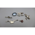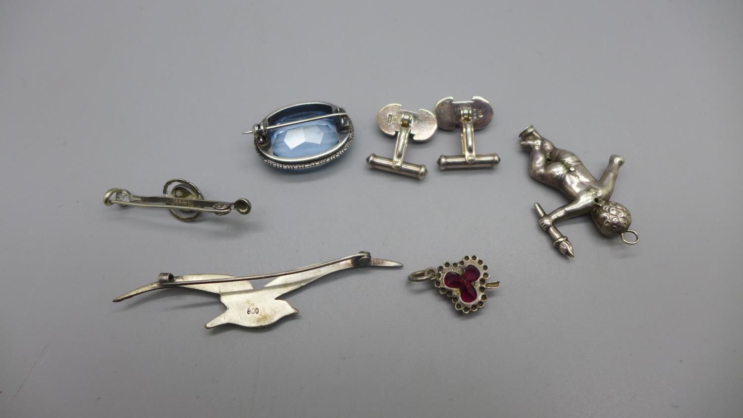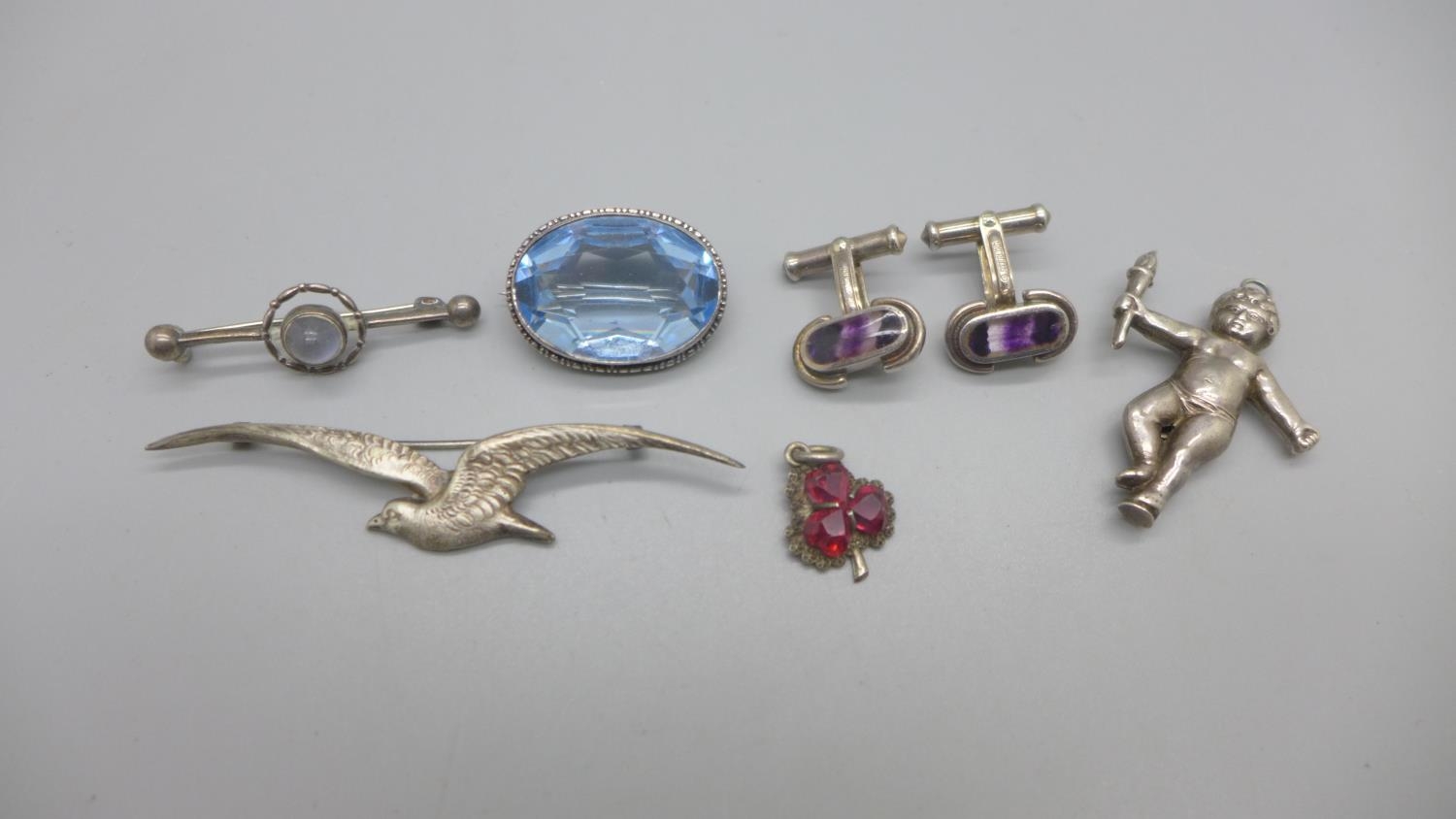 A pair of hallmarked silver and Blue John cufflinks, an 800 silver bird brooch, a silver and moonstone brooch, a blue stone set brooch and two charms