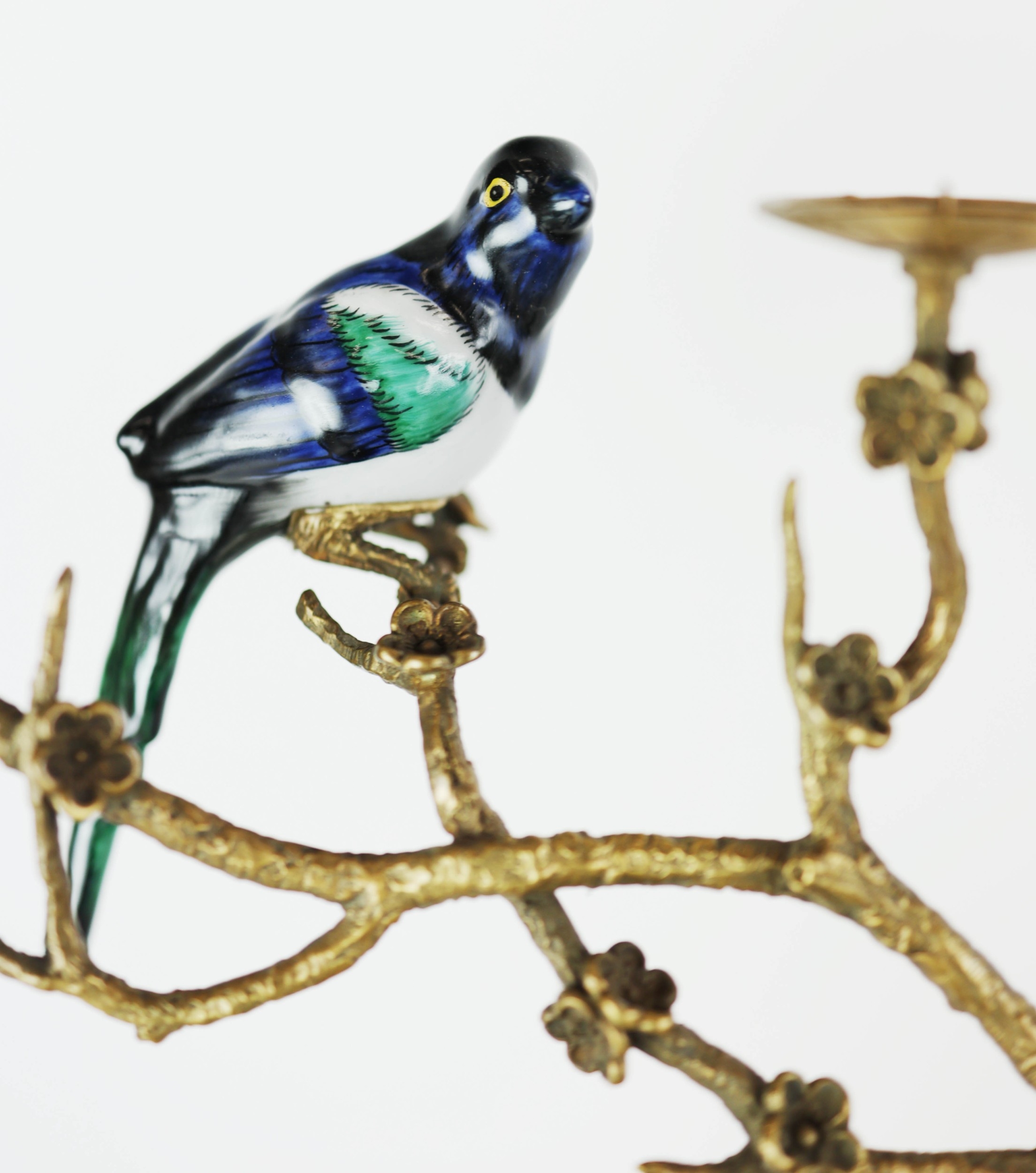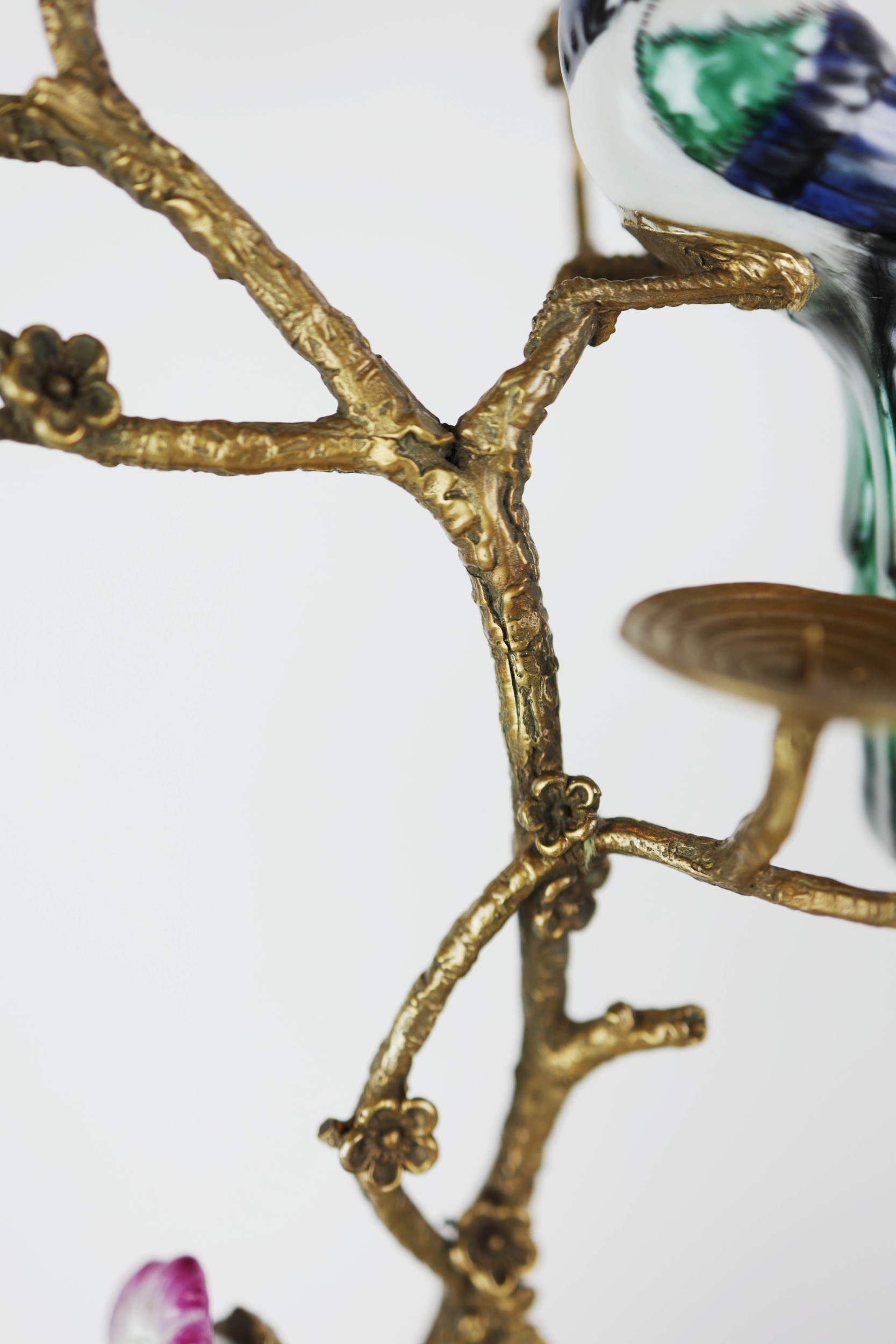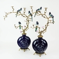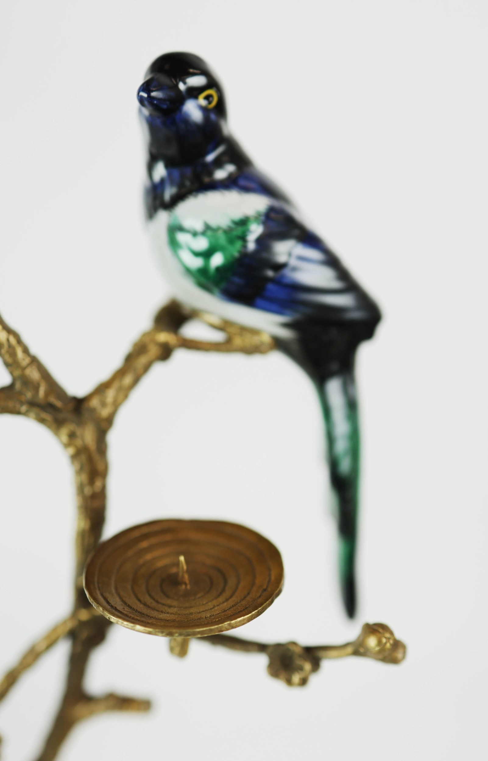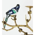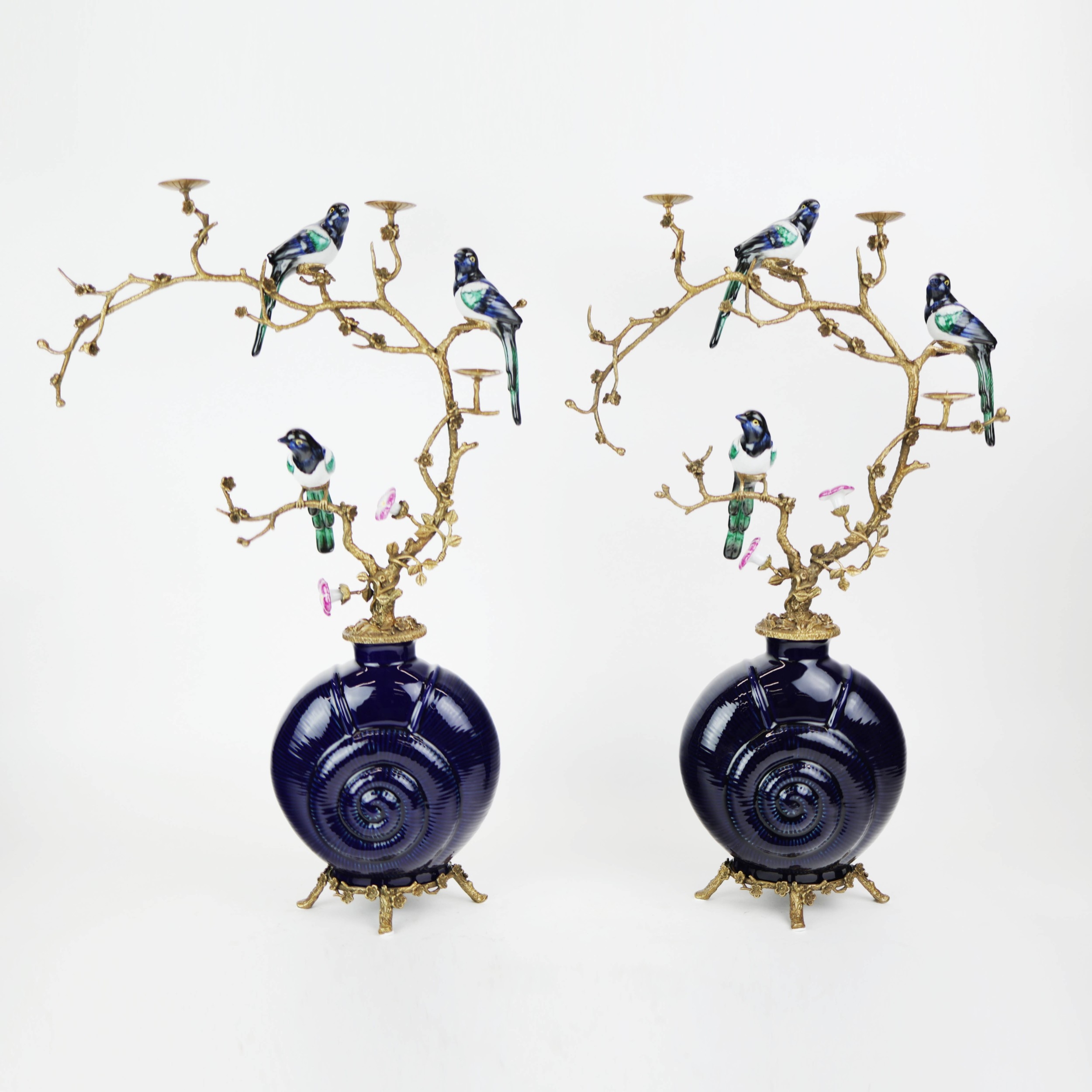 CANDELABRA, A PAIR. in the form of birds amongst trees, shell form bases, ceramic and gilt metal, 65cm H approx. (2).