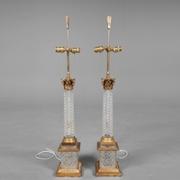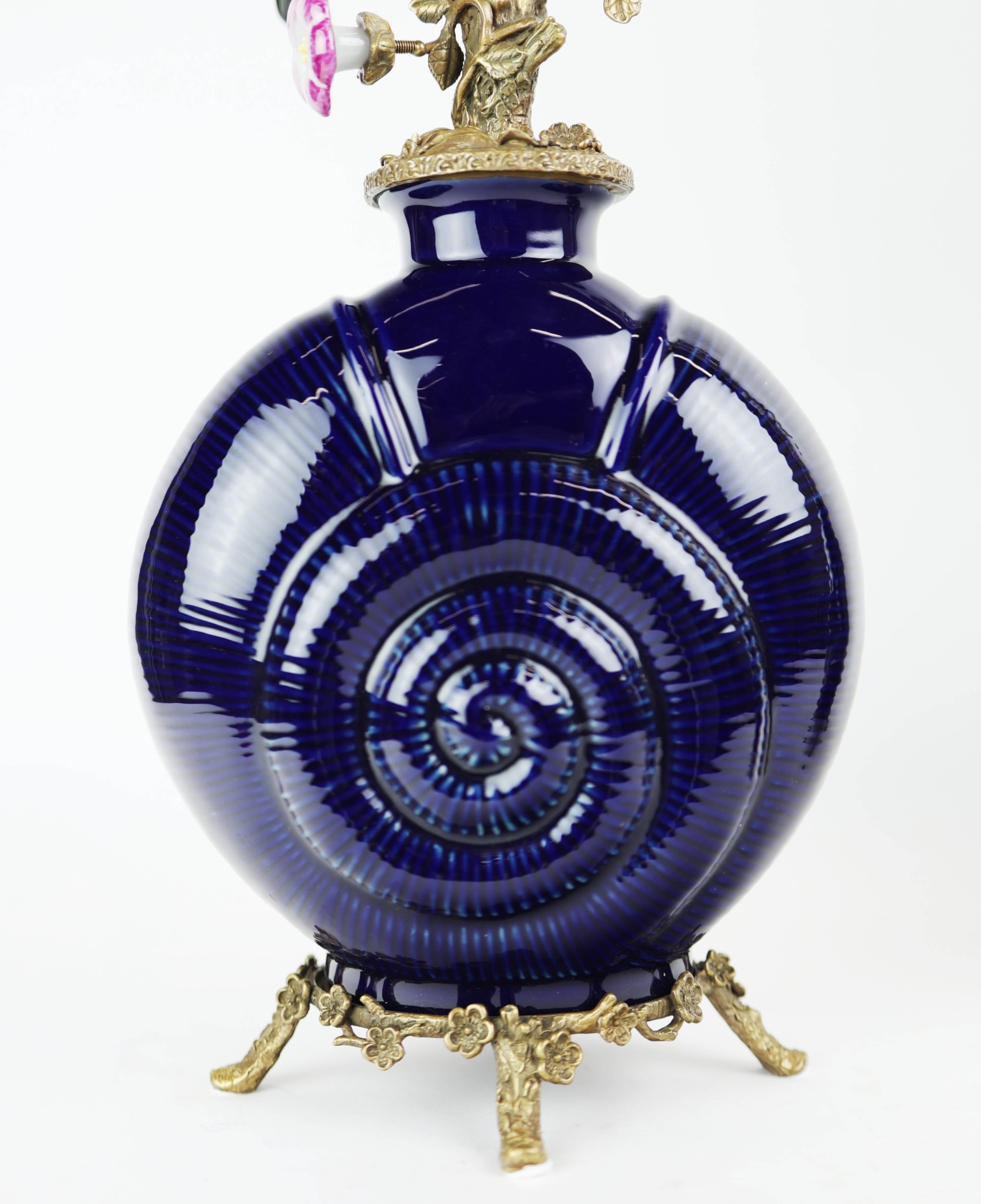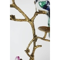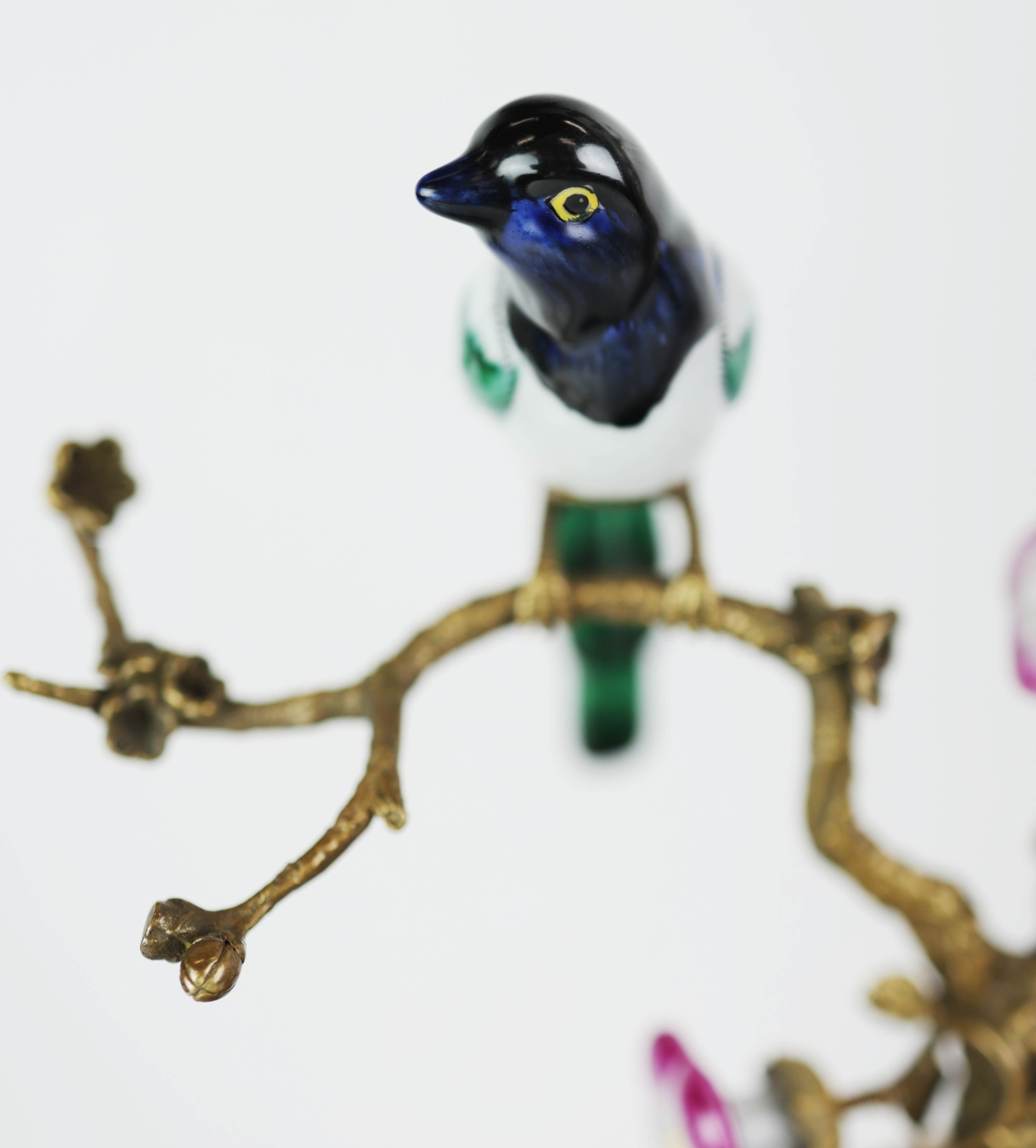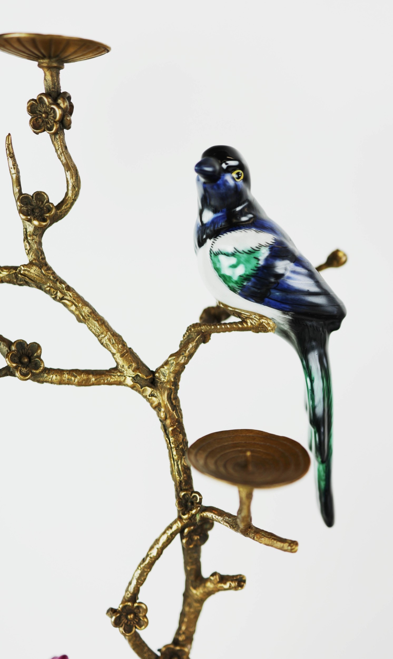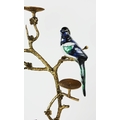 CANDELABRA, A PAIR. in the form of birds amongst trees, shell form bases, ceramic and gilt metal, 65cm H approx. (2).