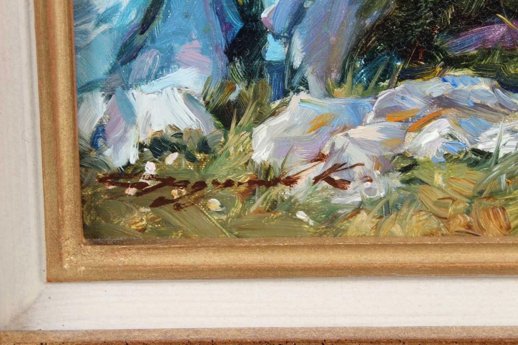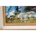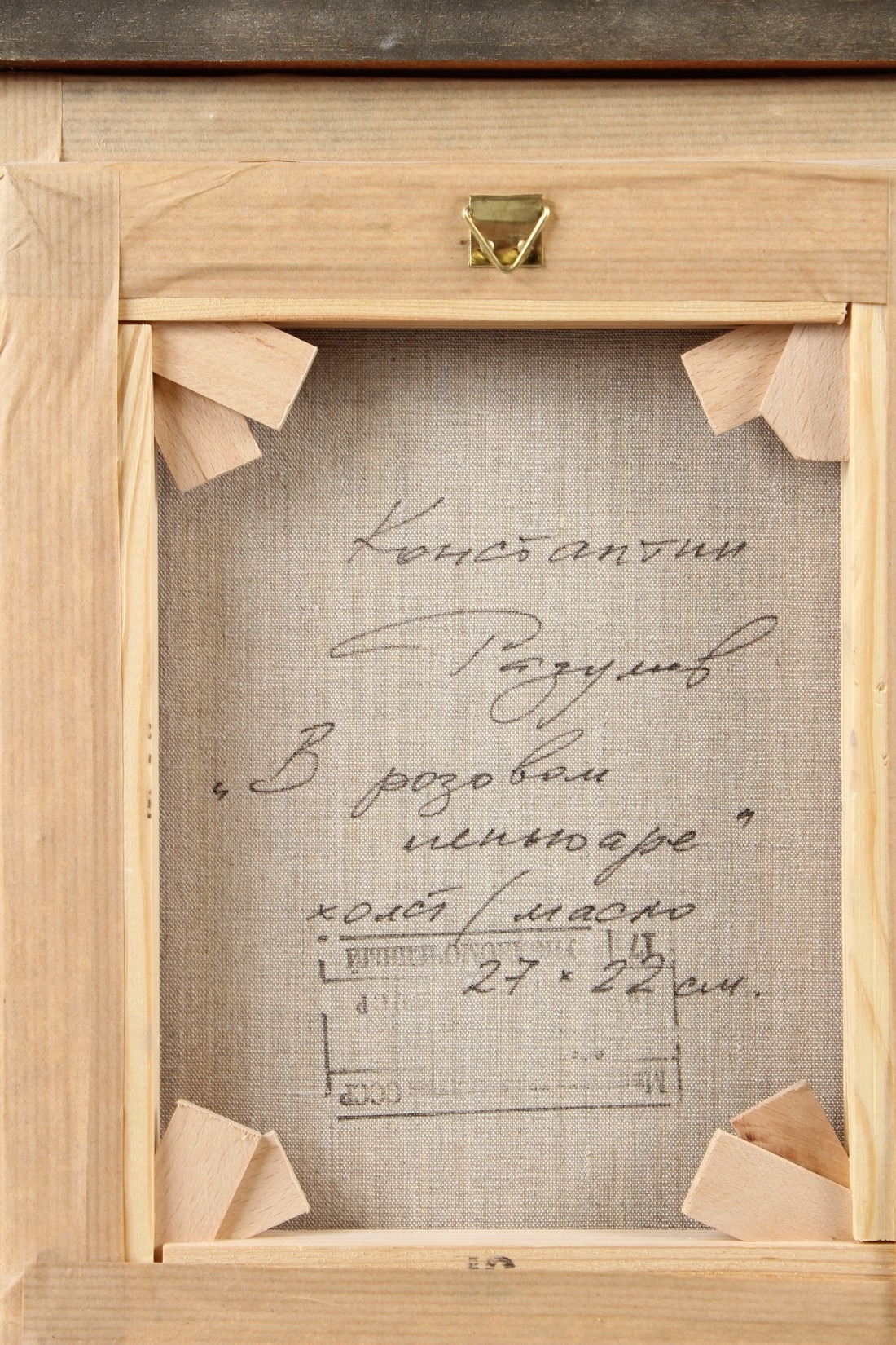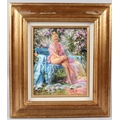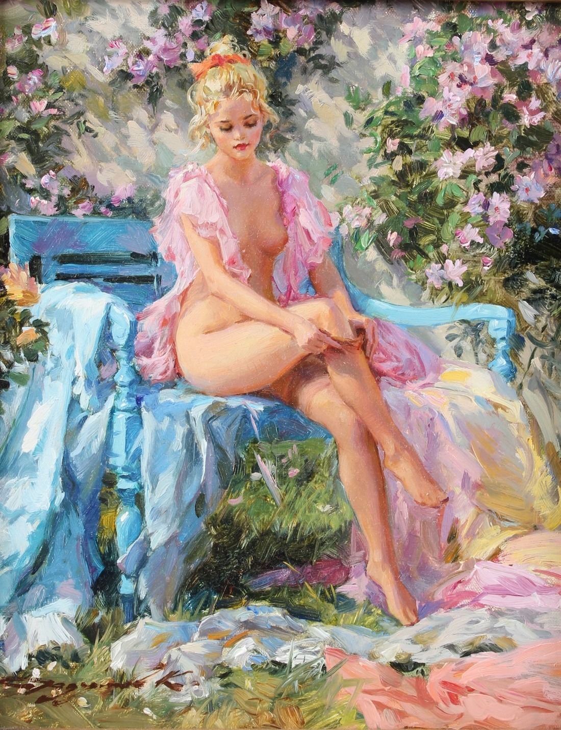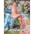 KONSTANTIN RAZUMOV (b.1974 RUSSIAN) 'May Sun' semi naked lady seated on a bench oil on canvas signed Inscribed on the reverse in Cyrillic 25.5 x 20.5cm.