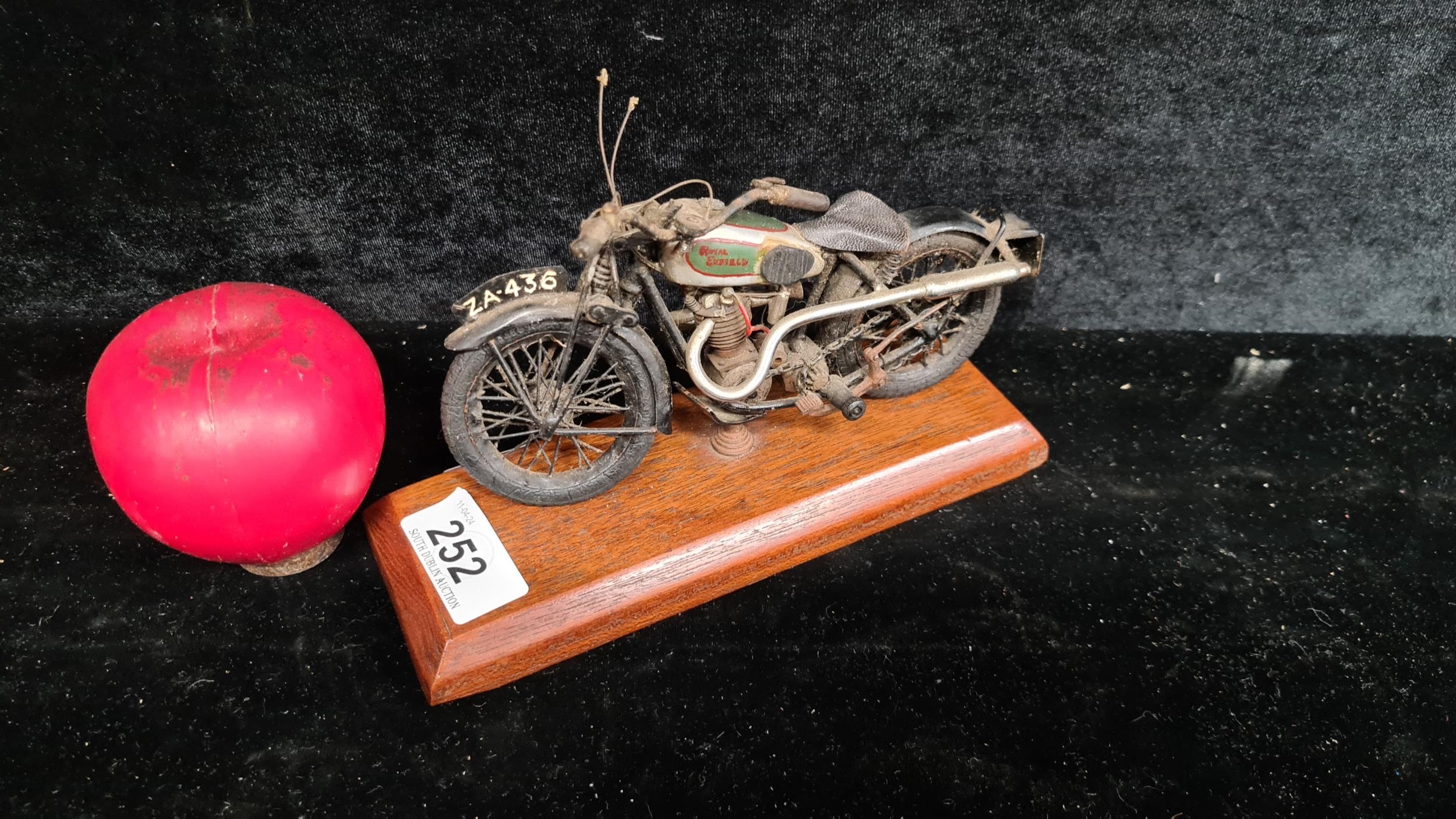 A cool model of a Royal Enfield motorcycle held onto a wooden plinth.