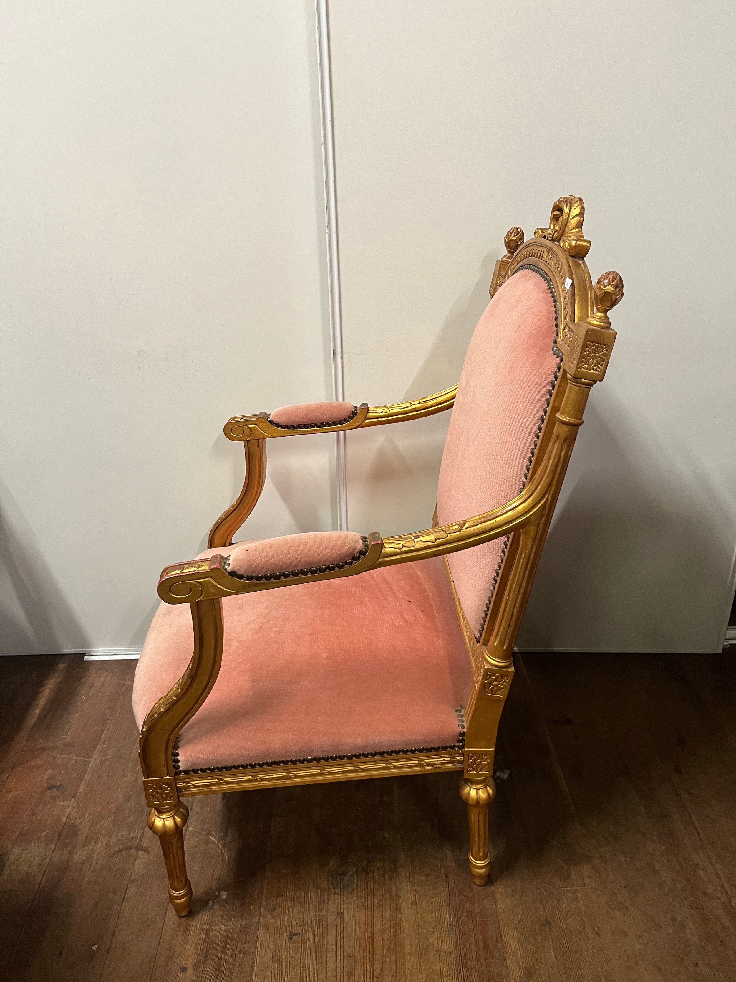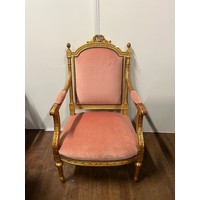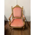 Regency Style lounge arm chair finished with gold leaf to the wood work.